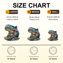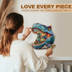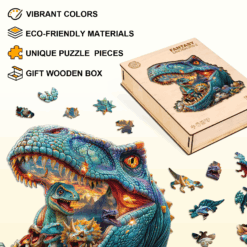 This exciting Kaayee wooden puzzle features a dramatic dinosaur scene. The central image is a massive, blue and green T-Rex head, with its mouth wide open to reveal a hidden world. Inside, a group of different dinosaurs, including a Triceratops and a Velociraptor, are gathered around a nest of eggs, set against a fiery sunset landscape. The puzzle’s unique, irregular shape outlines the entire T-Rex head and nest. This dynamic and detailed puzzle is a fantastic choice for dinosaur fans and those who enjoy a creative and challenging build.