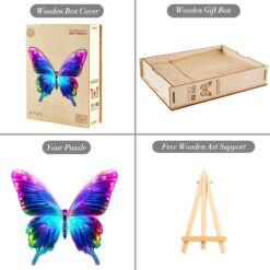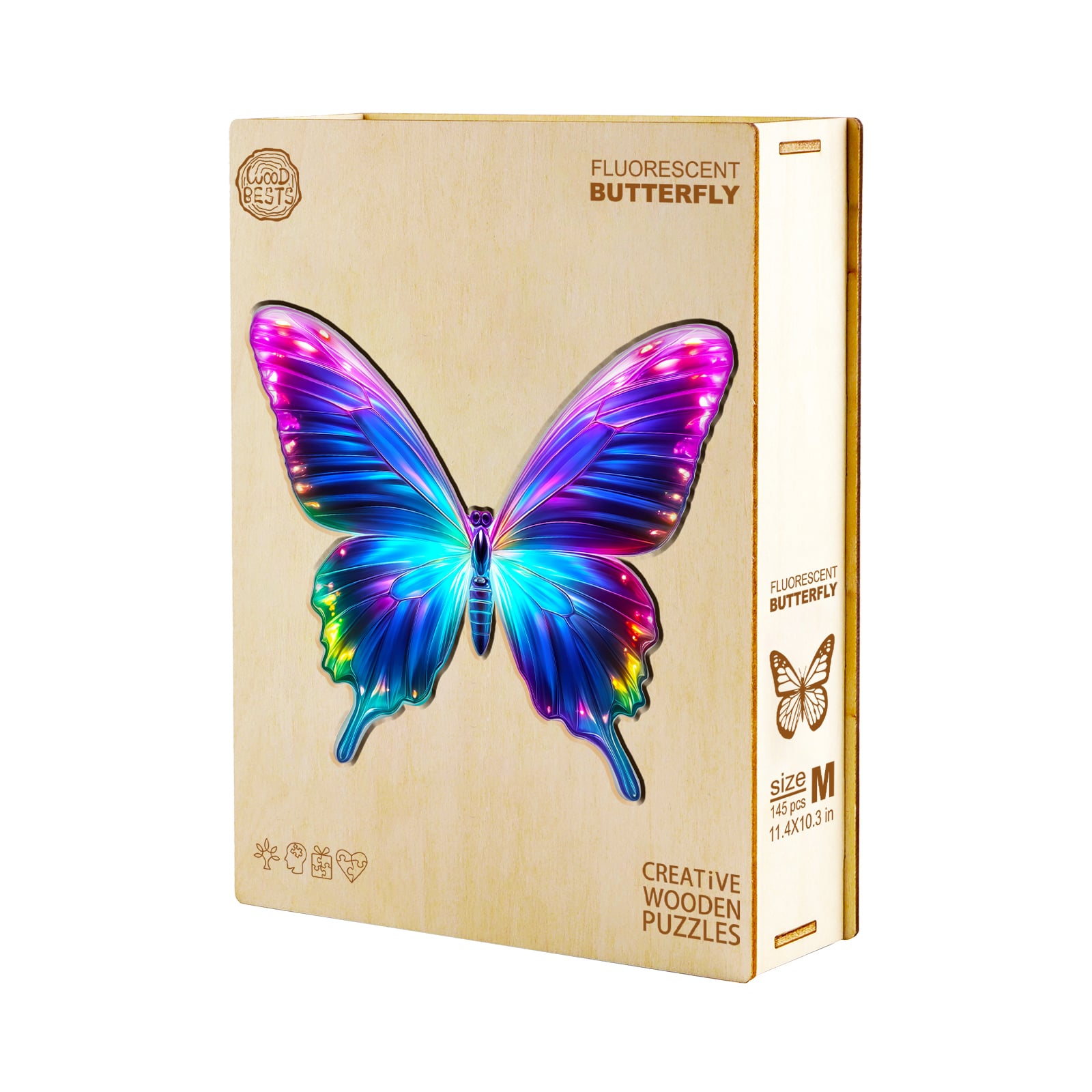 Unleash the beauty of nature with this breathtaking wooden puzzle featuring a radiant butterfly. Crafted with precision, each wooden piece fits seamlessly to form a stunning image of a luminous butterfly with iridescent wings that glow in mesmerizing shades of blue, purple, and pink. The intricate details and vibrant colors bring this elegant creature to life, making it a perfect choice for puzzle enthusiasts and art lovers alike. Whether for relaxation, a fun challenge, or as a unique decorative piece, this wooden puzzle is sure to captivate and inspire.