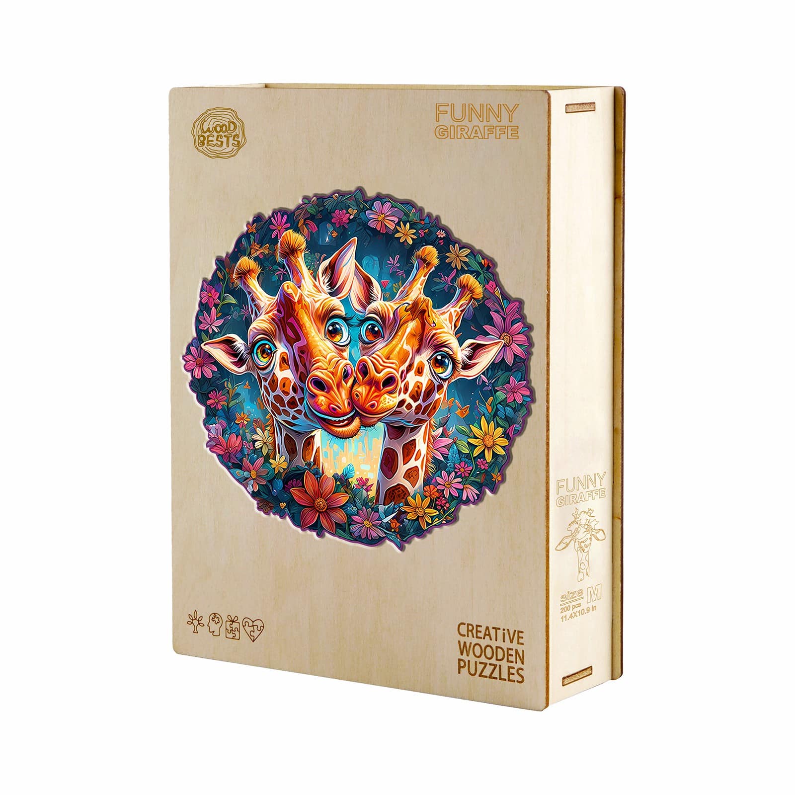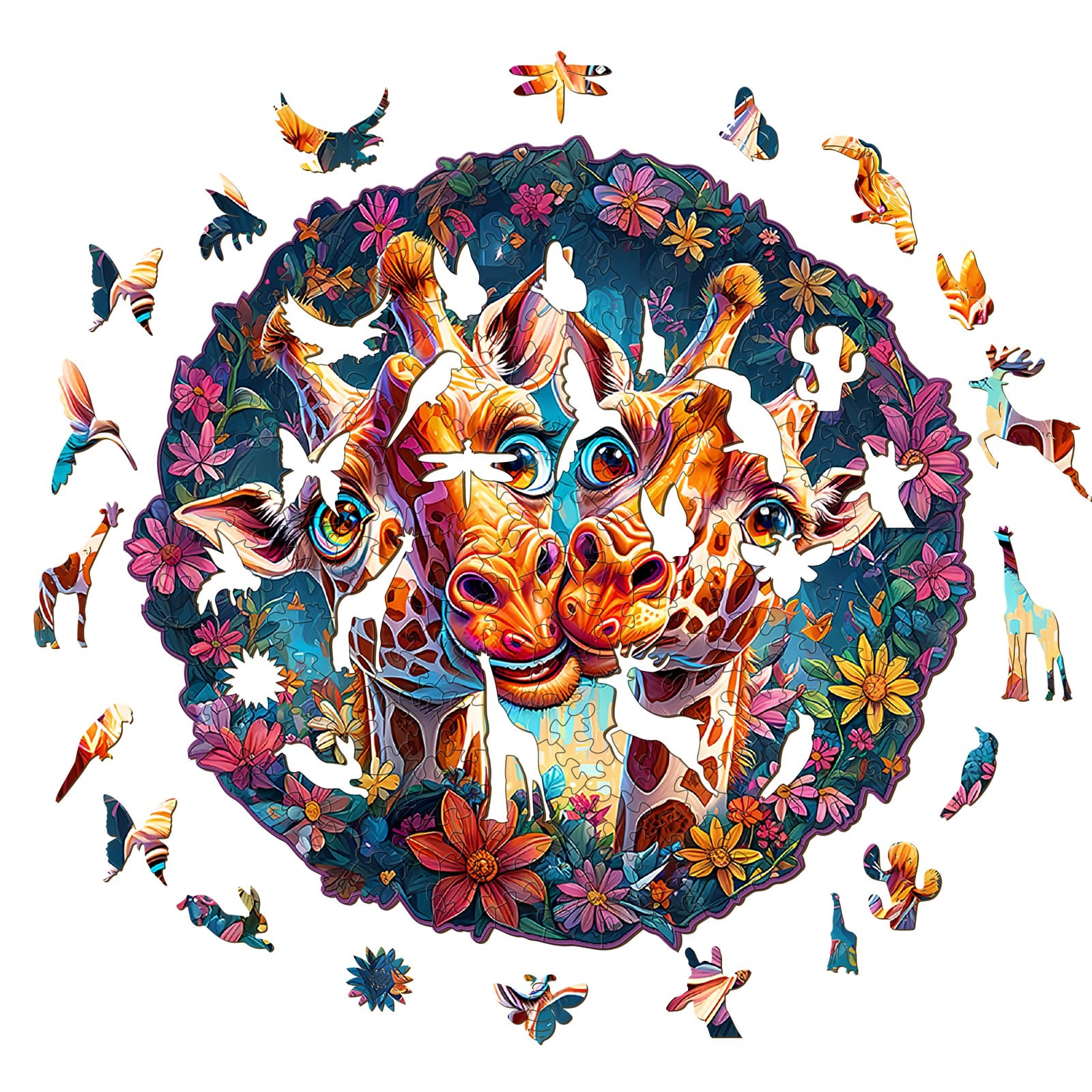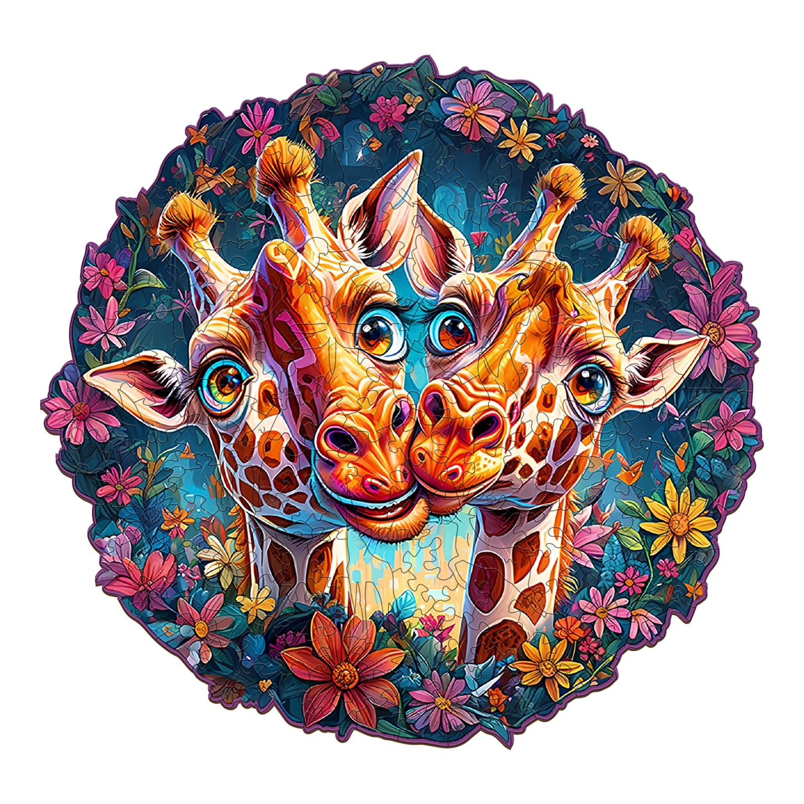The giraffe, an iconic African mammal, is instantly recognizable by its towering height, long neck, and distinctive spotted coat. Standing as the tallest land animal, giraffes can reach up to 18 feet in height, with their elongated necks comprising nearly half of their stature. These graceful creatures possess a calm demeanor, often seen leisurely browsing on the leaves of acacia trees with their prehensile tongue. This puzzle features that 2 giraffes faces together, making comical expressions, which contrasts with their calm and elegant images