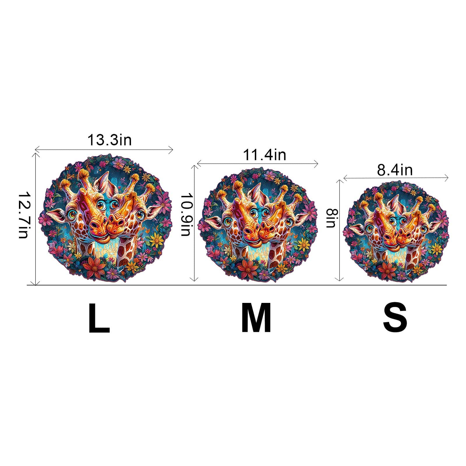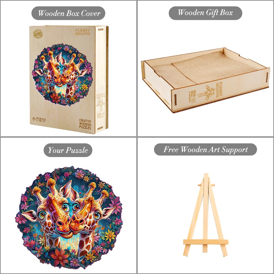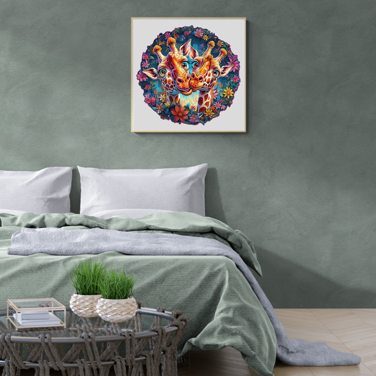The giraffe, an iconic African mammal, is instantly recognizable by its towering height, long neck, and distinctive spotted coat. Standing as the tallest land animal, giraffes can reach up to 18 feet in height, with their elongated necks comprising nearly half of their stature. These graceful creatures possess a calm demeanor, often seen leisurely browsing on the leaves of acacia trees with their prehensile tongue. This puzzle features that 2 giraffes faces together, making comical expressions, which contrasts with their calm and elegant images