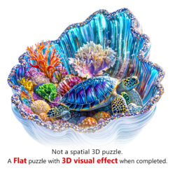 Dive into a vibrant underwater world with our Ocean Treasure Wooden Puzzle, featuring a stunning sea turtle nestled among colorful coral reefs inside a shimmering seashell. This intricately designed puzzle captures the beauty of marine life with vivid colors, flowing lines, and detailed textures that mimic the natural brilliance of the ocean.