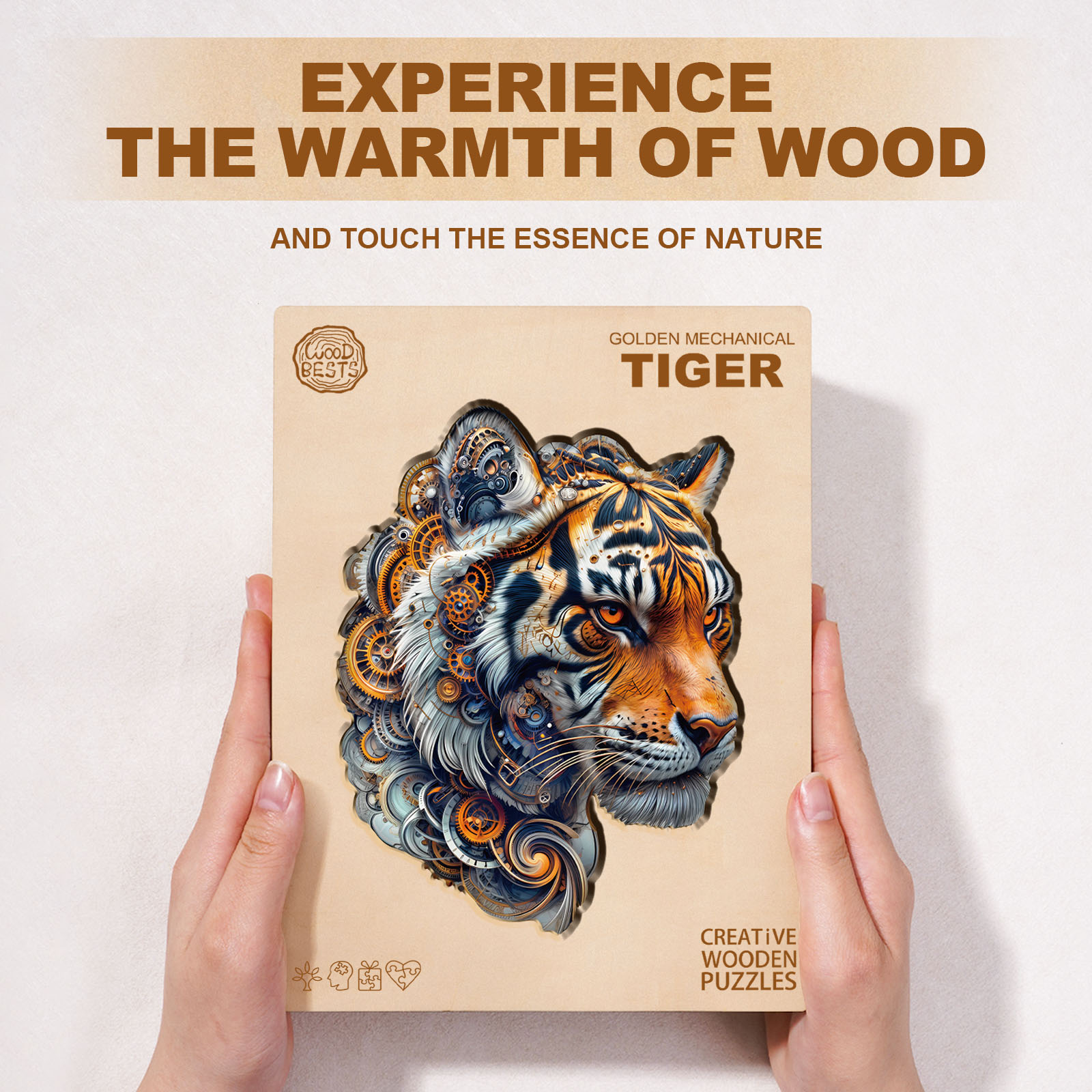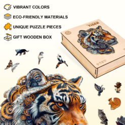 This extraordinary Kaayee wooden puzzle features a mesmerizing tiger head. The design masterfully blends the majestic natural form of the tiger with intricate, steampunk-inspired mechanical details. One half of the tiger’s face is rendered in realistic orange and black stripes, while the other side is a complex arrangement of gears, cogs, and metallic clockwork. The puzzle’s unique, irregular shape outlines the tiger’s head, making it a challenging and artistic piece. It’s a perfect choice for puzzle enthusiasts who appreciate a blend of wildlife art and creative, mechanical aesthetics.