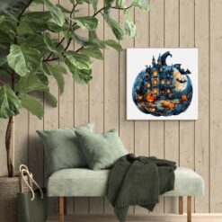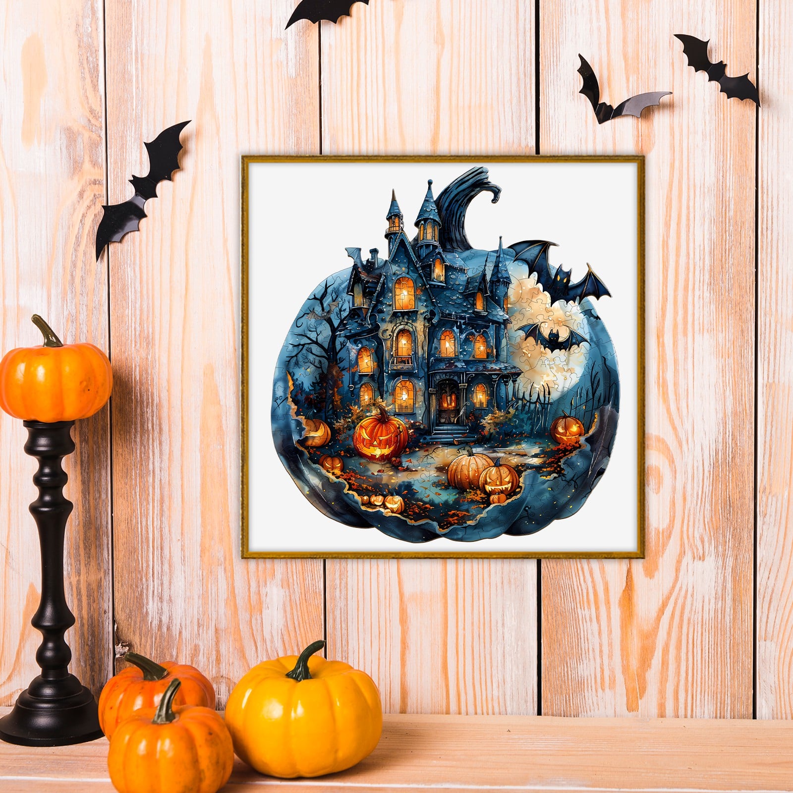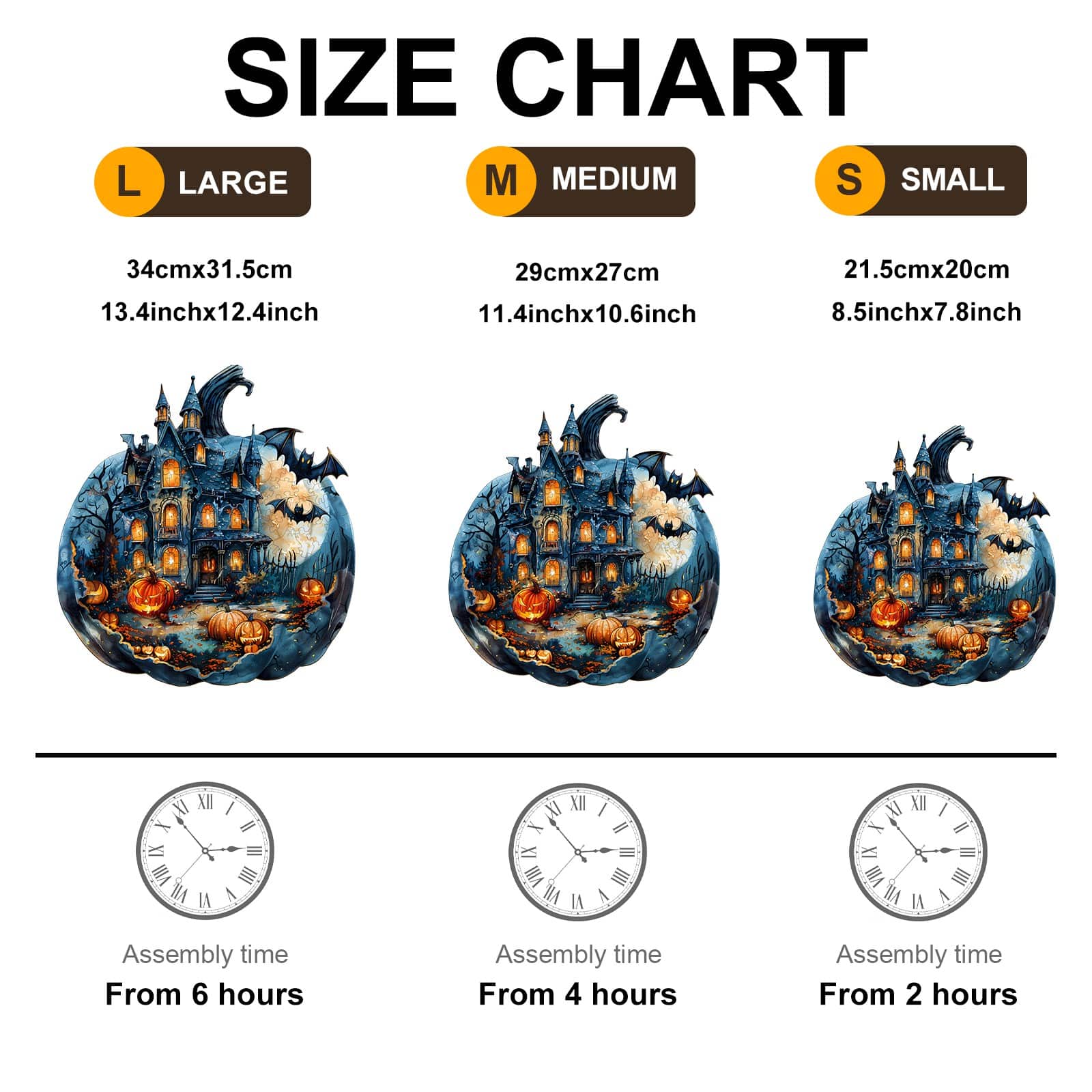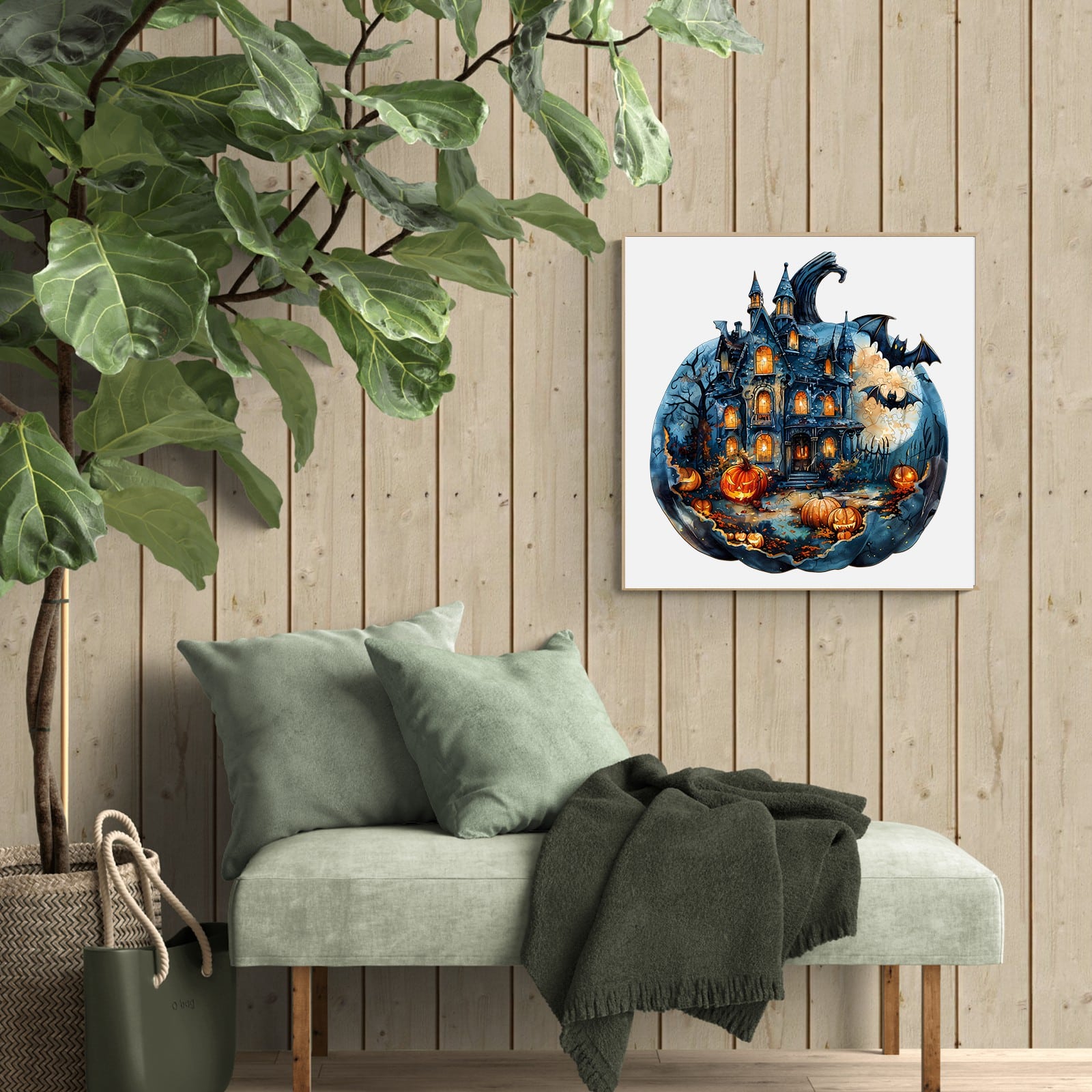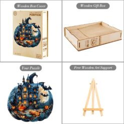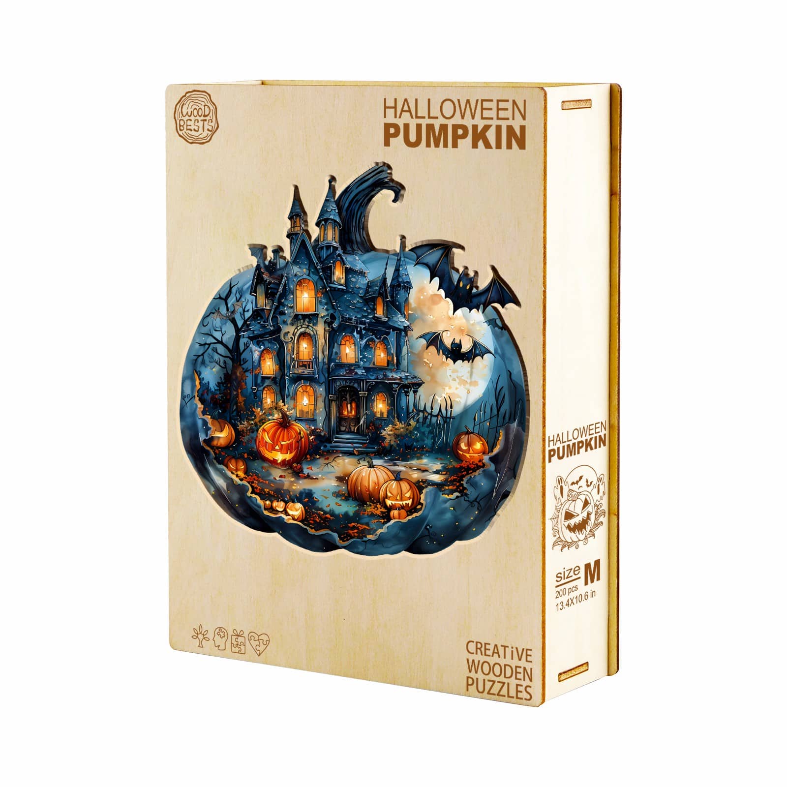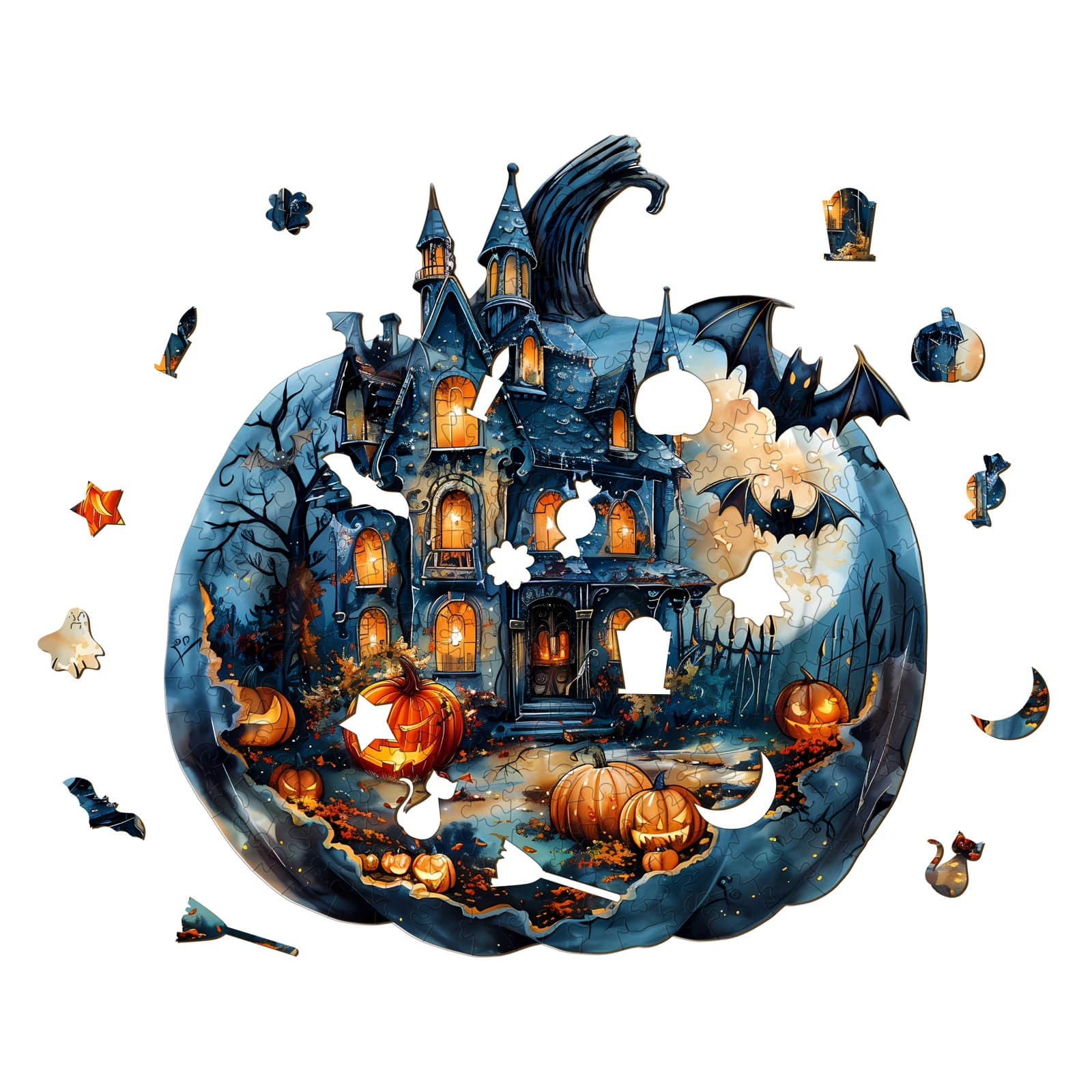 The Halloween Pumpkin puzzle showcases a spooky and magical scene embedded within the shape of a giant pumpkin. At its heart is a gothic-style haunted mansion, glowing with warm lights from its many windows, contrasting with the eerie surroundings. Numerous jack-o’-lanterns line the pathway, their carved faces flickering ominously. A bat flies across the cloudy, moonlit sky, enhancing the atmosphere of mystery and enchantment. Bare trees with twisting branches surround the mansion, while autumn leaves scatter the ground. The overall mood is both haunting and inviting, embodying the essence of Halloween night with its blend of warmth and spookiness