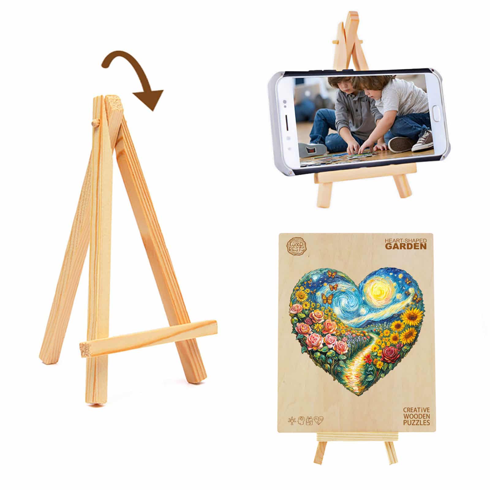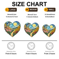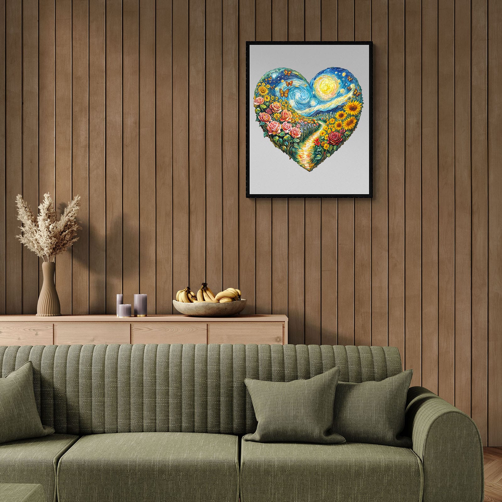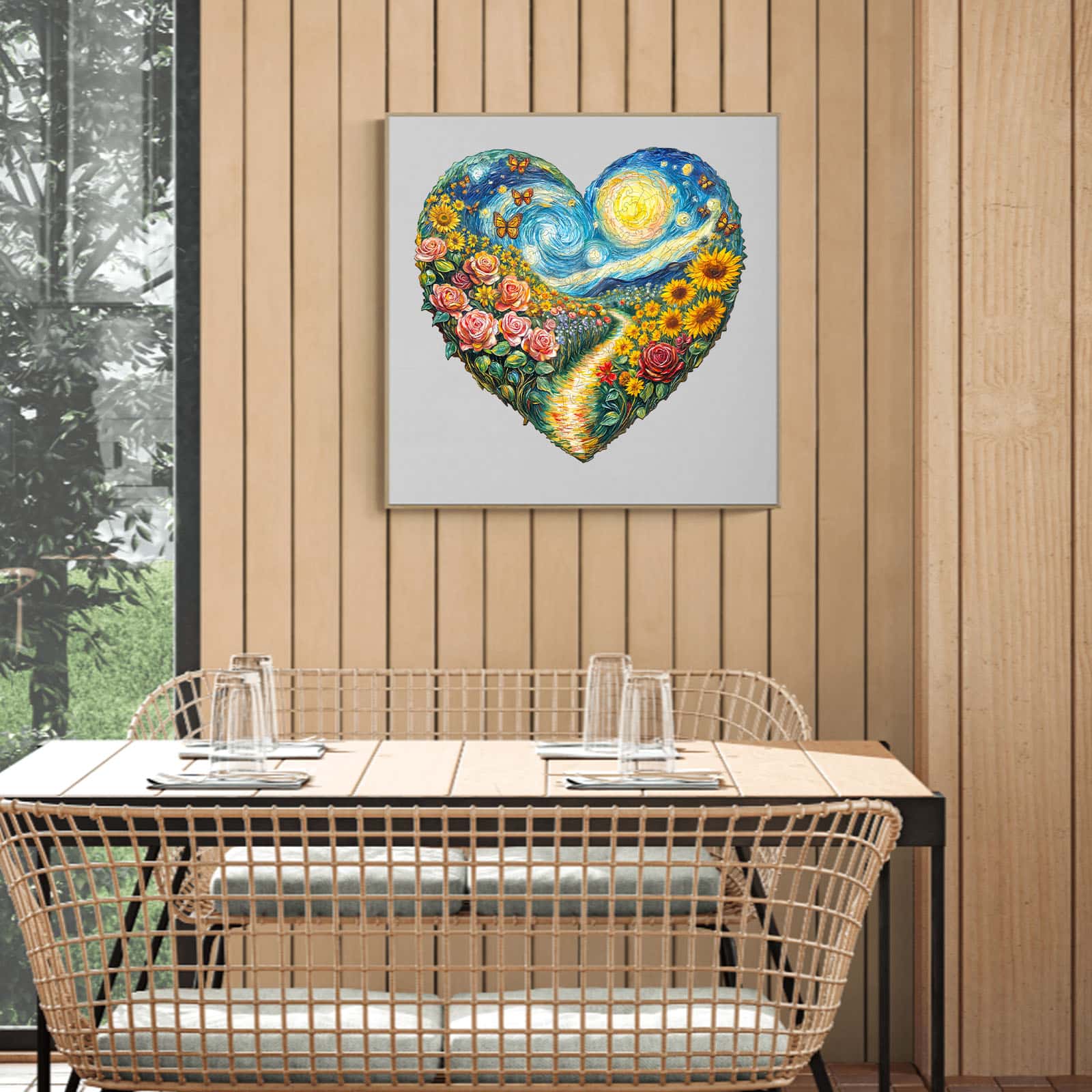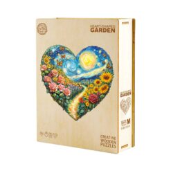 This wooden jigsaw puzzle presents a stunning heart-shaped landscape, where vibrant flowers, including roses and sunflowers, line a peaceful path leading towards a starry sky. The swirling patterns of the sky evoke a sense of movement and magic, while butterflies flutter among the flowers, enhancing the tranquil, dreamlike atmosphere. Crafted from high-quality wood, the puzzle pieces fit together smoothly, providing a satisfying and immersive challenge. Once completed, this puzzle transforms into a beautiful work of art, perfect for those who appreciate nature, art, and the joy of puzzling. It’s a wonderful addition to any home, capturing the serenity and beauty of the natural world.