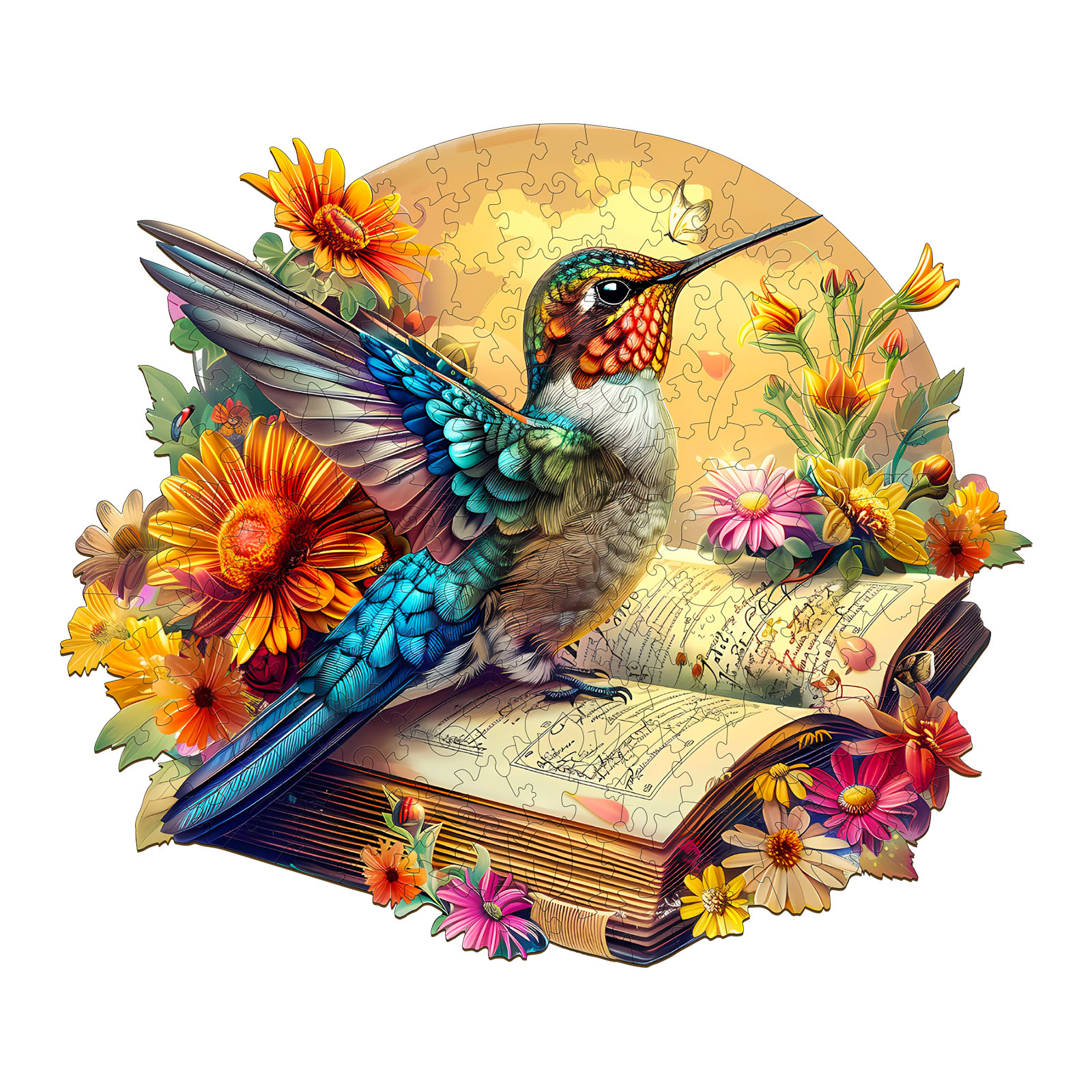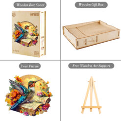 Discover the beauty of nature and storytelling with this exquisite Kaayee wooden puzzle, featuring a vibrant hummingbird perched on an open book, surrounded by blooming flowers. Crafted with precision-cut wooden pieces, this puzzle combines artistry and challenge in a delightful round design. Every piece fits perfectly, forming a vivid scene full of color, life, and wonder.
