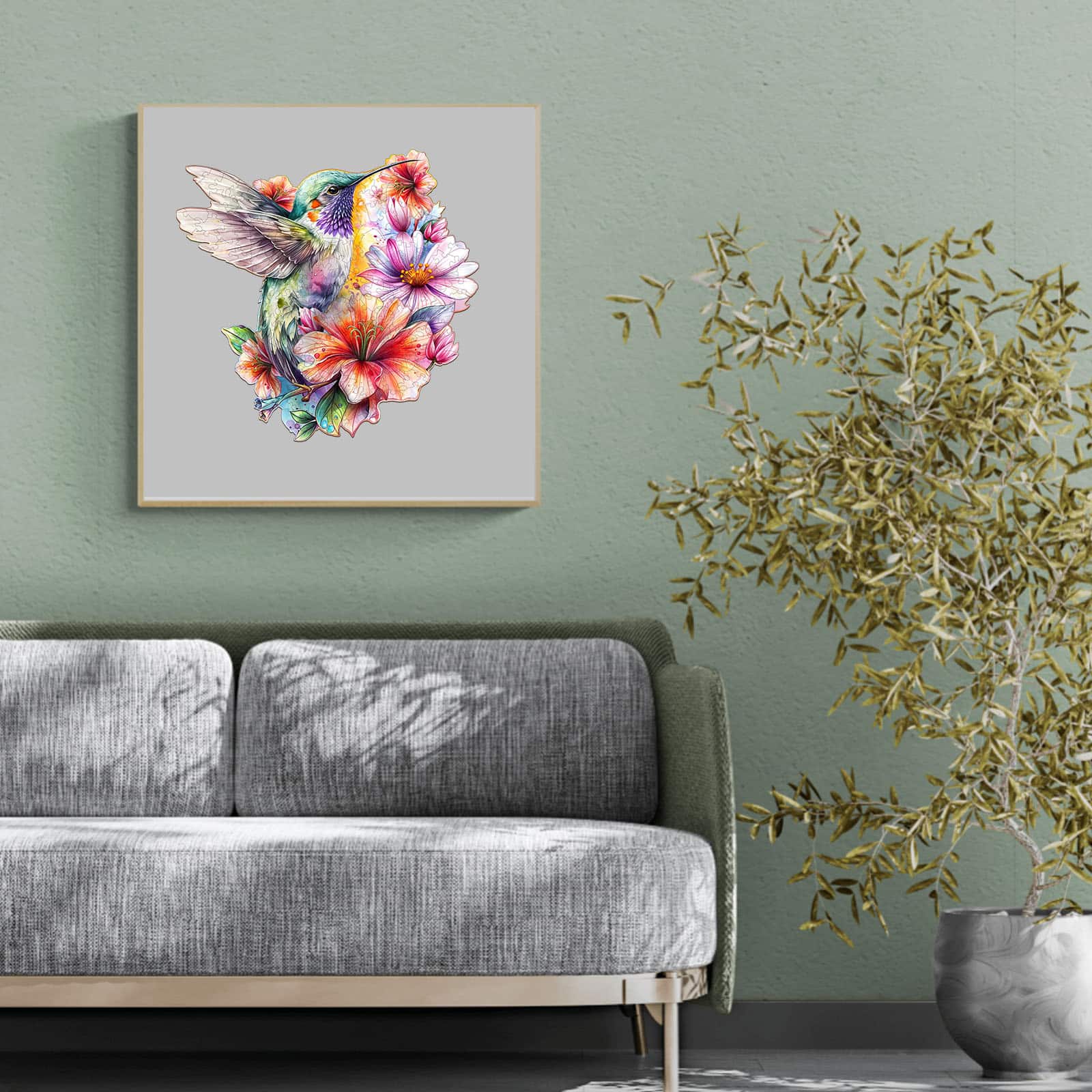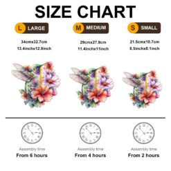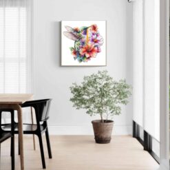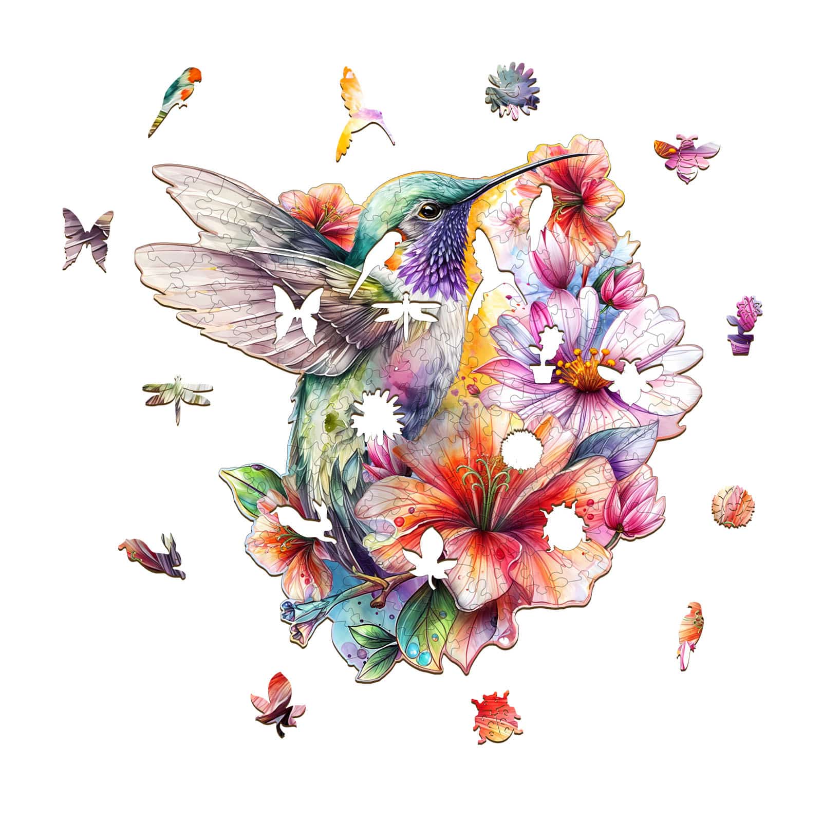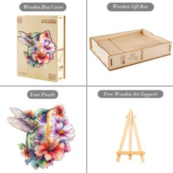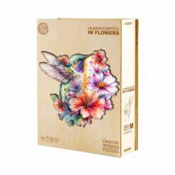 This puzzle features a beautifully illustrated hummingbird surrounded by vibrant flowers in full bloom. The bird, detailed with soft yet striking pastel shades of green, purple, and blue, hovers gracefully in mid-air. Its wings are outstretched, delicately transparent with fine details, complementing the vibrant flowers that fill the background. The flowers range in colors from bright pinks and oranges to subtle shades of purple and blue, creating a lively and harmonious scene. The overall style is whimsical and artistic, evoking a sense of joy and natural beauty
