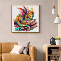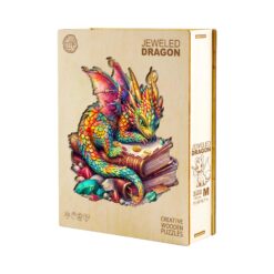 The Jeweled Dragon lay curled atop the ancient, leather-bound book, its scales glistening like precious gemstones in the soft light. Each breath it took caused the book’s worn pages to flutter gently, as if whispering secrets from centuries past. The dragon’s vivid emerald eyes were closed, its long, serpentine body coiled protectively around the tome, its iridescent wings folded neatly against its sides. Tiny sparks of light danced around its glittering form, casting a mesmerizing glow across the room. Despite its small size, the Jeweled Dragon exuded an aura of profound magic and timeless wisdom, guarding the book’s hidden knowledge in peaceful slumber