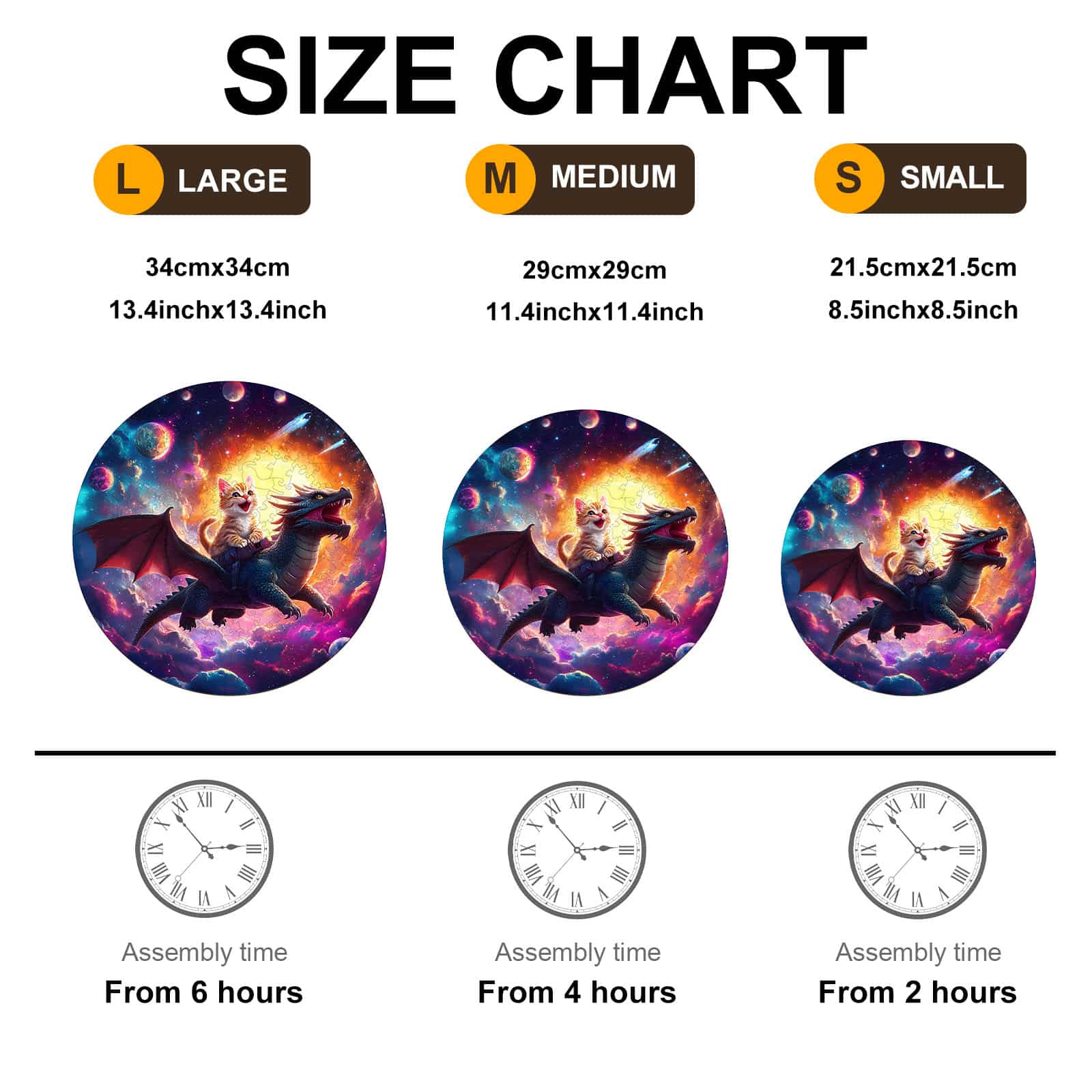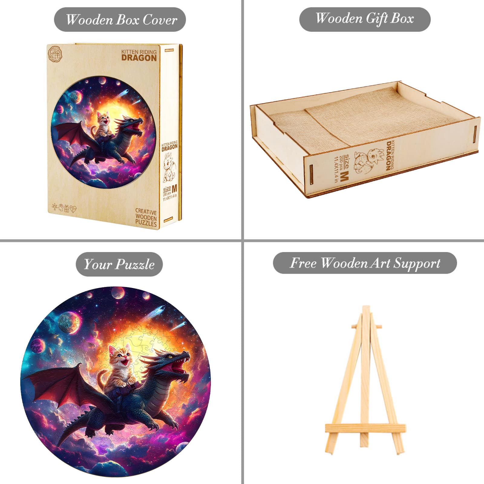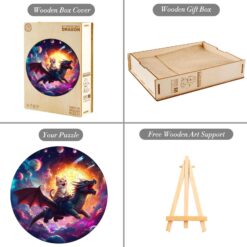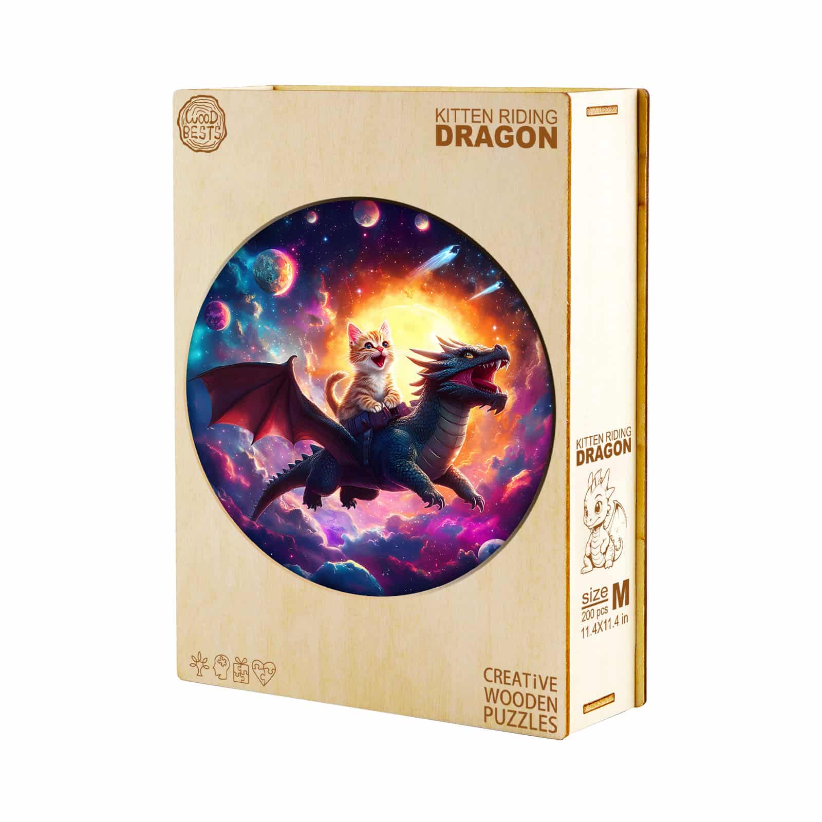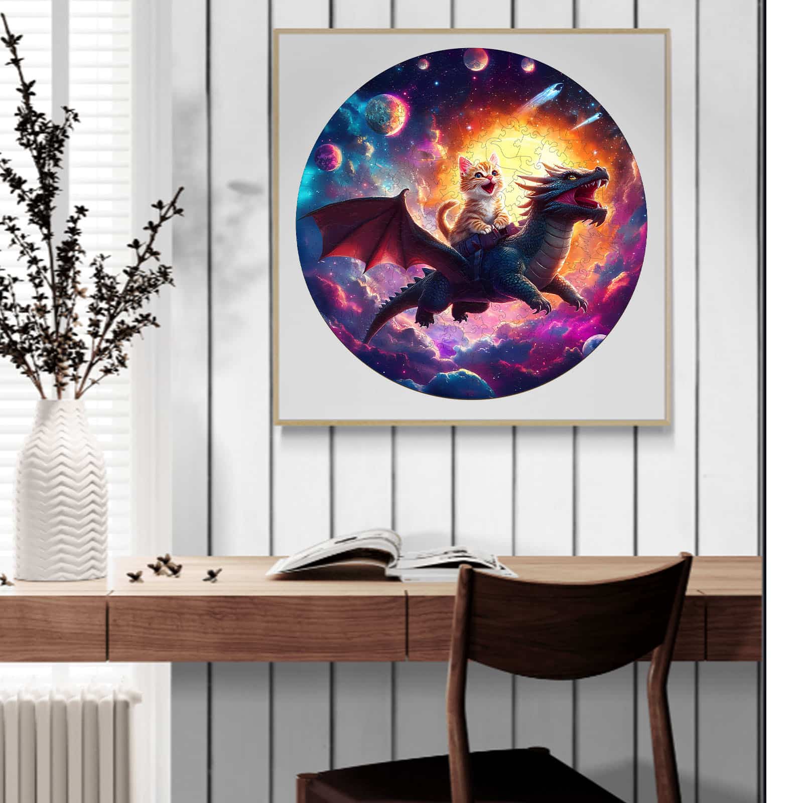 Embark on an intergalactic adventure with this whimsical wooden puzzle featuring a fearless kitten riding a mighty dragon through the cosmos! With vibrant galaxies, glowing planets, and streaking comets in the background, this puzzle captures the magic of fantasy and space exploration. Each precisely cut wooden piece fits together seamlessly, providing a satisfying and engaging experience for puzzle enthusiasts. Perfect for those who love dragons, cats, or imaginative storytelling, this unique puzzle makes a fantastic gift and an eye-catching display piece once completed!