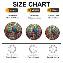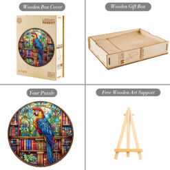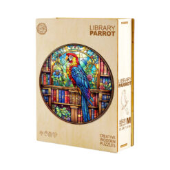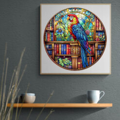 This stunning Kaayee wooden puzzle features a vibrant macaw perched amidst a whimsical library setting, all rendered in the beautiful style of stained glass. The intricate design showcases a colorful parrot with brilliant red, yellow, and blue plumage, standing out against a backdrop of richly detailed bookshelves filled with classic tomes. Above, a magnificent stained-glass window bathes the scene in an array of hues, depicting lush foliage and blooming flowers that intertwine with the architectural elements. This circular puzzle promises a delightful and challenging experience, perfect for those who appreciate both natural beauty and artistic craftsmanship. It’s an ideal gift for puzzle enthusiasts, bird lovers, and anyone who enjoys bringing a touch of vibrant artistry into their home.