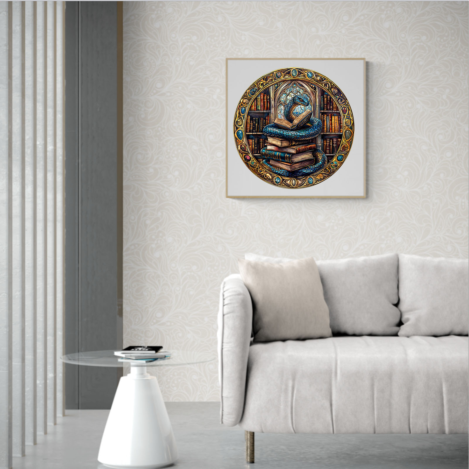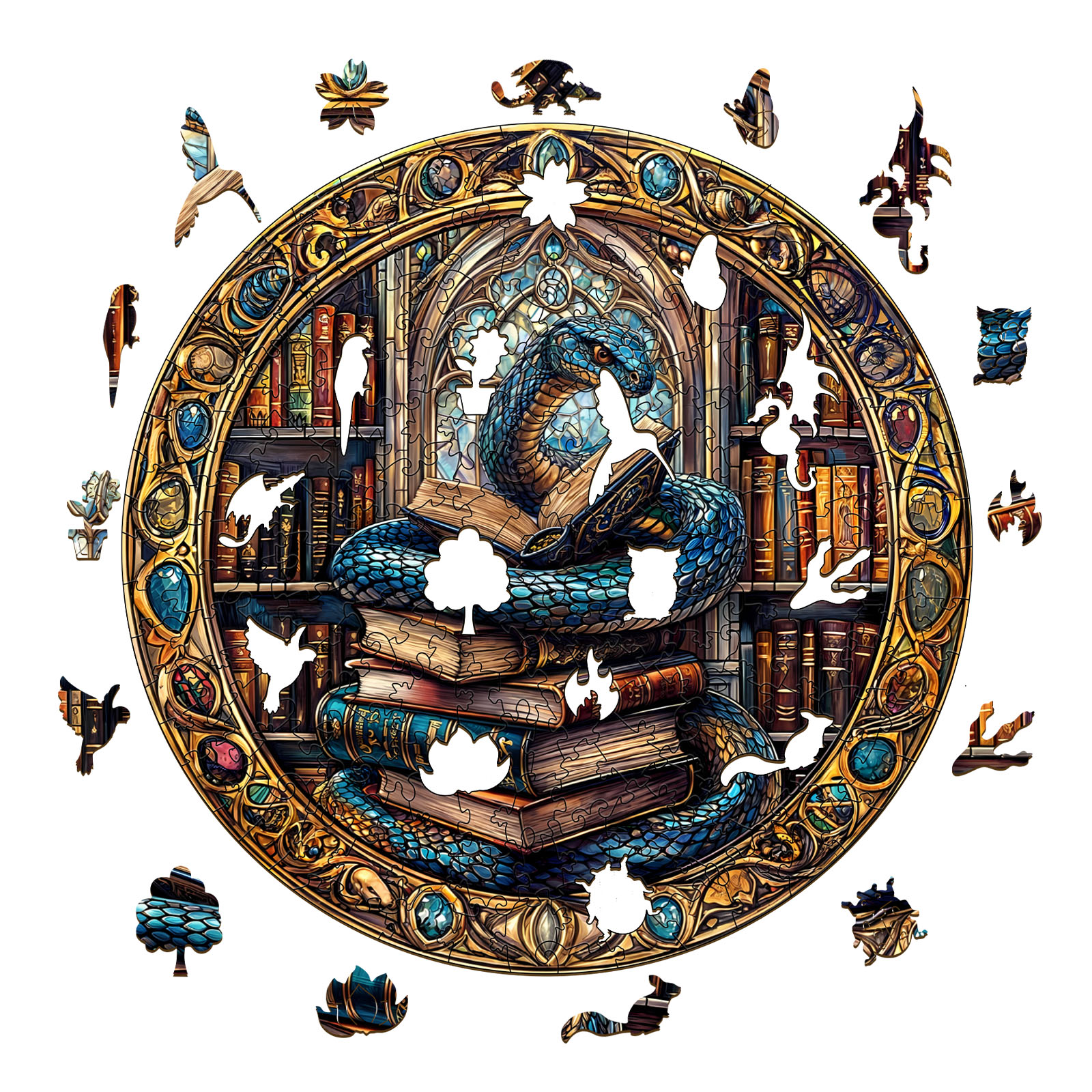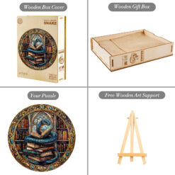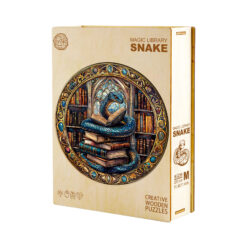 Enter a world of ancient knowledge and mystical secrets with Kaayee’s round wooden puzzle, showcasing a majestic blue serpent coiled around a tower of old books within a grand, cathedral-like library. Surrounded by glowing tomes, stained glass, and intricate gemstone-like frame details, this artwork evokes a sense of fantasy, wisdom, and wonder.Crafted with precision-cut, eco-friendly wood, this puzzle delivers a satisfying tactile experience and stunning visual appeal. Perfect for fantasy lovers, bookworms, and collectors alike, this design invites you into an enchanted world where learning is power—and the guardian is a serpent.