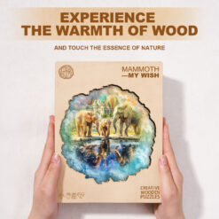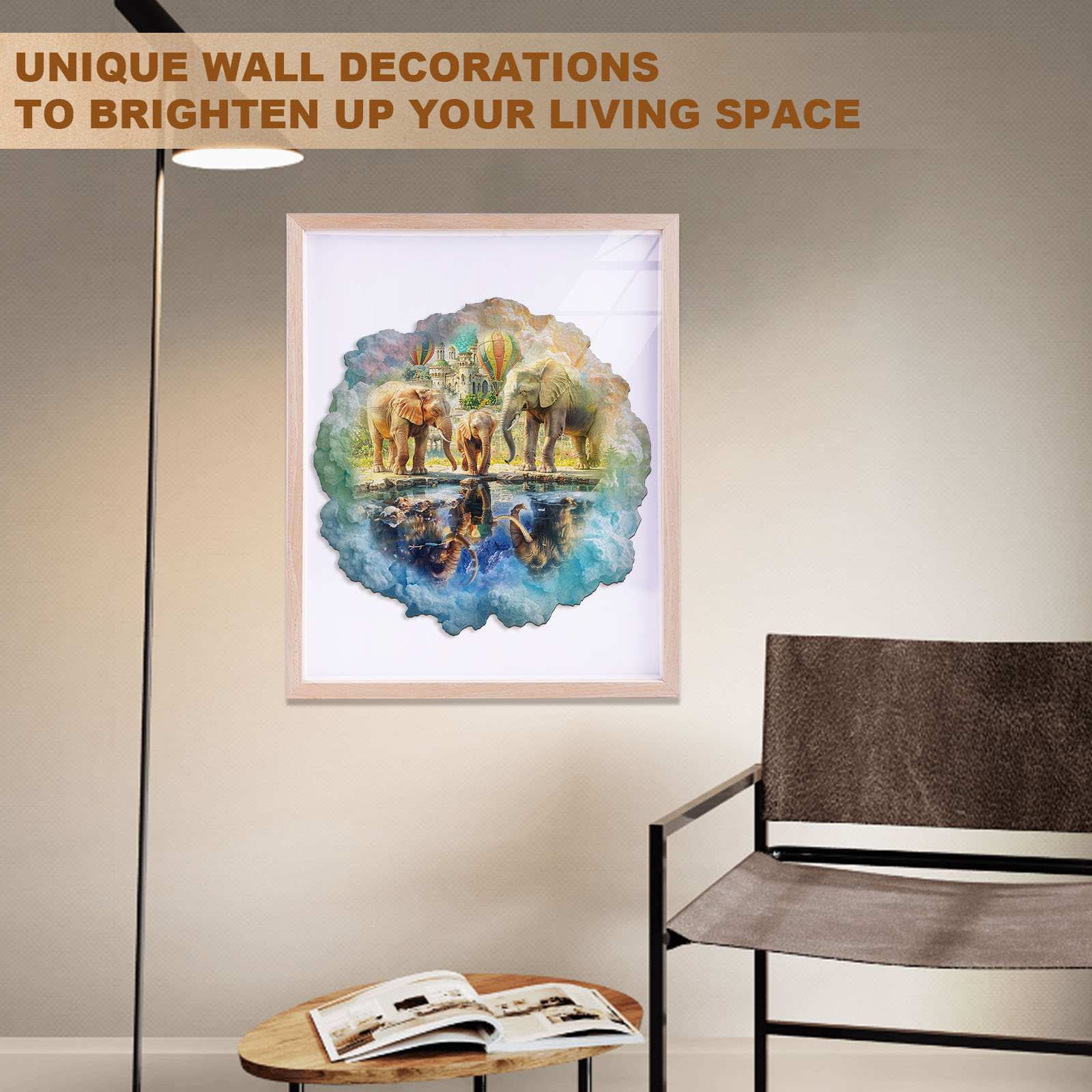 This stunning Kaayee wooden puzzle features a majestic elephant family standing at the edge of a watering hole, with their reflections shimmering in the water below. The design is highly imaginative, blending realism with fantasy. In the background, a beautiful, ethereal landscape of a castle and hot air balloons emerges from colorful clouds. The puzzle’s unique, irregular shape outlines the entire scene, including the mist and clouds, making it a challenging and artistic piece to assemble. It’s a perfect gift for animal lovers, fantasy enthusiasts, and anyone who appreciates a unique and high-quality puzzle design.