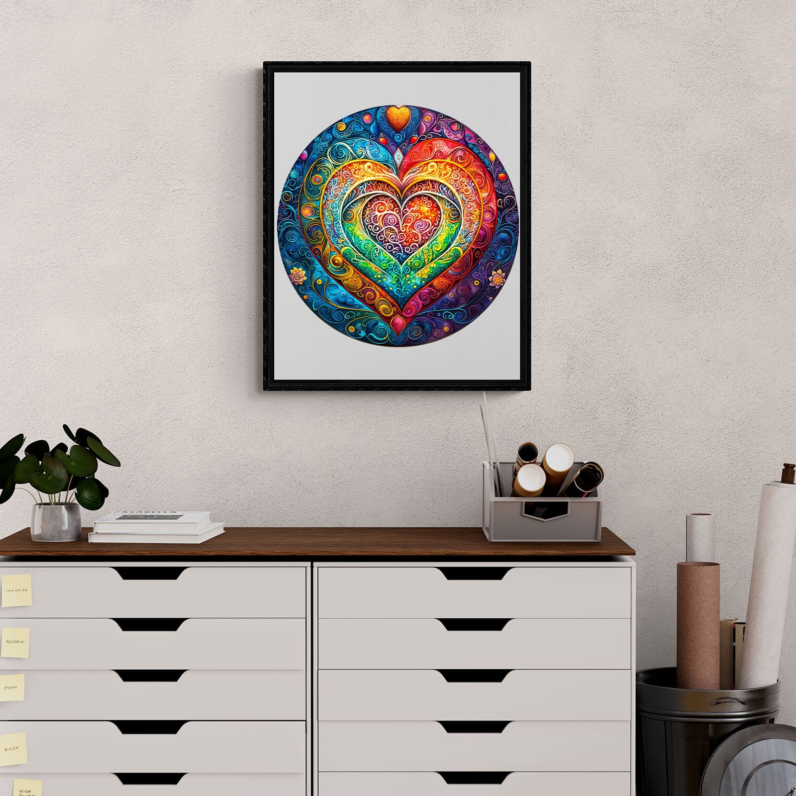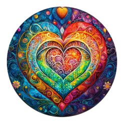 This exquisite wooden jigsaw puzzle features a mesmerizing heart-shaped design bursting with vibrant rainbow colors and intricate swirling patterns. The rich blend of warm and cool tones creates a visually stunning masterpiece that symbolizes love, unity, and harmony. Crafted from high-quality, eco-friendly wood, each precision-cut piece fits perfectly together, offering an engaging and rewarding puzzling experience. Ideal for both relaxation and brain-stimulating fun, this artistic puzzle is perfect for puzzle enthusiasts, art lovers, and anyone who appreciates beautiful craftsmanship. Once completed, it makes a striking decorative piece, adding warmth and elegance to any space.