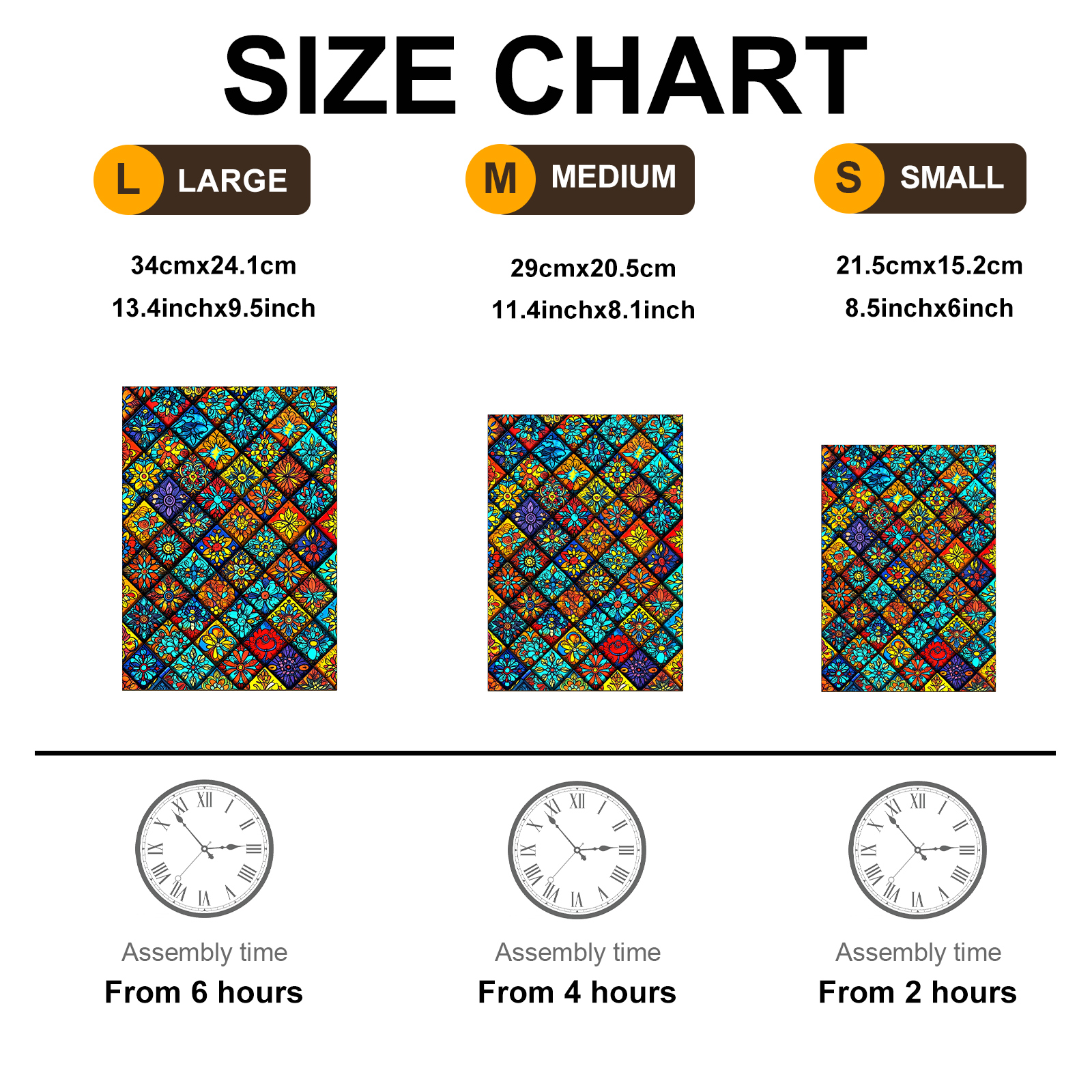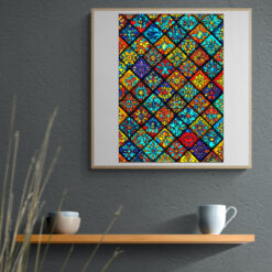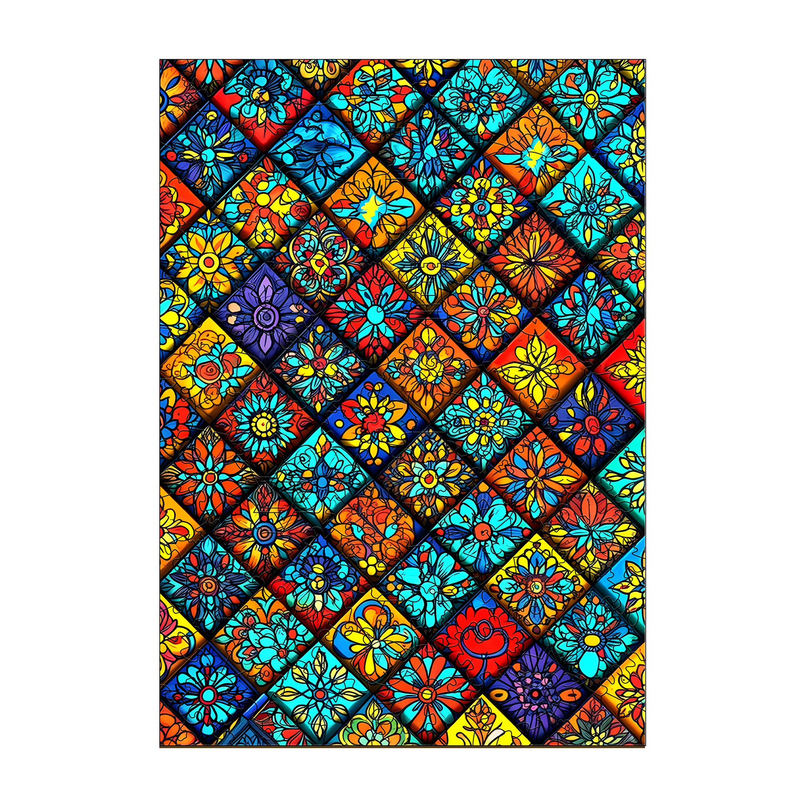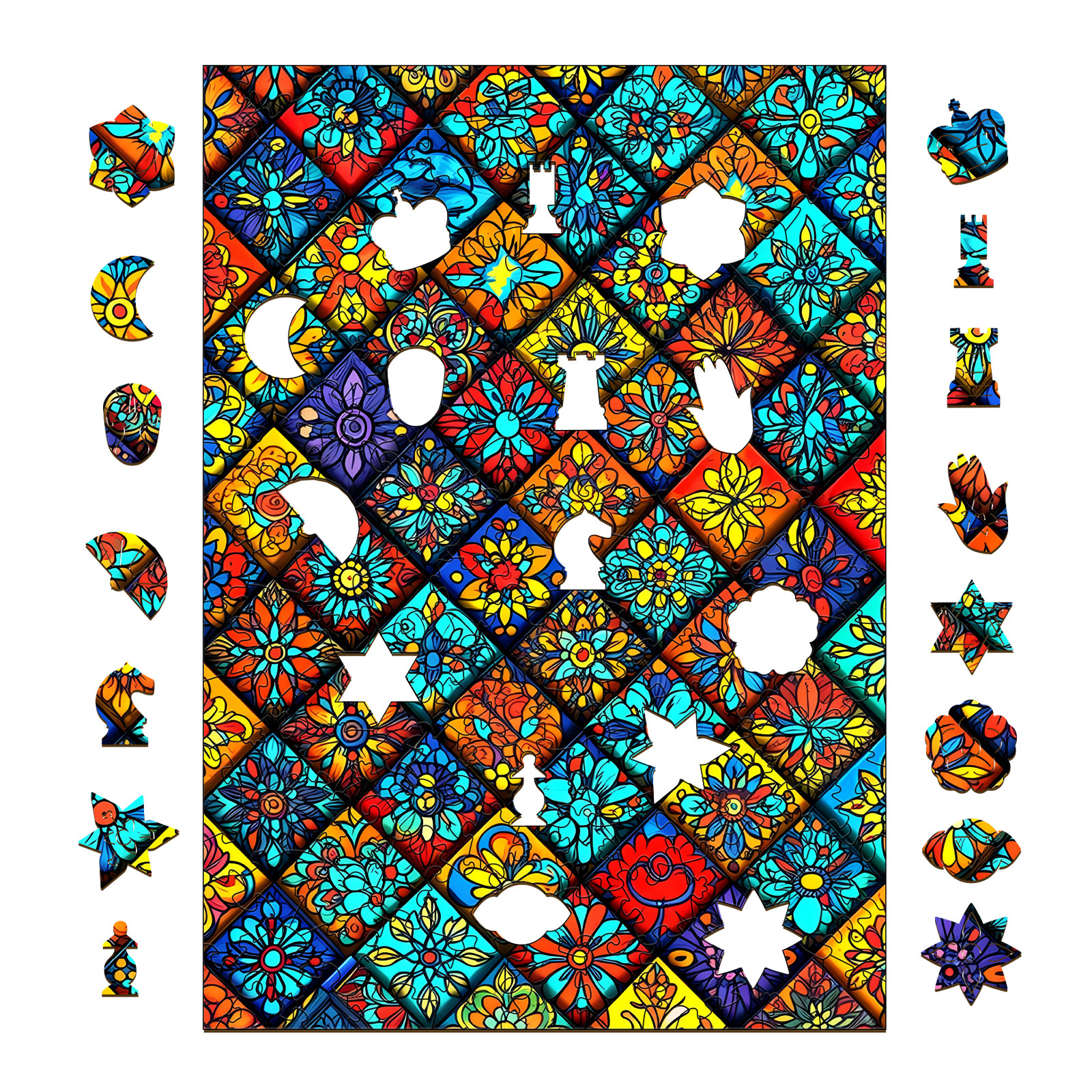 This wooden jigsaw puzzle features a vibrant and intricate design reminiscent of a stained glass window. The puzzle is composed of numerous diamond-shaped pieces, each containing a unique, colorful floral pattern. The patterns burst with a rich palette of colors, including deep blues, fiery reds, sunny yellows, and vivid purples, creating a mesmerizing mosaic effect. The interlocking pieces are meticulously crafted, showcasing the beauty of both the artwork and the natural wood grain, making this puzzle not only a challenging activity but also a stunning piece of art to display once completed.