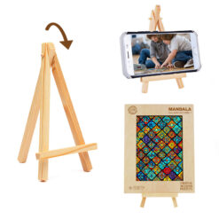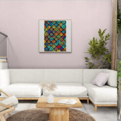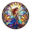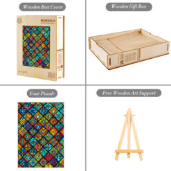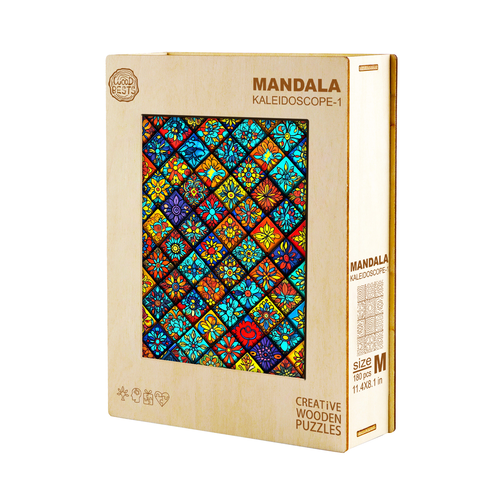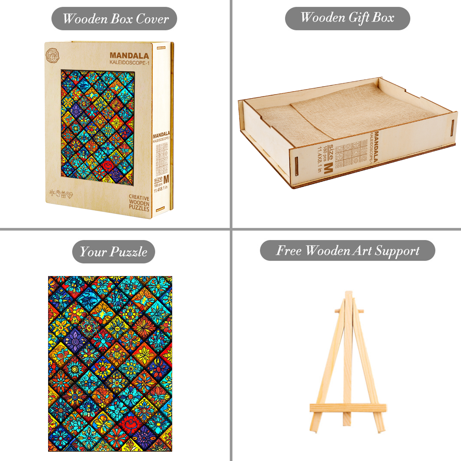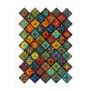 This wooden jigsaw puzzle features a vibrant and intricate design reminiscent of a stained glass window. The puzzle is composed of numerous diamond-shaped pieces, each containing a unique, colorful floral pattern. The patterns burst with a rich palette of colors, including deep blues, fiery reds, sunny yellows, and vivid purples, creating a mesmerizing mosaic effect. The interlocking pieces are meticulously crafted, showcasing the beauty of both the artwork and the natural wood grain, making this puzzle not only a challenging activity but also a stunning piece of art to display once completed.
