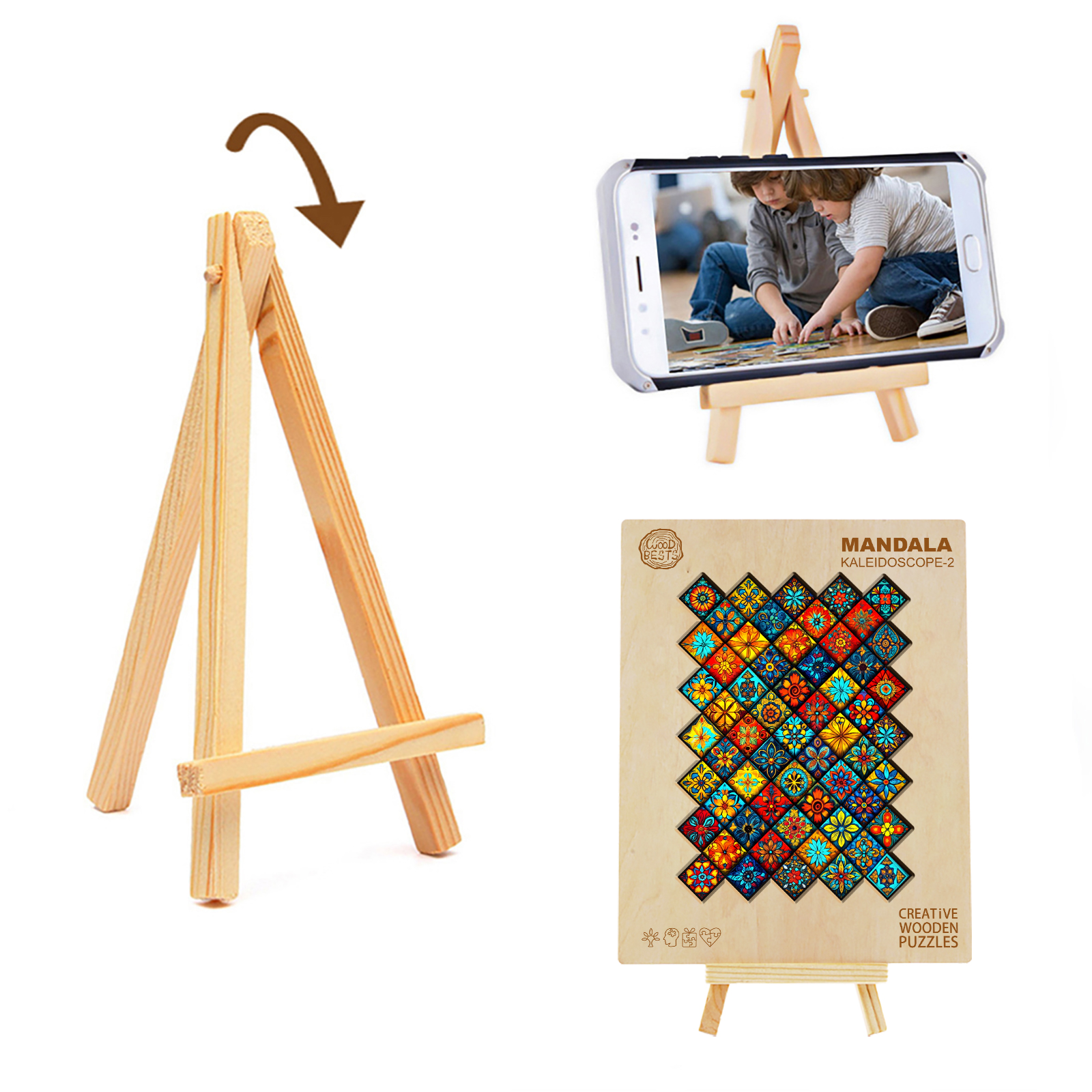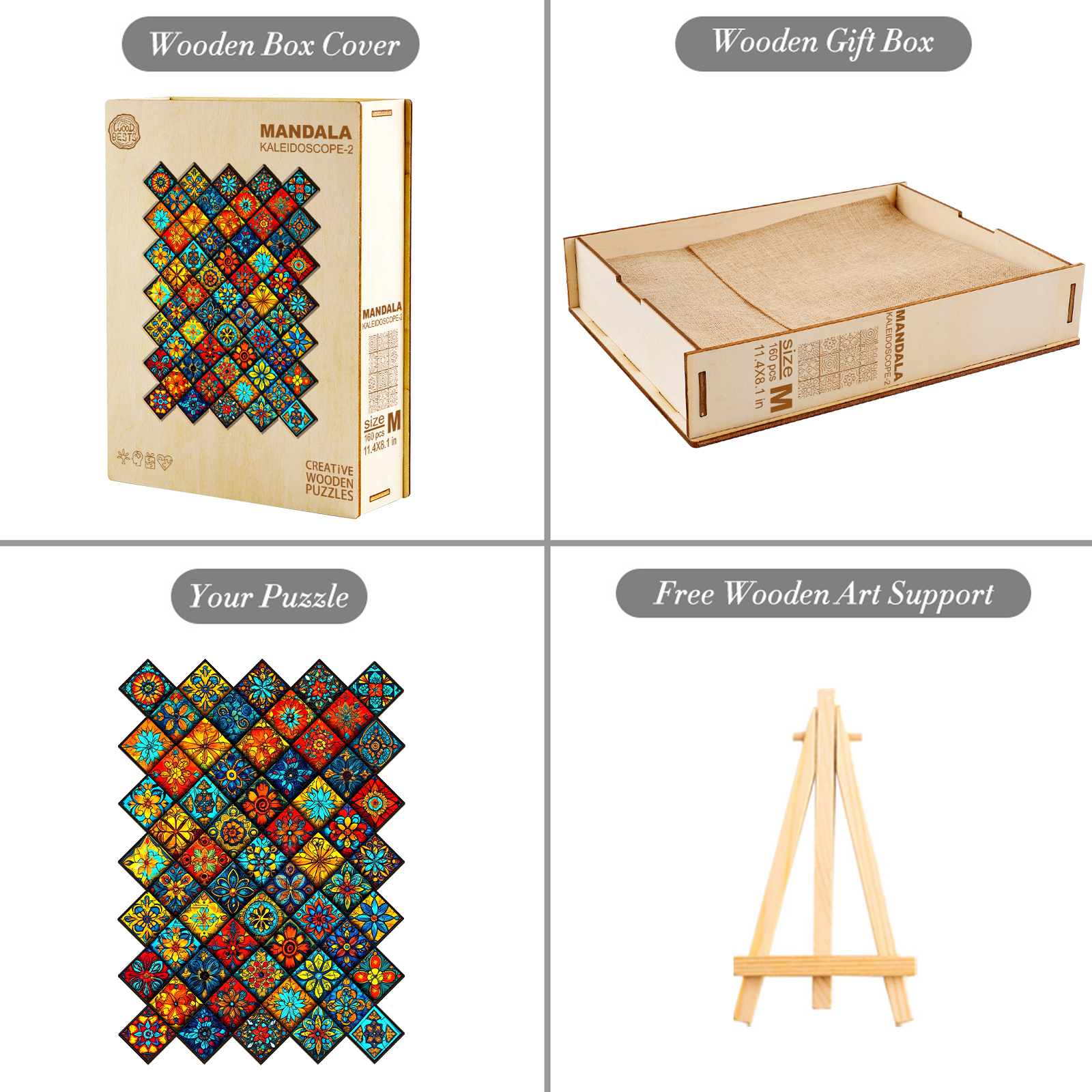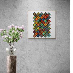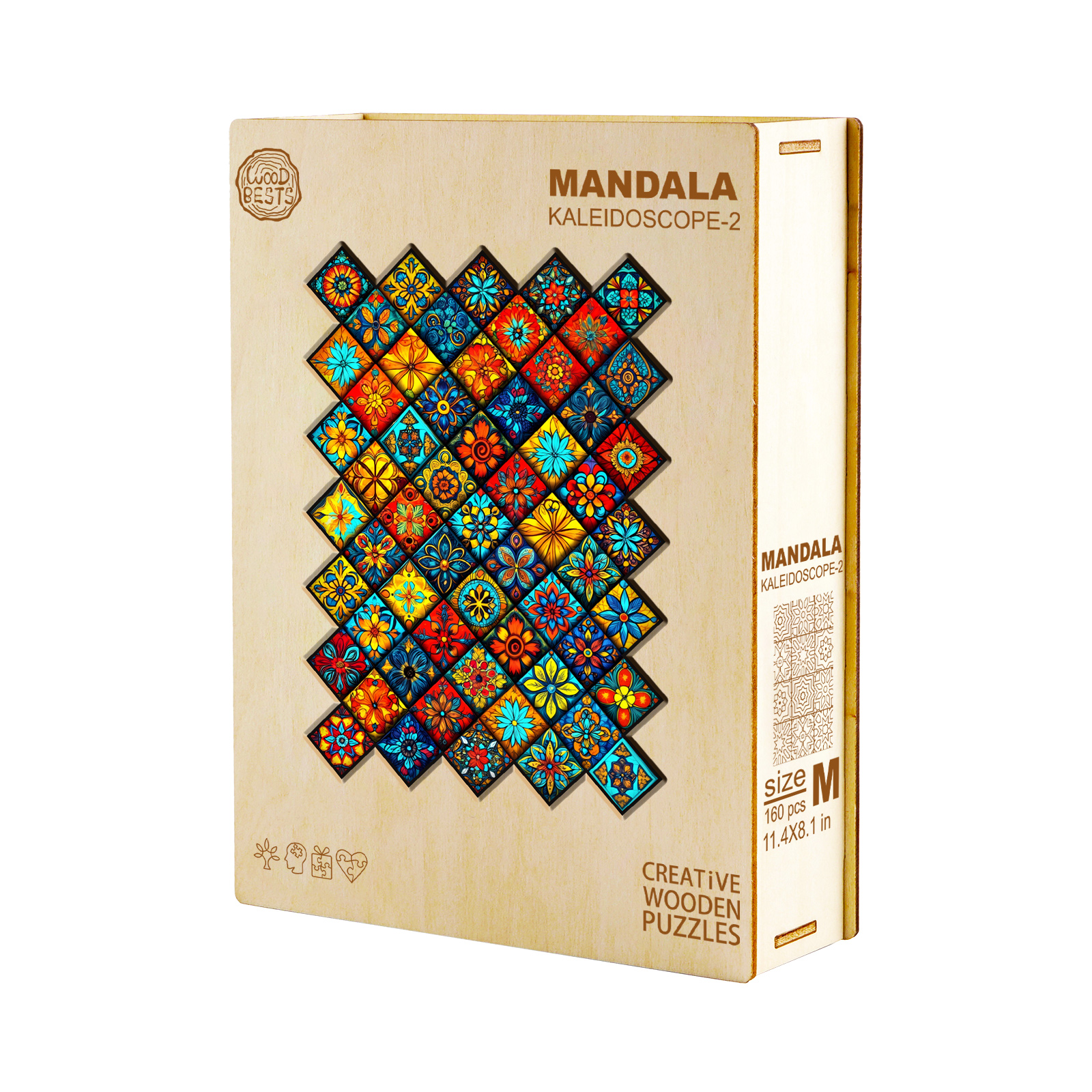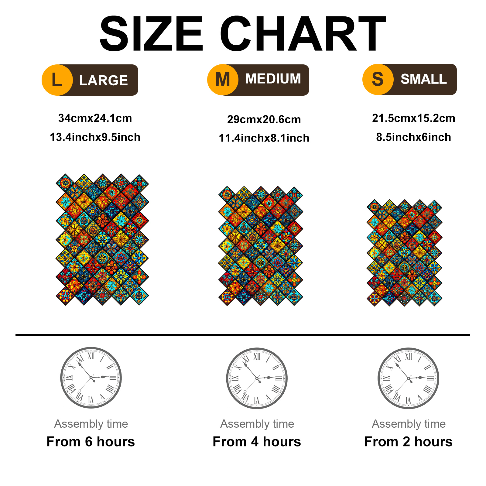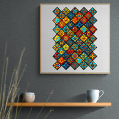 This wooden puzzle features a vibrant mosaic of intricately designed tiles, each adorned with colorful floral and geometric patterns. The tiles are arranged in a striking diamond layout, creating a visually captivating piece reminiscent of traditional stained glass or handcrafted ceramics. With rich hues of red, blue, yellow, and orange, this puzzle is not only a fun challenge but also a beautiful work of art. Perfect for puzzle lovers and art enthusiasts alike, it offers a unique and engaging experience that celebrates craftsmanship and creativity.