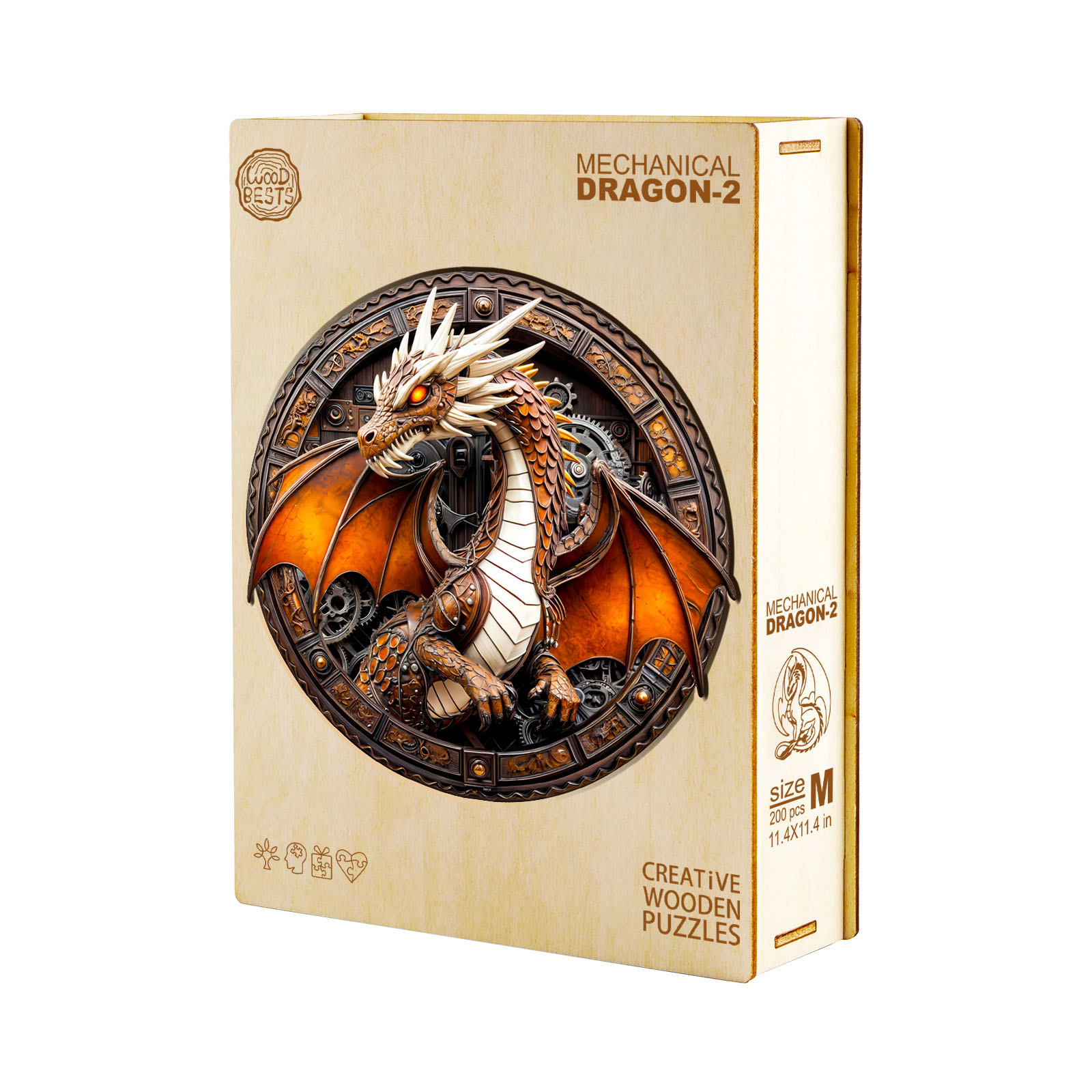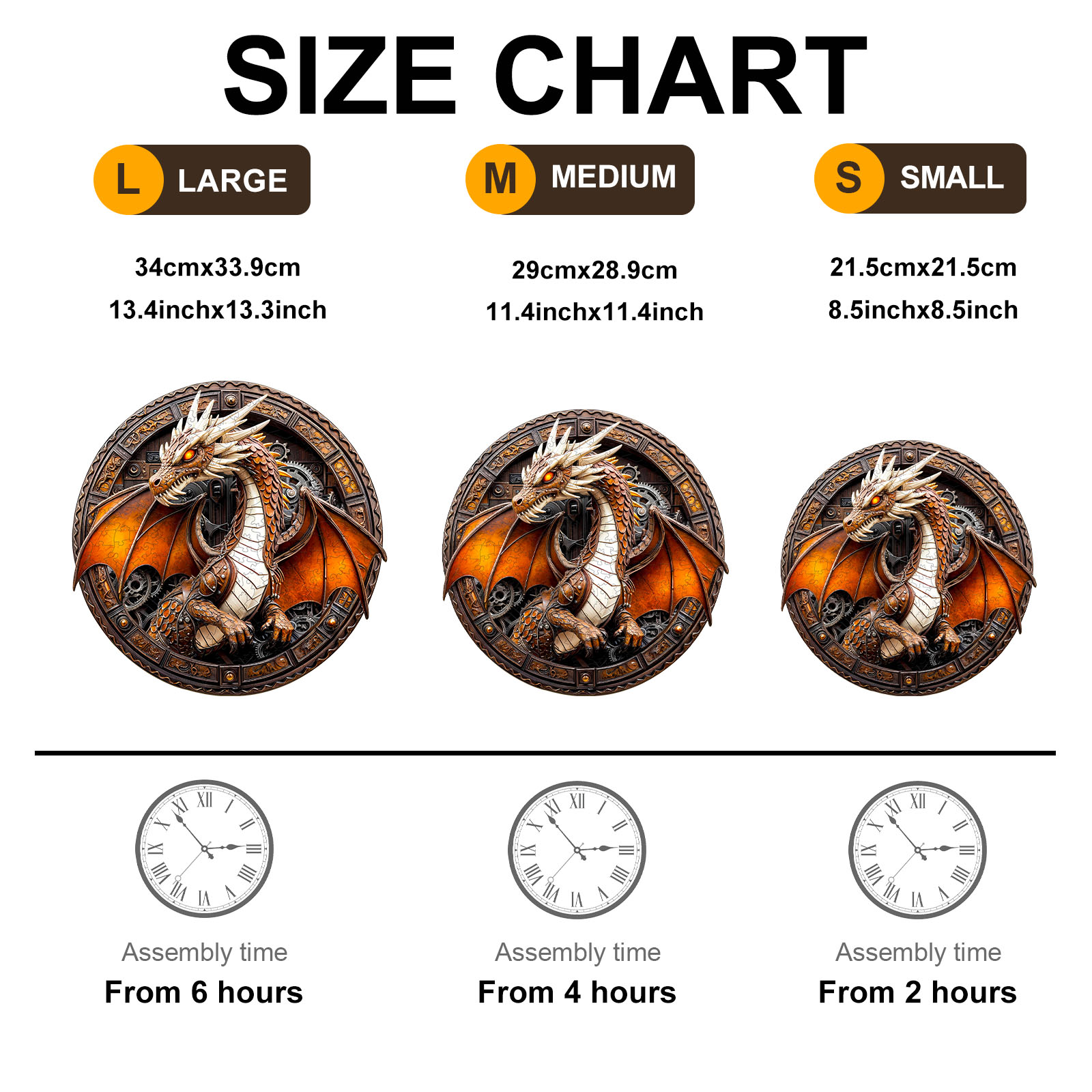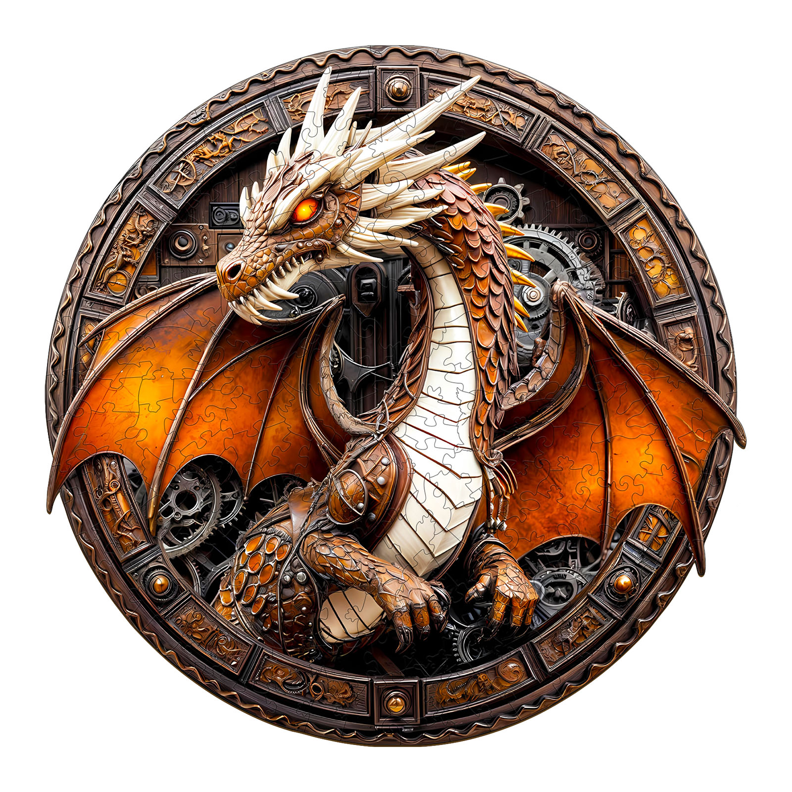 Ignite your imagination with this bold and fiery wooden puzzle featuring a powerful steampunk dragon, armored in bronze and iron. Set within a round frame of gears and mechanical details, the dragon’s sharp gaze, glowing eyes, and textured scales bring an intense, industrial fantasy to life. With its vibrant orange wings and intricate design, this puzzle is both an exhilarating build and an eye-catching wall display. Perfect for dragon collectors, steampunk enthusiasts, and those who love puzzles with an edge of fierce elegance.