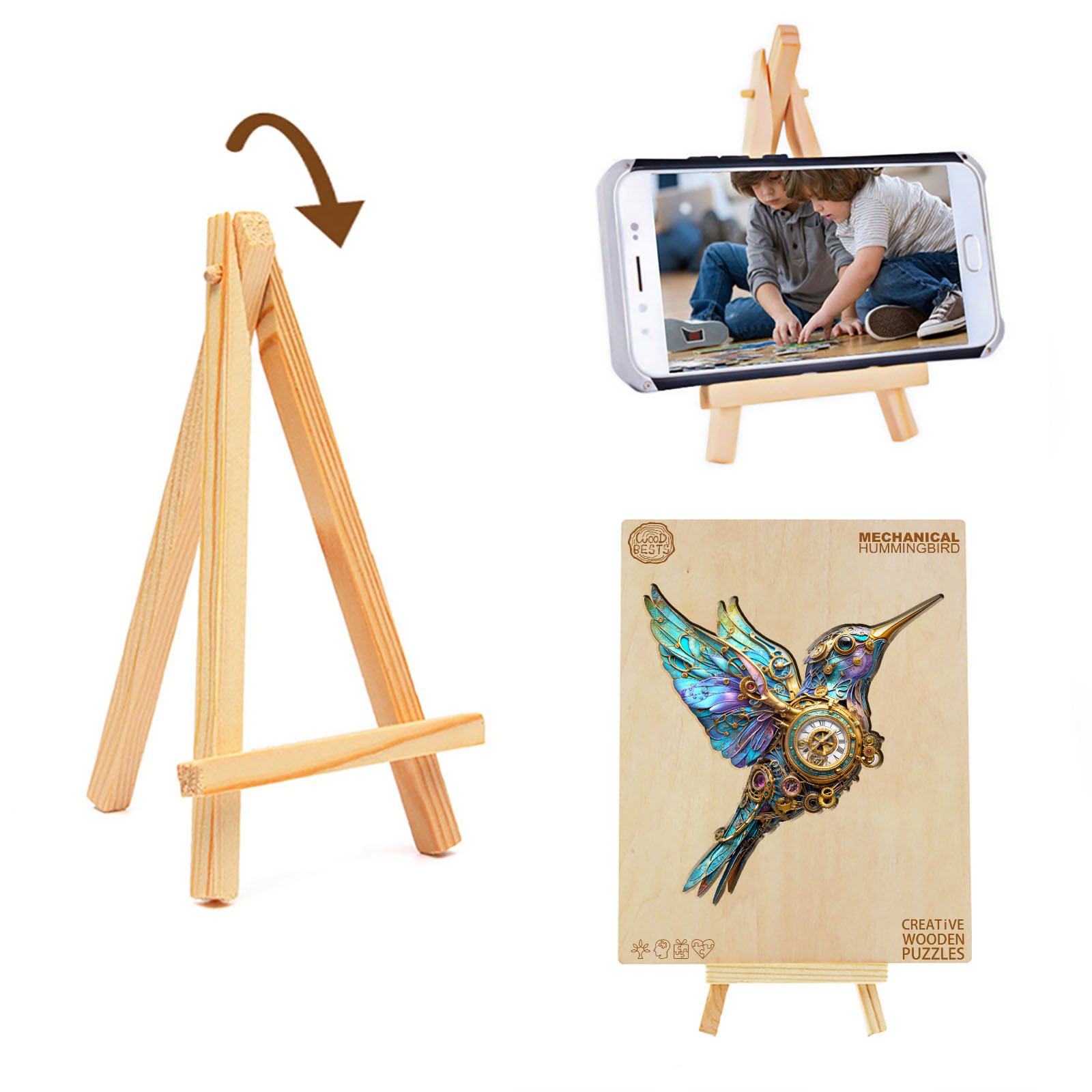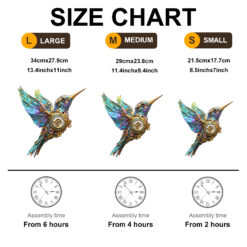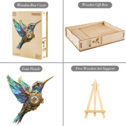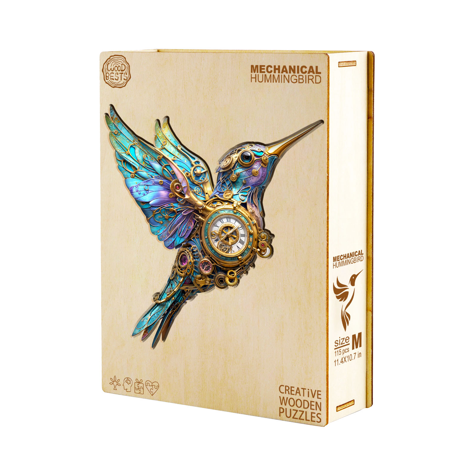 This wooden puzzle features an exquisite steampunk-style hummingbird, masterfully designed with intricate gears, clockwork elements, and iridescent wings in shades of blue and violet. The detailed craftsmanship and vivid coloration bring the mechanical bird to life, making it not only a fun and challenging puzzle but also a stunning piece of art. Ideal for collectors and lovers of unique, artistic puzzles.