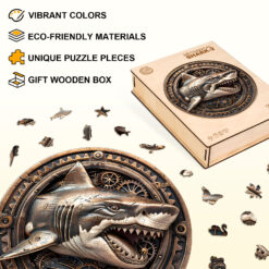 This Kaayee wooden puzzle captures the bold power of a mechanical shark breaking through a circle of gears in stunning steampunk style. With its intricate metallic textures, sharp details, and dynamic design, the puzzle combines marine ferocity with industrial artistry. Each precisely cut wooden piece contributes to a striking 3D effect, making the assembly process both challenging and rewarding. Once completed, it transforms into an eye-catching display piece—perfect for puzzle enthusiasts, steampunk fans, or anyone who appreciates unique, artistic craftsmanship.