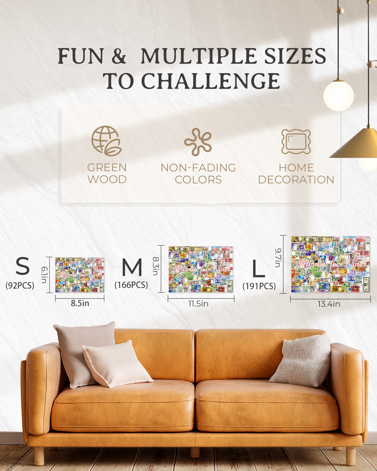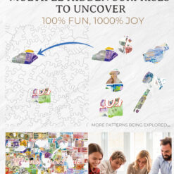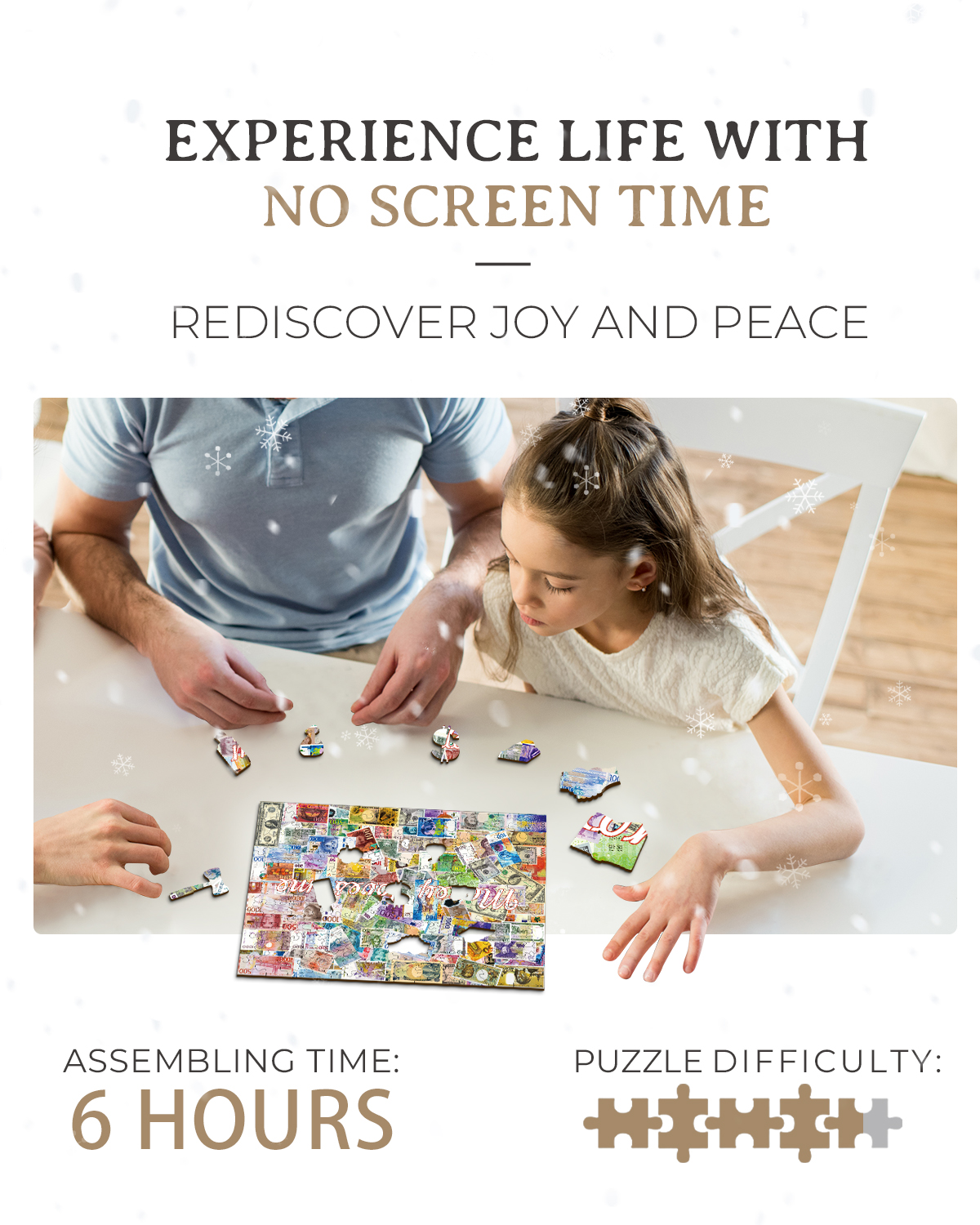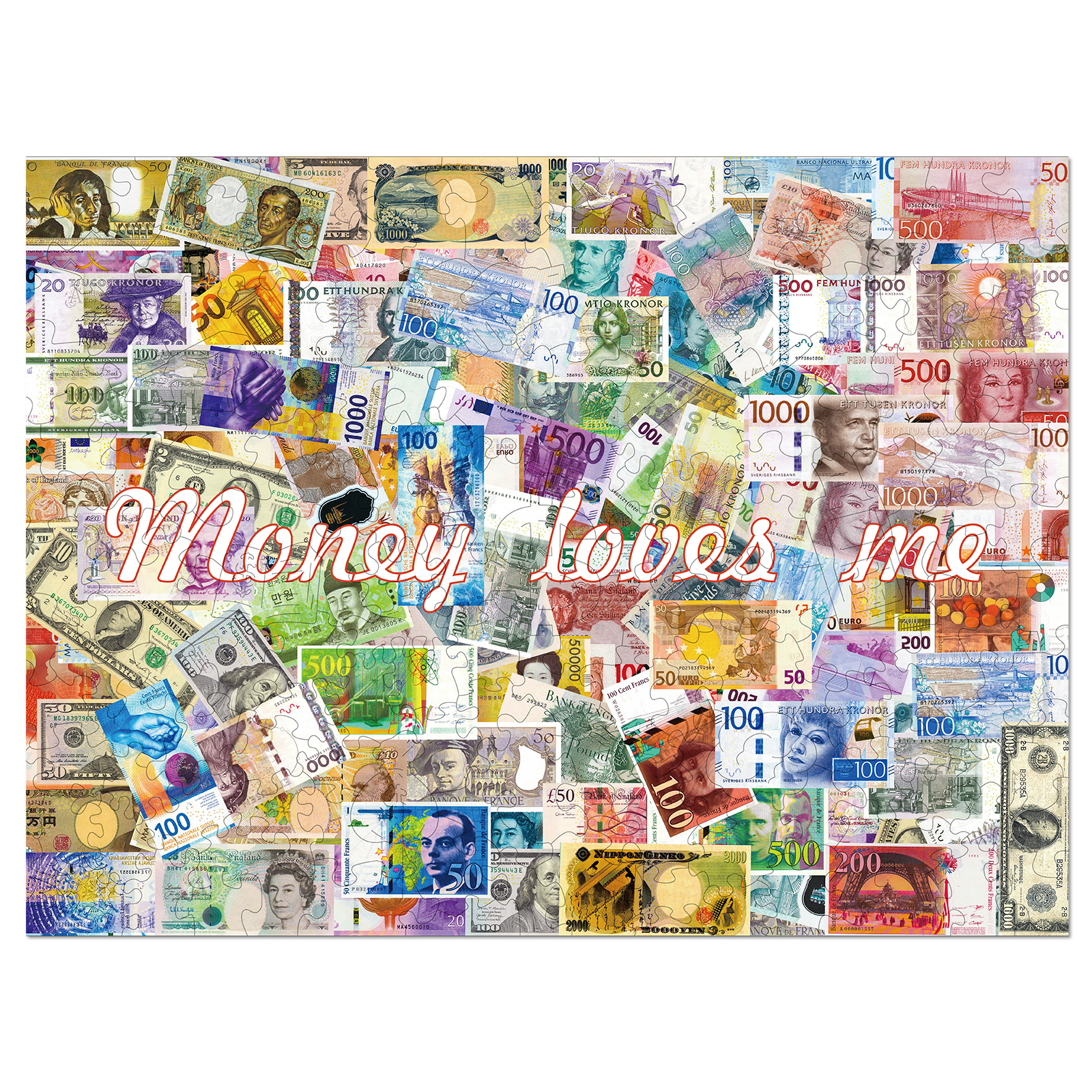 This captivating Kaayee wooden puzzle features a collage of international banknotes from various countries, creating a rich and intricate mosaic of world currencies. The puzzle includes a mix of bills in different colors and denominations, showcasing diverse portraits, landmarks, and designs. Overlaid on the collage are the words “Money loves me,” adding a unique and positive message. This challenging and visually detailed puzzle is an excellent choice for currency collectors, world travelers, or anyone who enjoys a complex and rewarding puzzling experience.