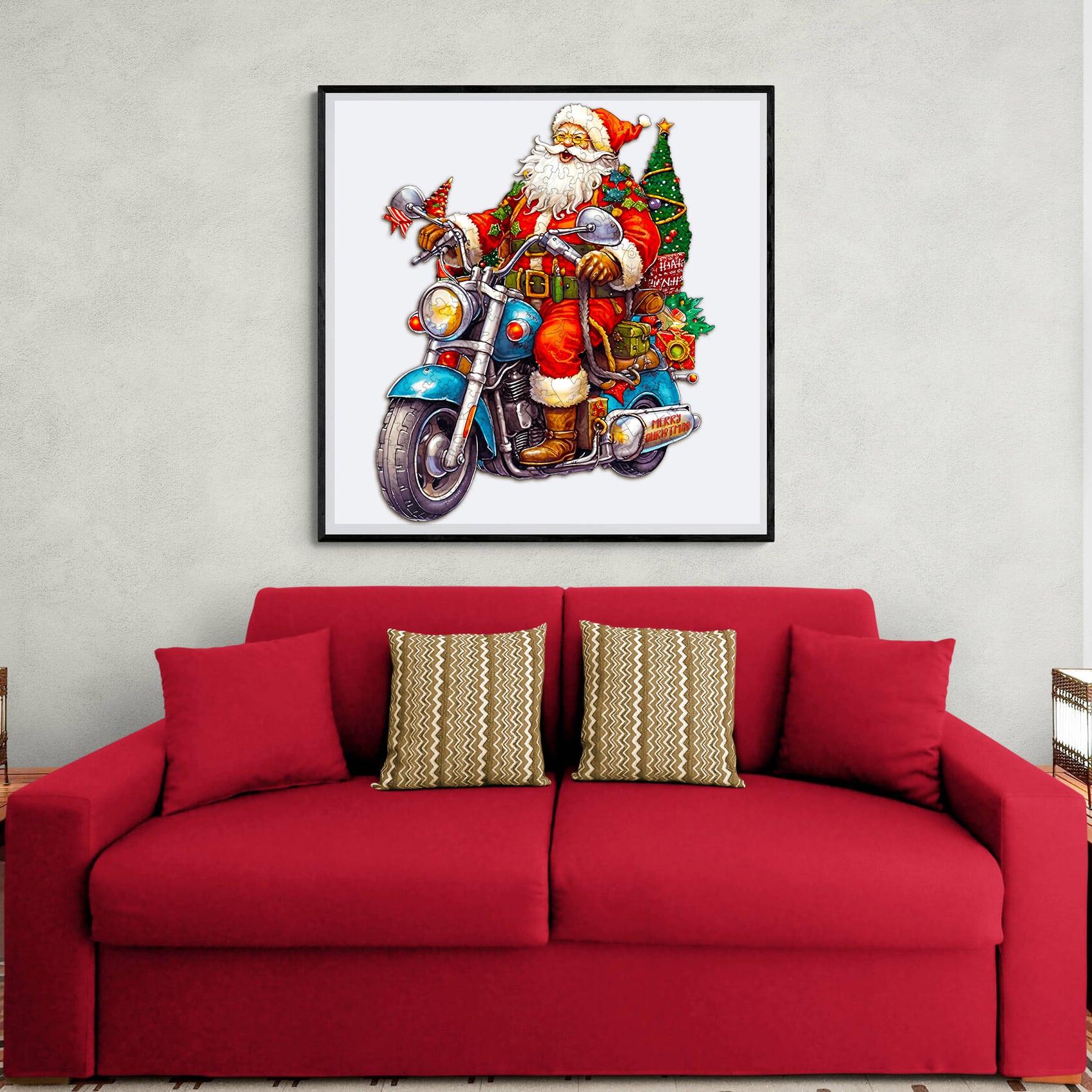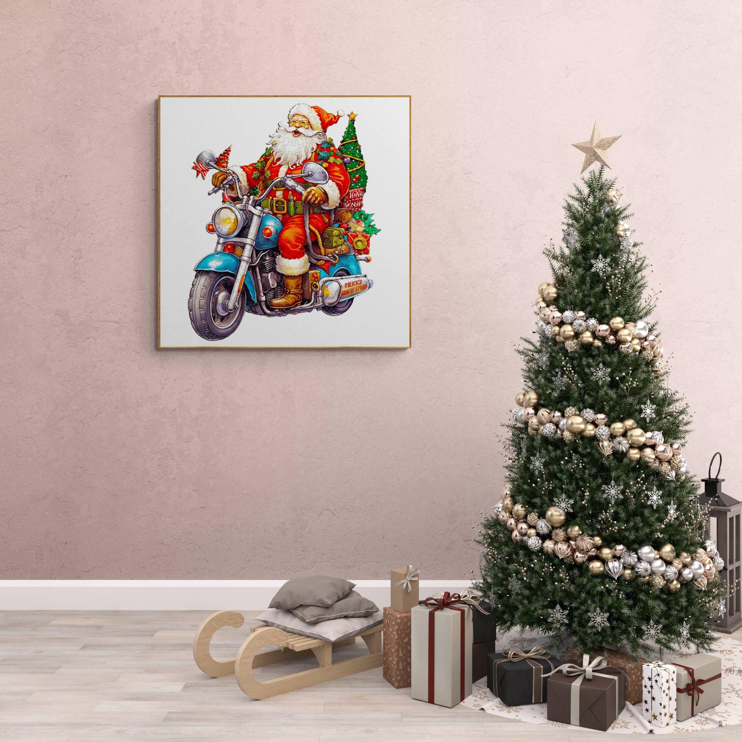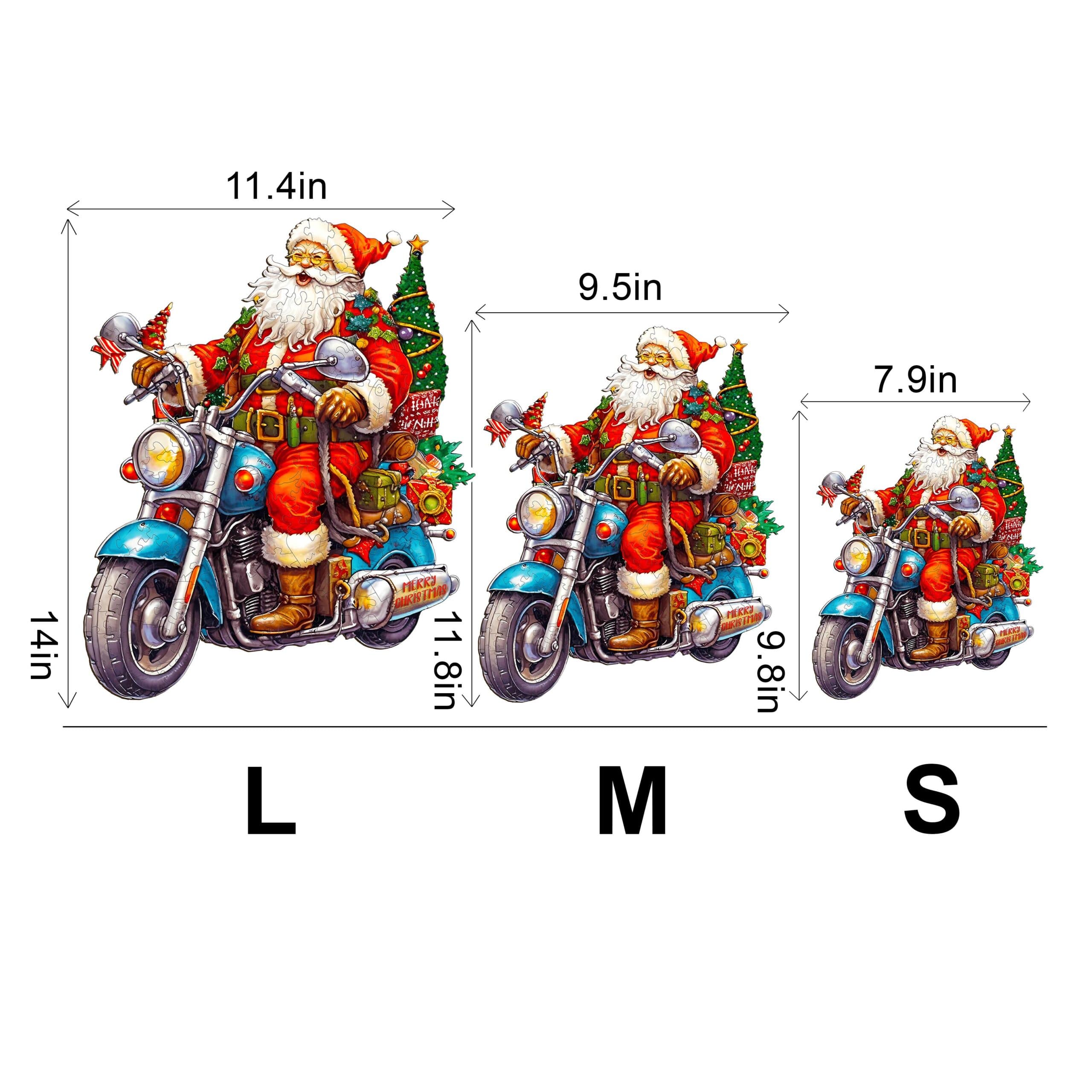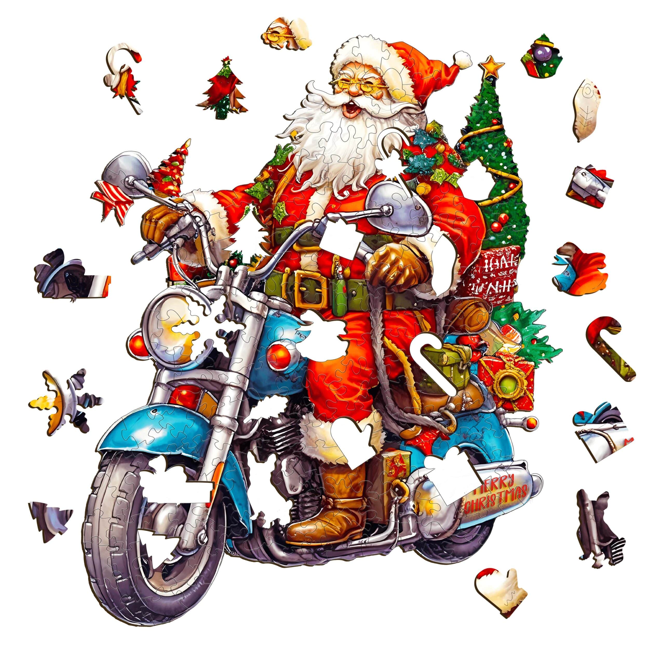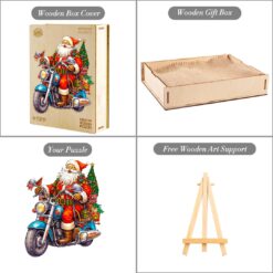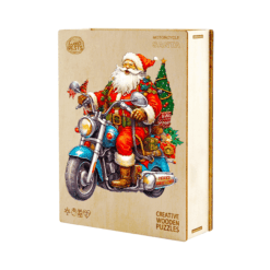 Rev up the holiday spirit with the Motorcycle Santa wooden puzzle! This fun and festive design showcases Santa Claus riding a cool motorcycle, decked out in classic red and green, with a Christmas tree and presents strapped to the back. Perfect for puzzle enthusiasts and holiday lovers alike, this vibrant puzzle offers a fresh take on Santa’s joyful journey. Crafted from premium wood, it’s durable and eco-friendly, making it an ideal gift or holiday activity. Bring a bit of adventure to your Christmas décor with this unique, high-quality wooden puzzle!