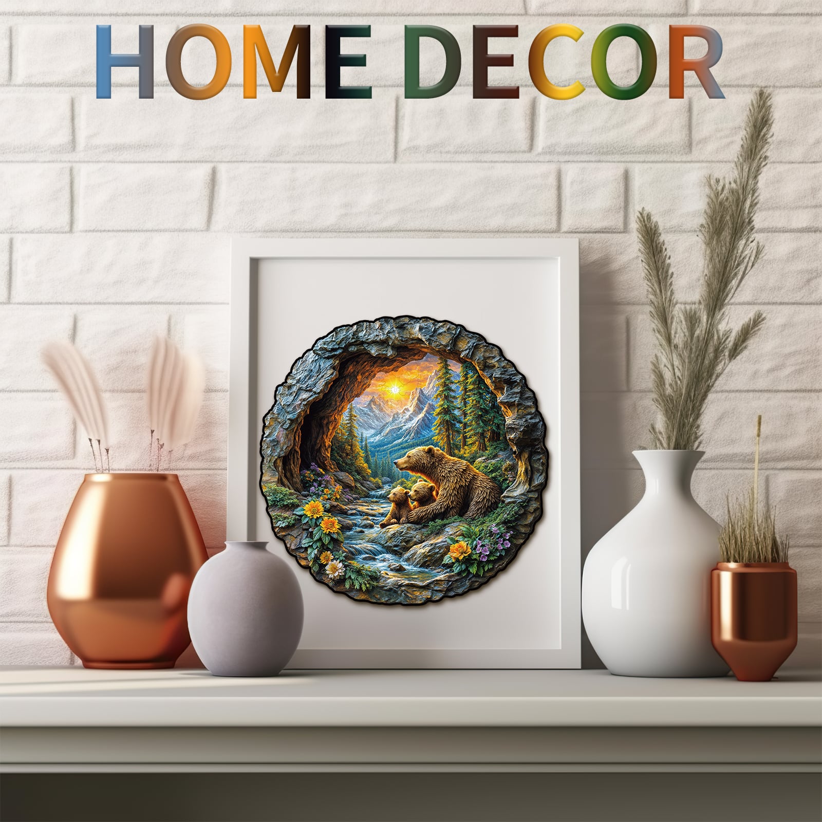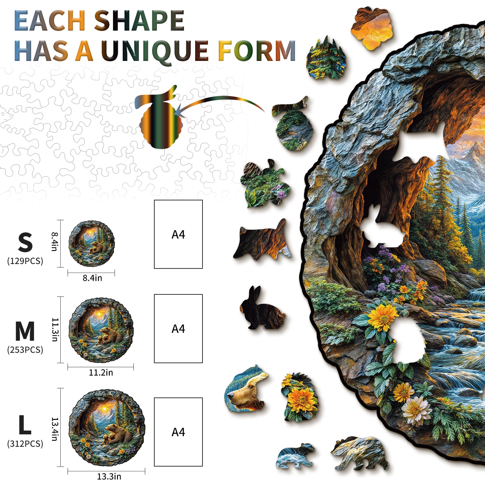 Immerse yourself in the beauty of nature with our intricately designed wooden jigsaw puzzle, featuring a breathtaking scene of a mother bear and her cubs resting by a serene mountain stream. Encased within the shape of a rustic cave, the artwork bursts with vivid details—lush evergreen trees, colorful wildflowers, and a radiant sunrise over snow-capped peaks.Unleash your creativity, bond with loved ones, and reconnect with the wonders of the wilderness—all in one unforgettable puzzle experience.