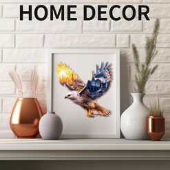 This incredible Kaayee wooden puzzle features a majestic eagle in flight, with its body and wings revealing two distinctly different landscapes. One side of the eagle contains a sunlit cityscape, with a warm, golden glow over the buildings. The other side portrays a more somber, ruined, or stormy scene, creating a striking contrast. This puzzle’s unique, irregular shape outlines the entire eagle, making it both a challenging and artistic piece to assemble. It’s a perfect gift for fans of wildlife art and those who appreciate creative and symbolic designs.