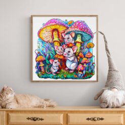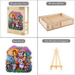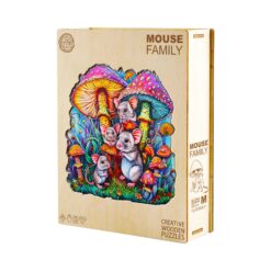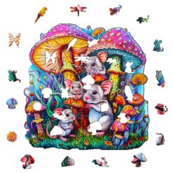 This Mouse Family wooden puzzle showcases an adorable family of mice nestled amidst a vibrant and whimsical forest of colorful mushrooms. The puzzle’s vivid details bring the enchanting scene to life, with the mice’s soft, gray fur and pink ears standing out against the rich, psychedelic hues of the towering mushrooms. Each mushroom is intricately designed with unique colors, patterns, and textures, creating a magical, otherworldly feel. This delightful, nature-inspired puzzle is perfect for puzzle enthusiasts and lovers of charming woodland creatures, offering a fun and immersive experience for all ages