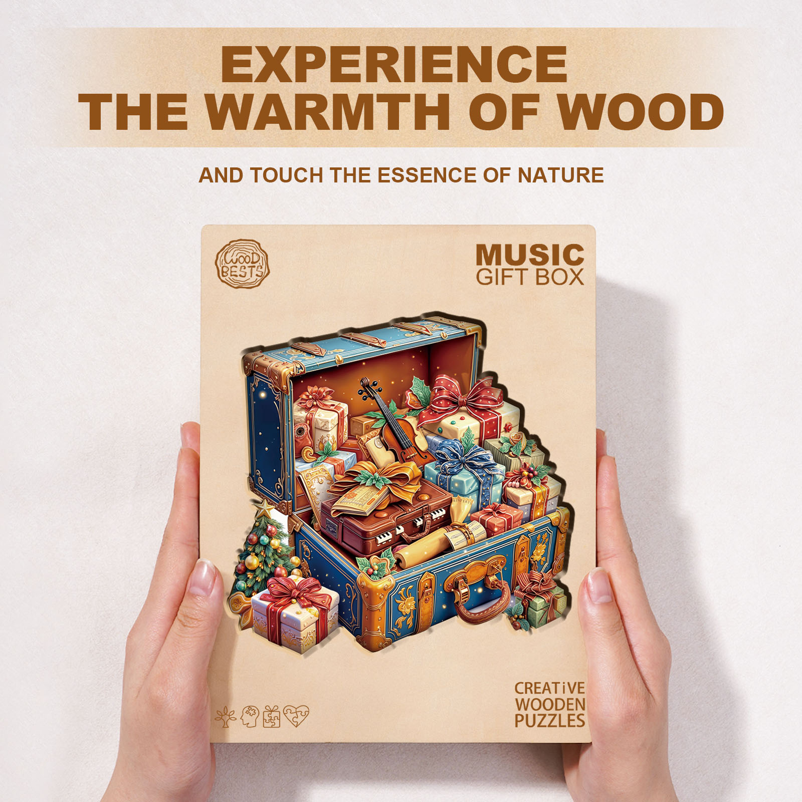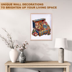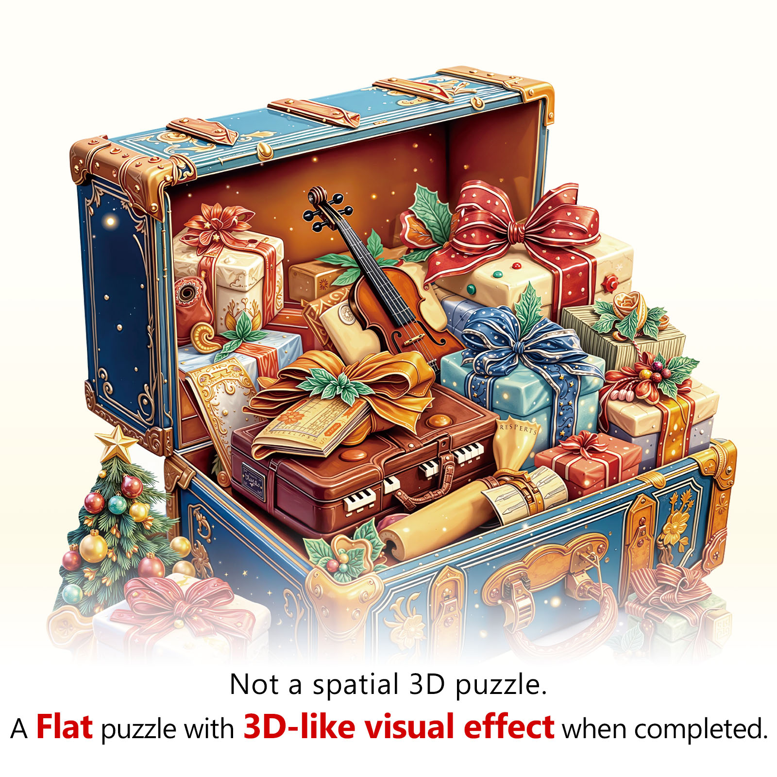 This enchanting Kaayee wooden puzzle features a festive and overflowing “Music Gift Box.” The design showcases a beautifully decorated trunk, bursting with holiday cheer and musical instruments. Inside, a violin and a vintage record player are nestled among a variety of wrapped gifts, all tied with colorful ribbons and bows. The puzzle’s irregular shape outlines the trunk and its contents, adding to the fun and challenge. It’s a perfect gift for music lovers and anyone who enjoys a unique and celebratory puzzle.