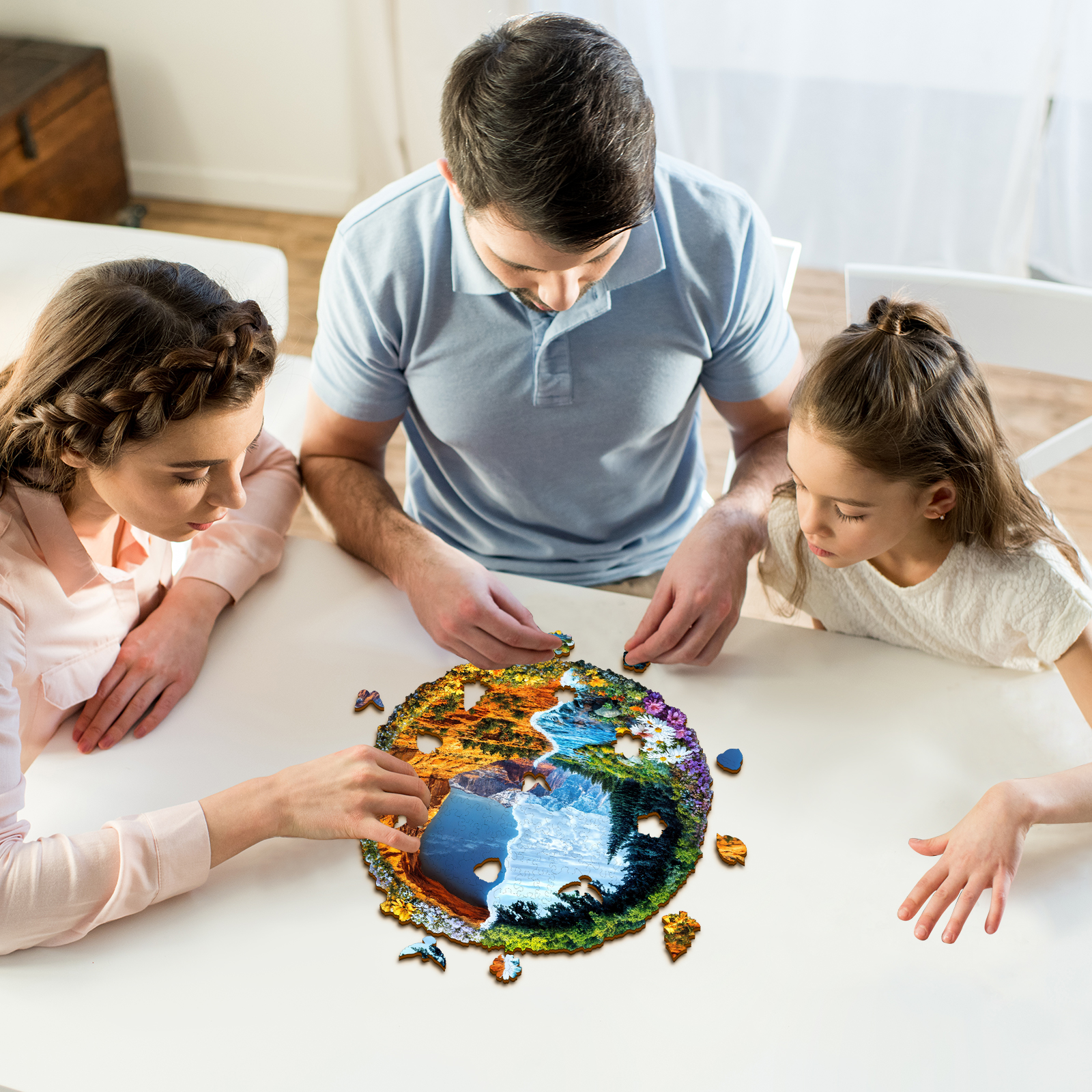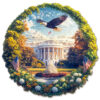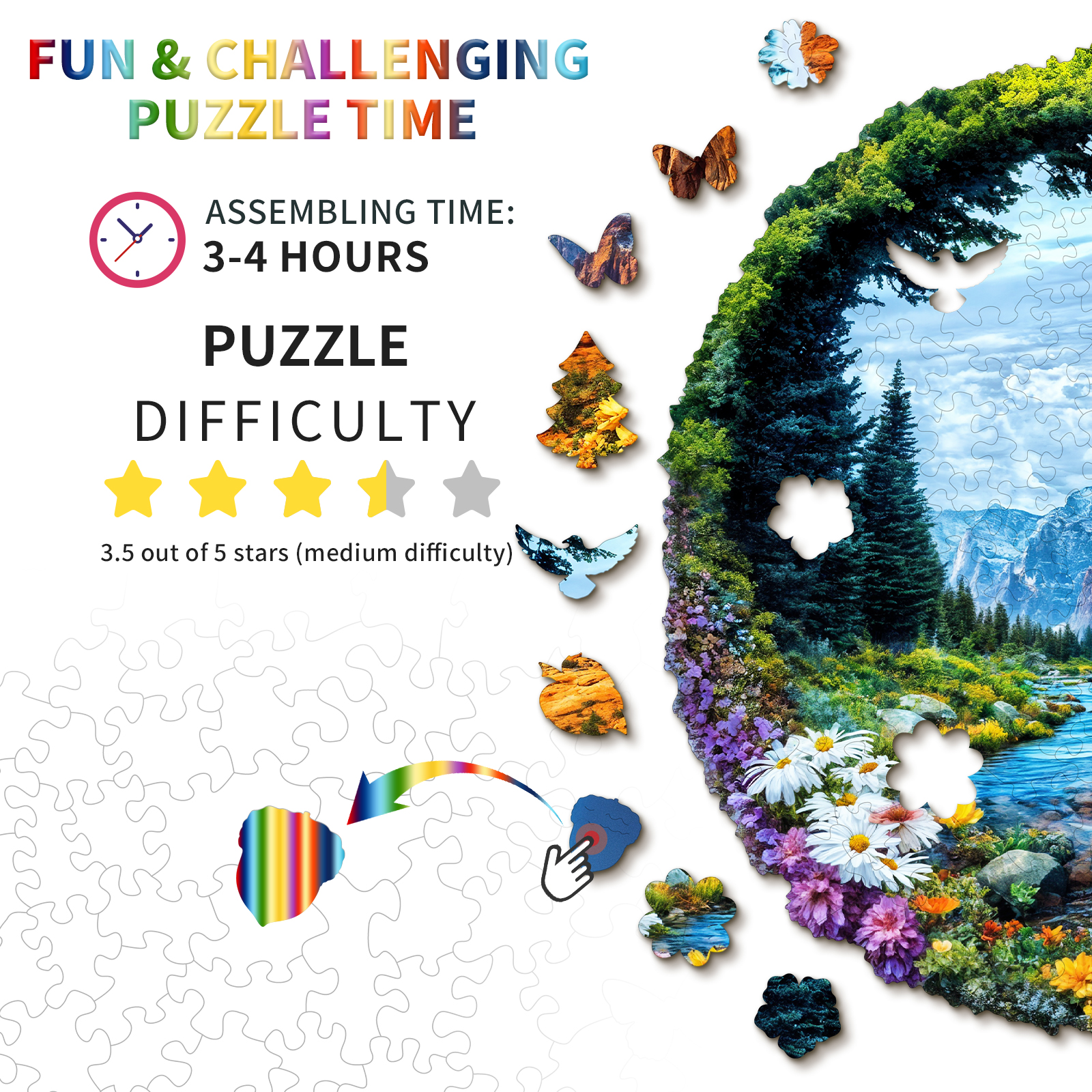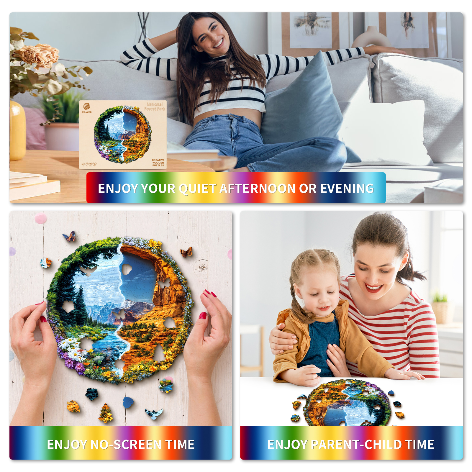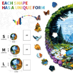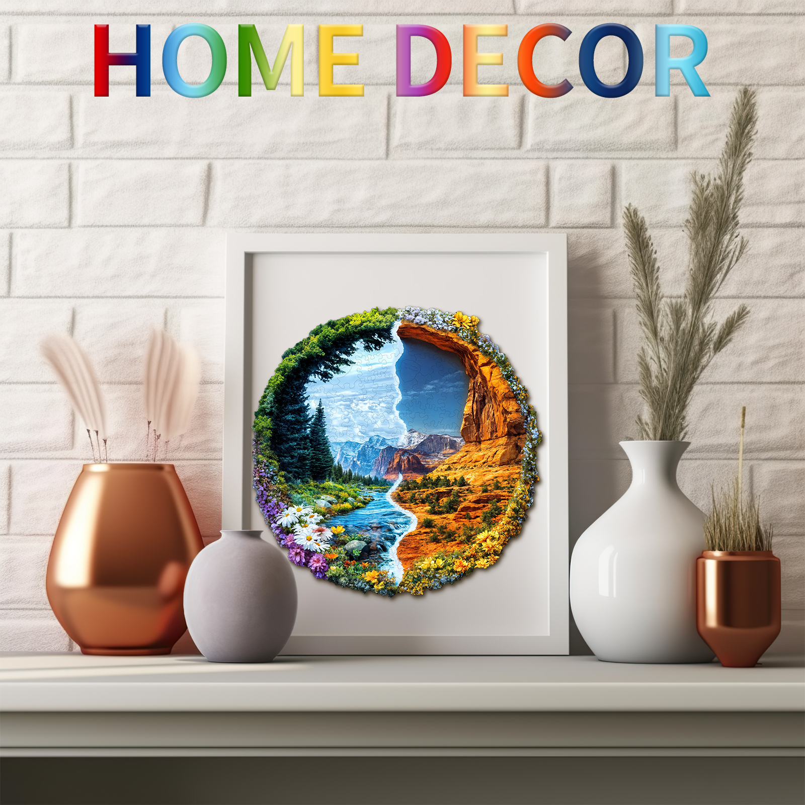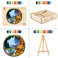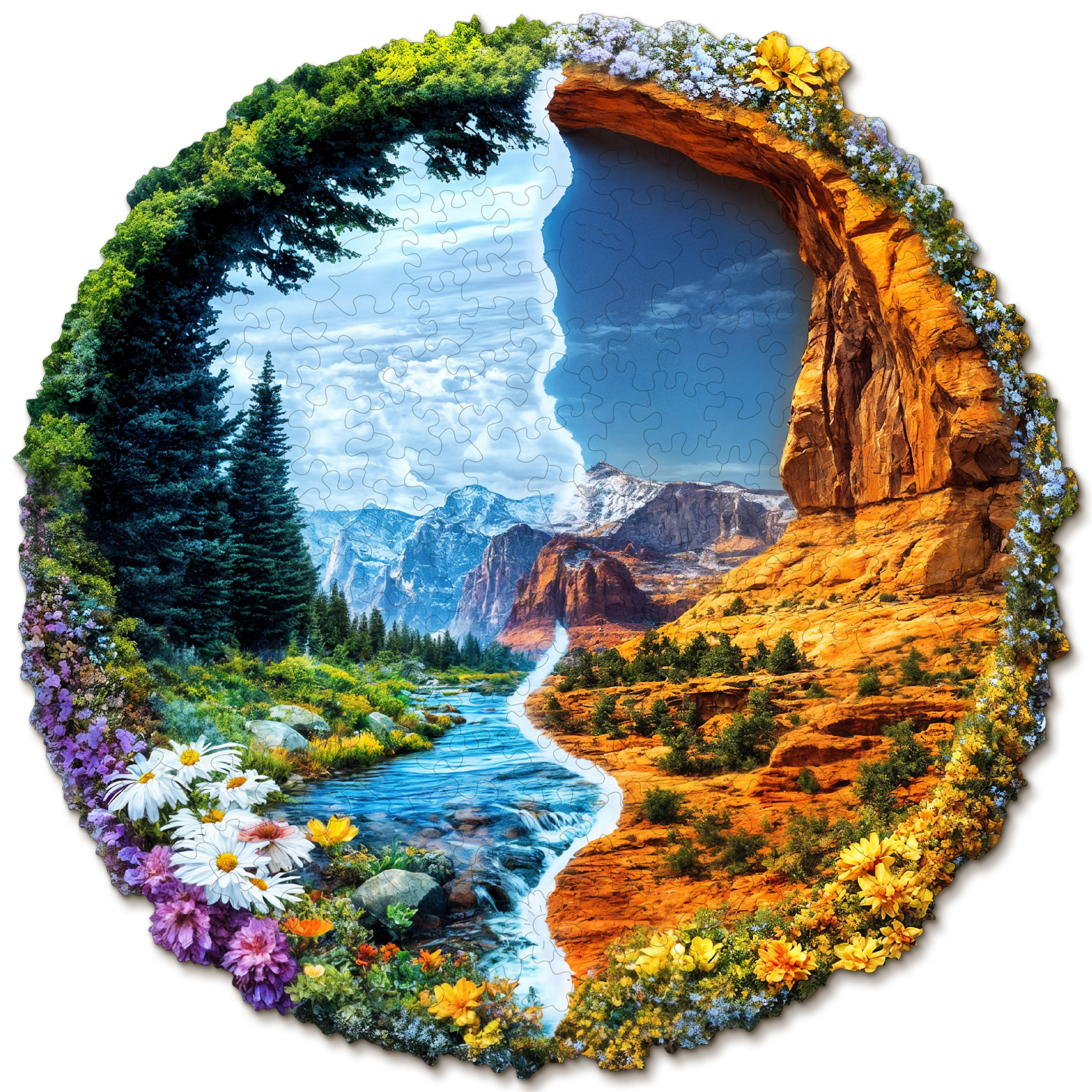 This striking Kaayee wooden puzzle beautifully captures the majestic diversity of a US National Forest Park, presented in a unique split design within a circular frame. The left side showcases a lush, vibrant landscape with towering green trees, a serene river winding through a valley, and a foreground bursting with colorful wildflowers, all set against a backdrop of distant, cool-toned mountains under a bright sky. This half evokes the verdant beauty often found in areas like the Pacific Northwest or the Rockies. In stark contrast, the right side transforms into a rugged, arid landscape of warm-toned rock formations and canyons, reminiscent of the American Southwest, with sparse desert flora and a brilliant blue sky.
