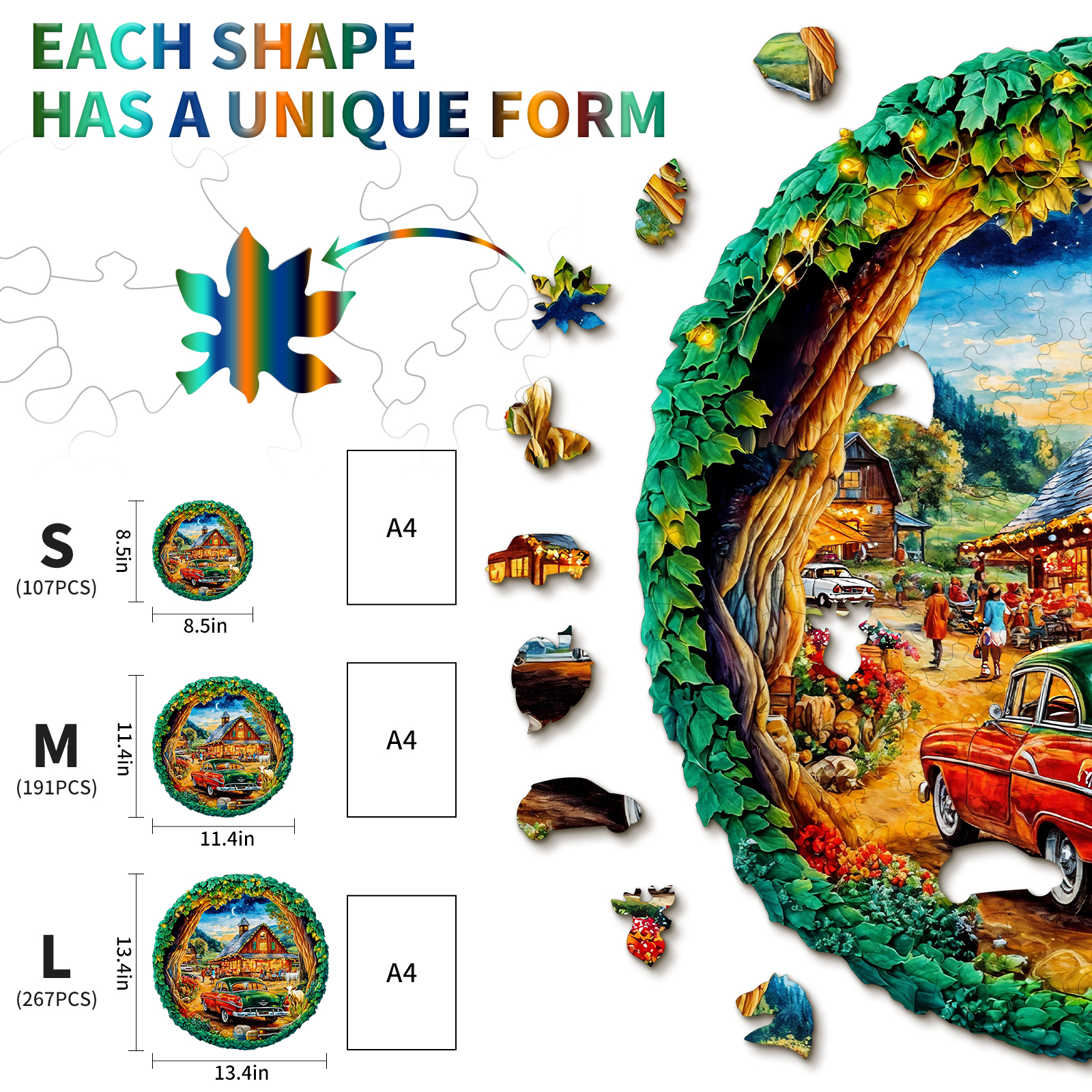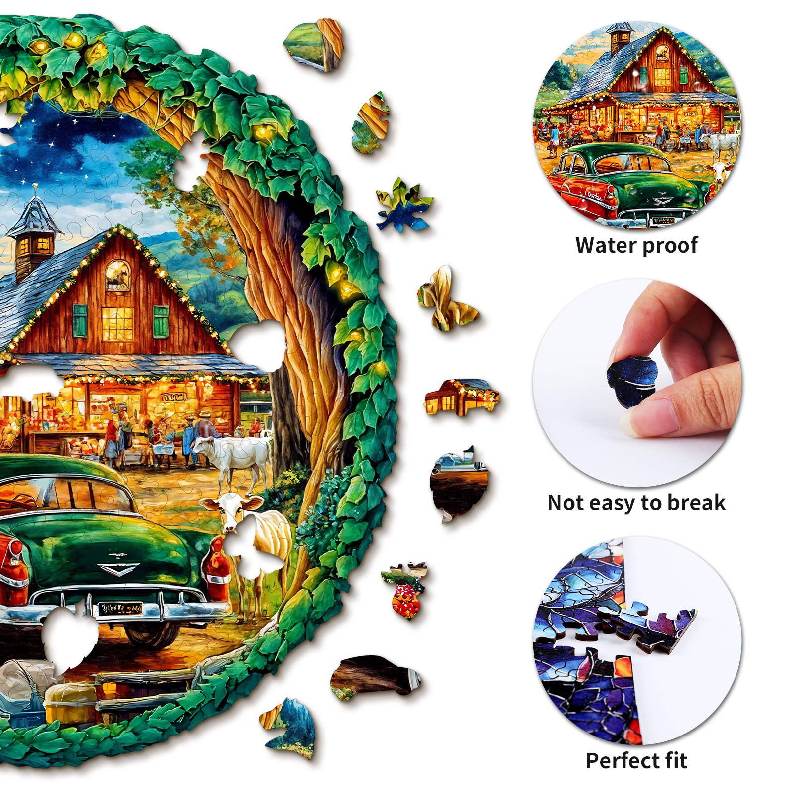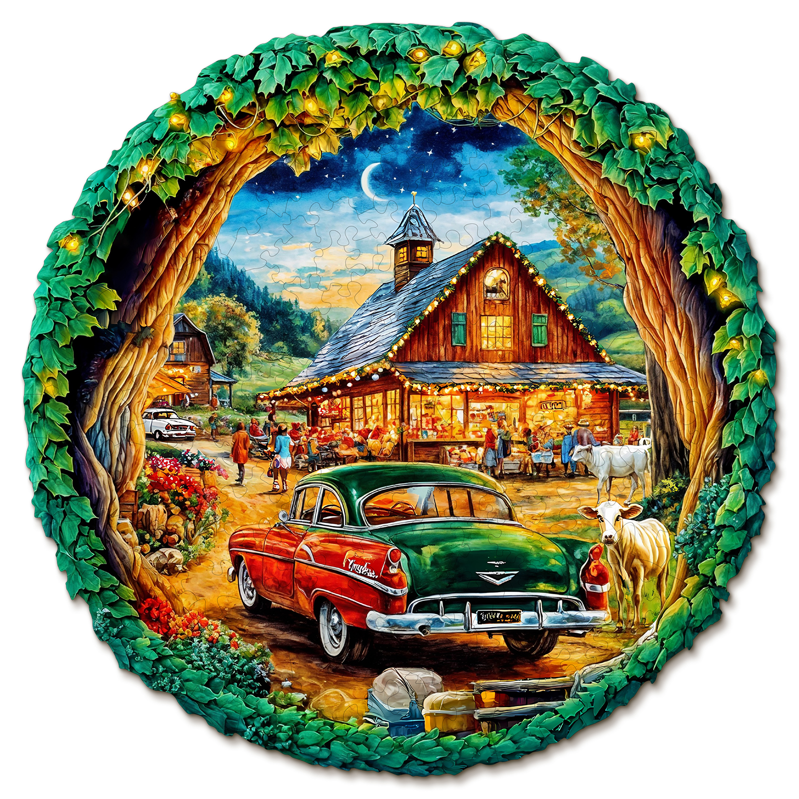 Celebrate the warmth of community and nostalgia with Kaayee’s Country Market Night Wooden Puzzle. This heartwarming circular design captures a lively evening at a rustic countryside store, glowing under string lights and a crescent moon. Classic cars, cheerful townsfolk, curious cows, and blooming flowers come together to create a scene full of charm and detail. Each wooden piece is precisely laser-cut and made from durable, eco-friendly materials—offering a fun challenge and a delightful escape into simpler times. Perfect for lovers of rural life, vintage vibes, and cozy storytelling.