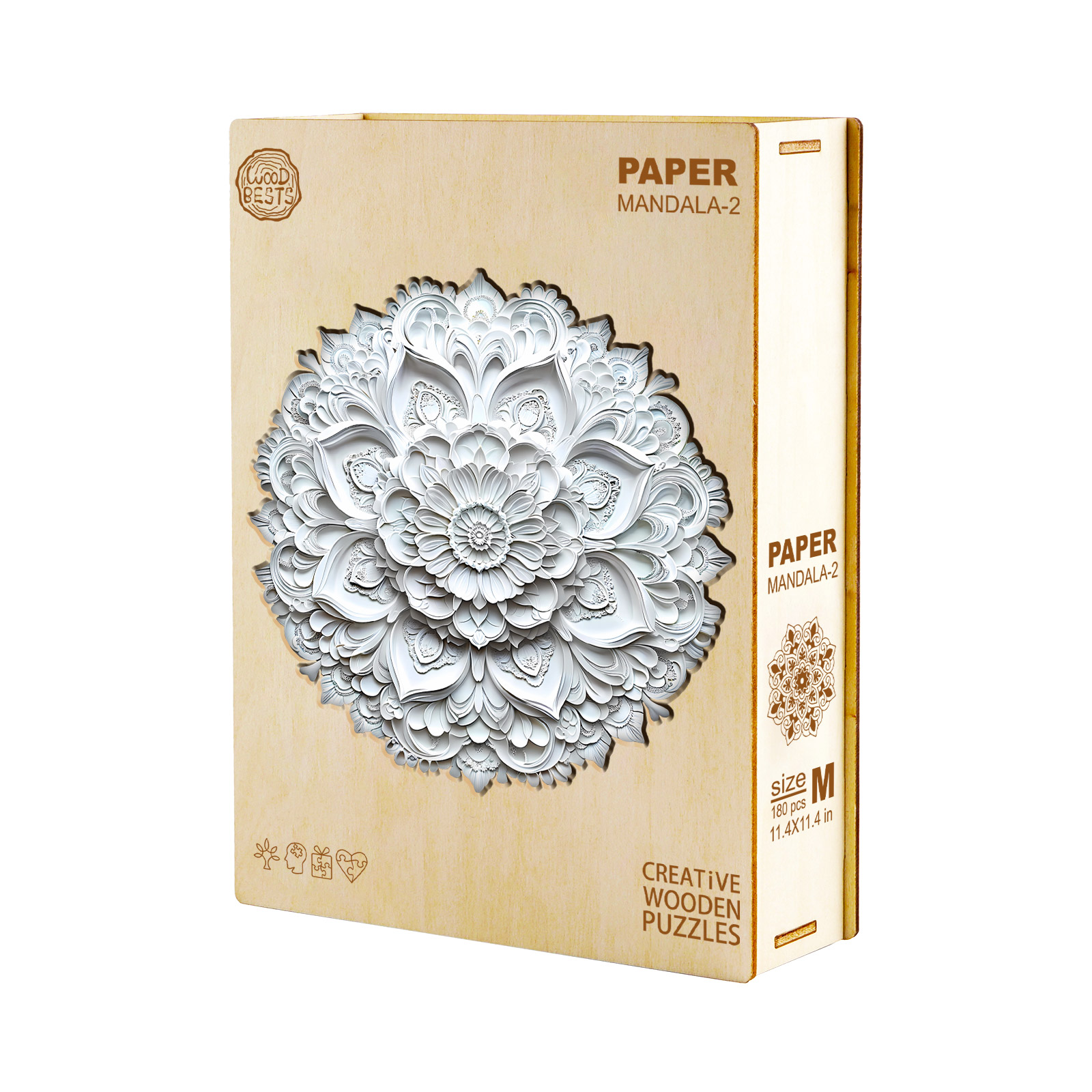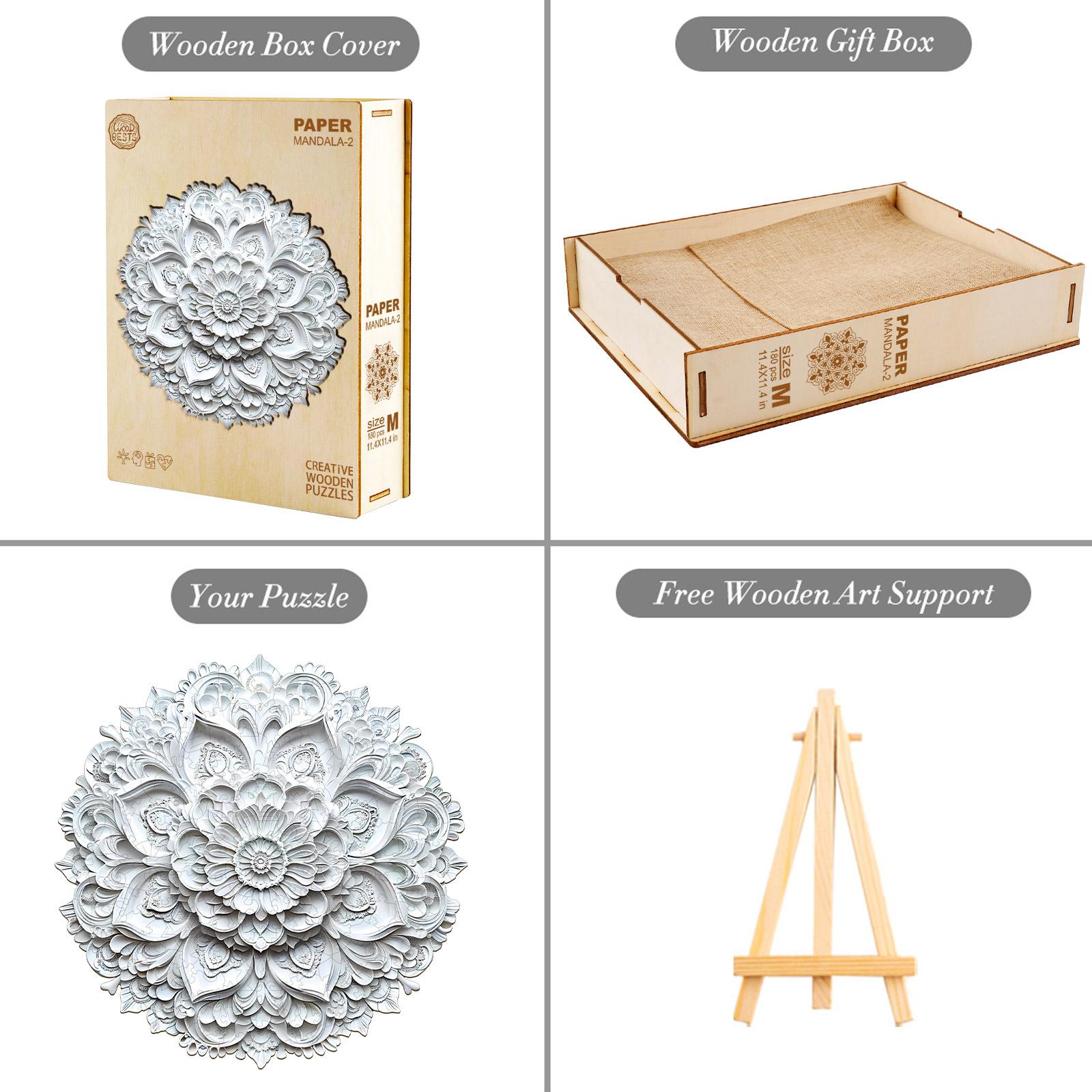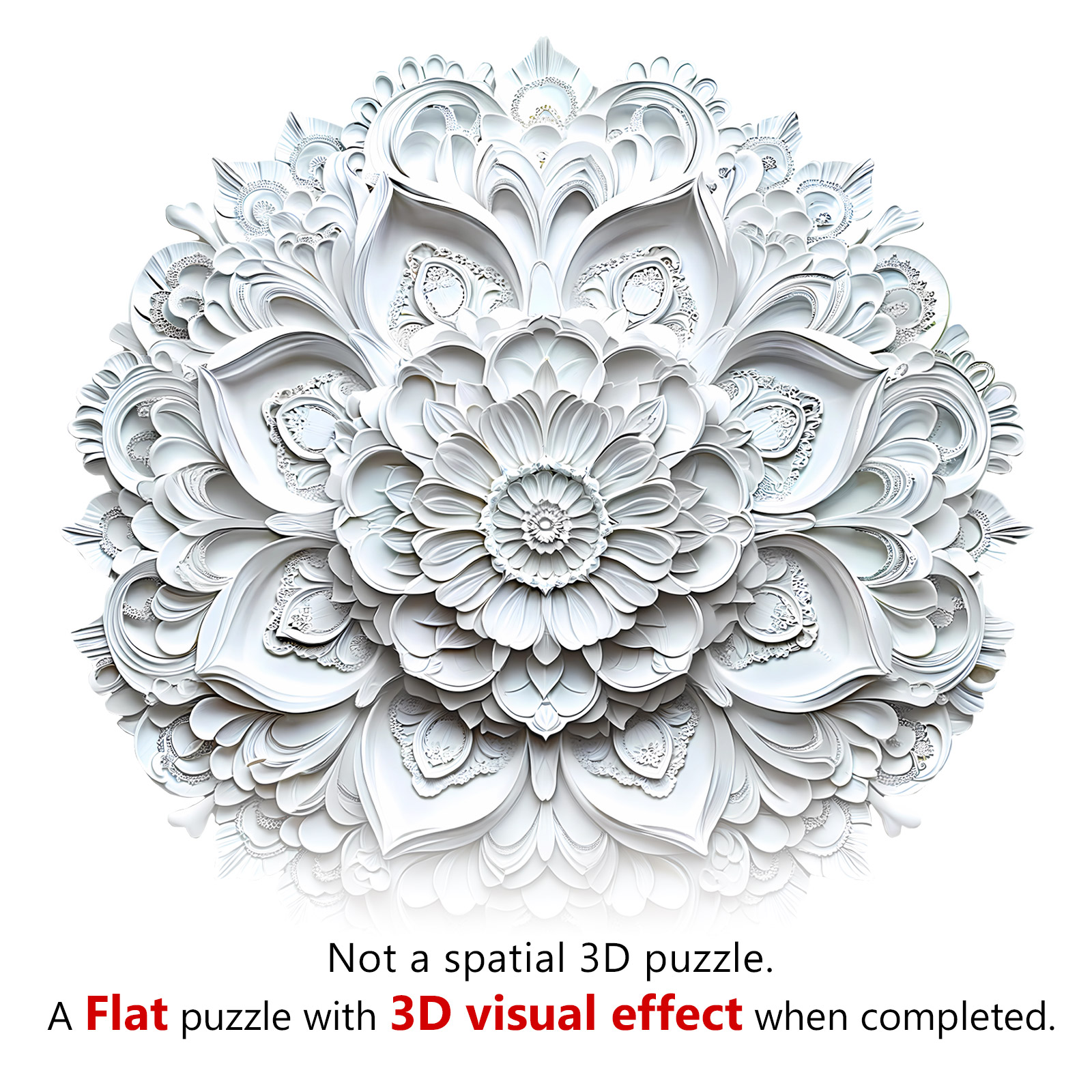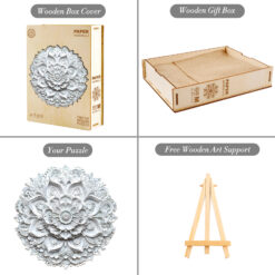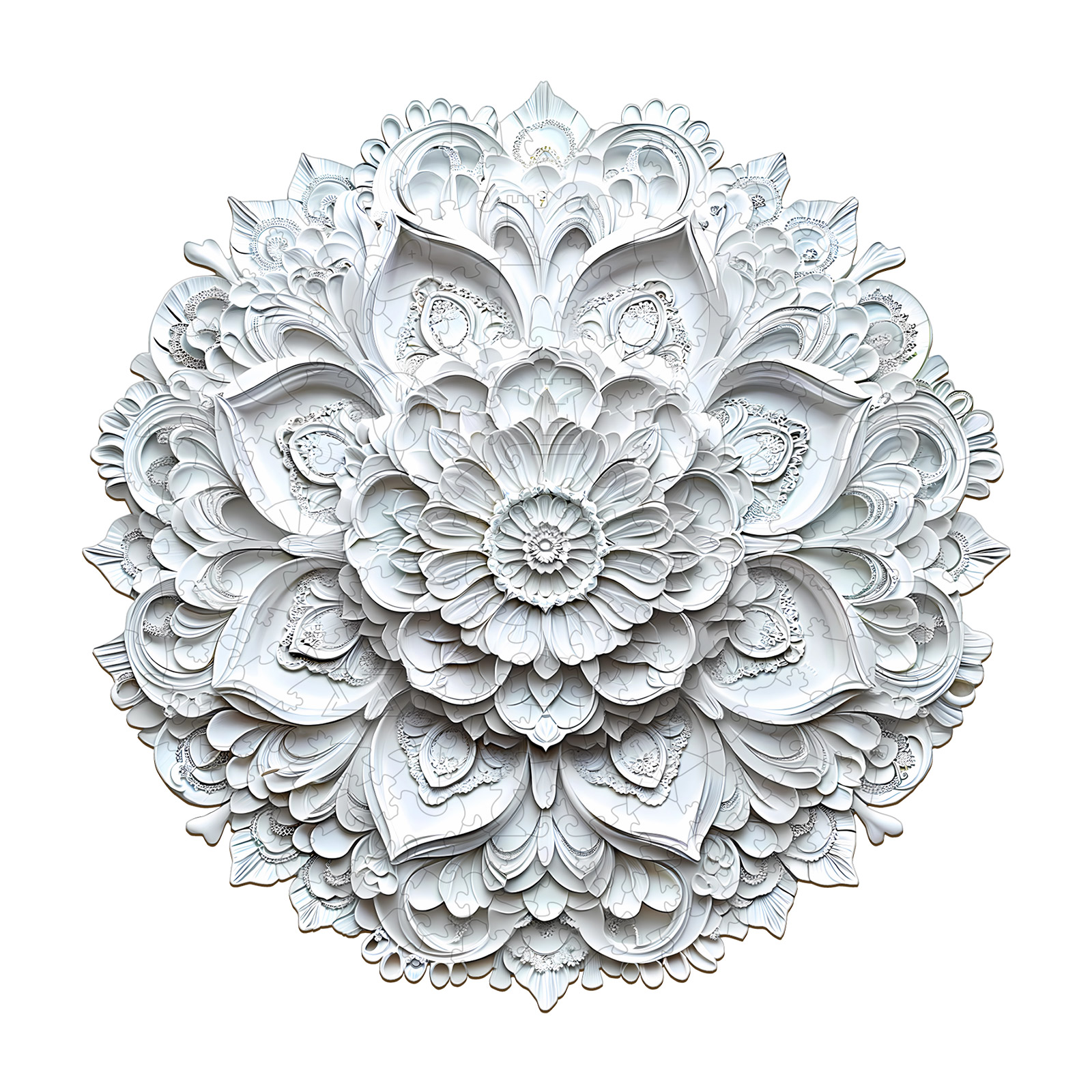 Elevate your puzzle experience with this breathtaking Kaayee wooden puzzle, showcasing an exquisitely detailed white floral mandala. This stunning design features multiple layers of intricately carved petals and swirling botanical motifs, creating a profound sense of depth and delicate artistry. The pristine white color emphasizes the subtle textures and precise craftsmanship of each unique wooden piece, inviting a meditative and focused assembly process. This puzzle is not just a challenge but a journey into intricate beauty, making it ideal for those who seek a sophisticated and calming activity, resulting in a beautiful piece of decorative art for their home.