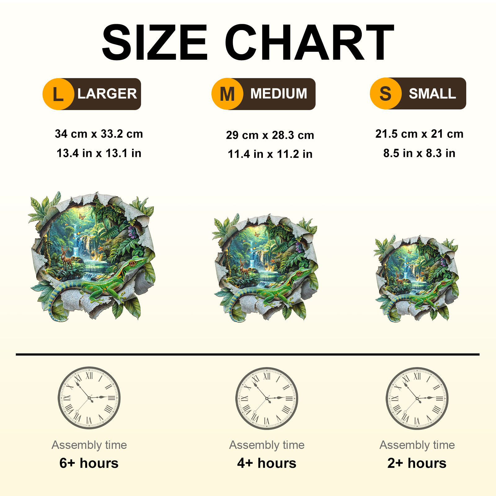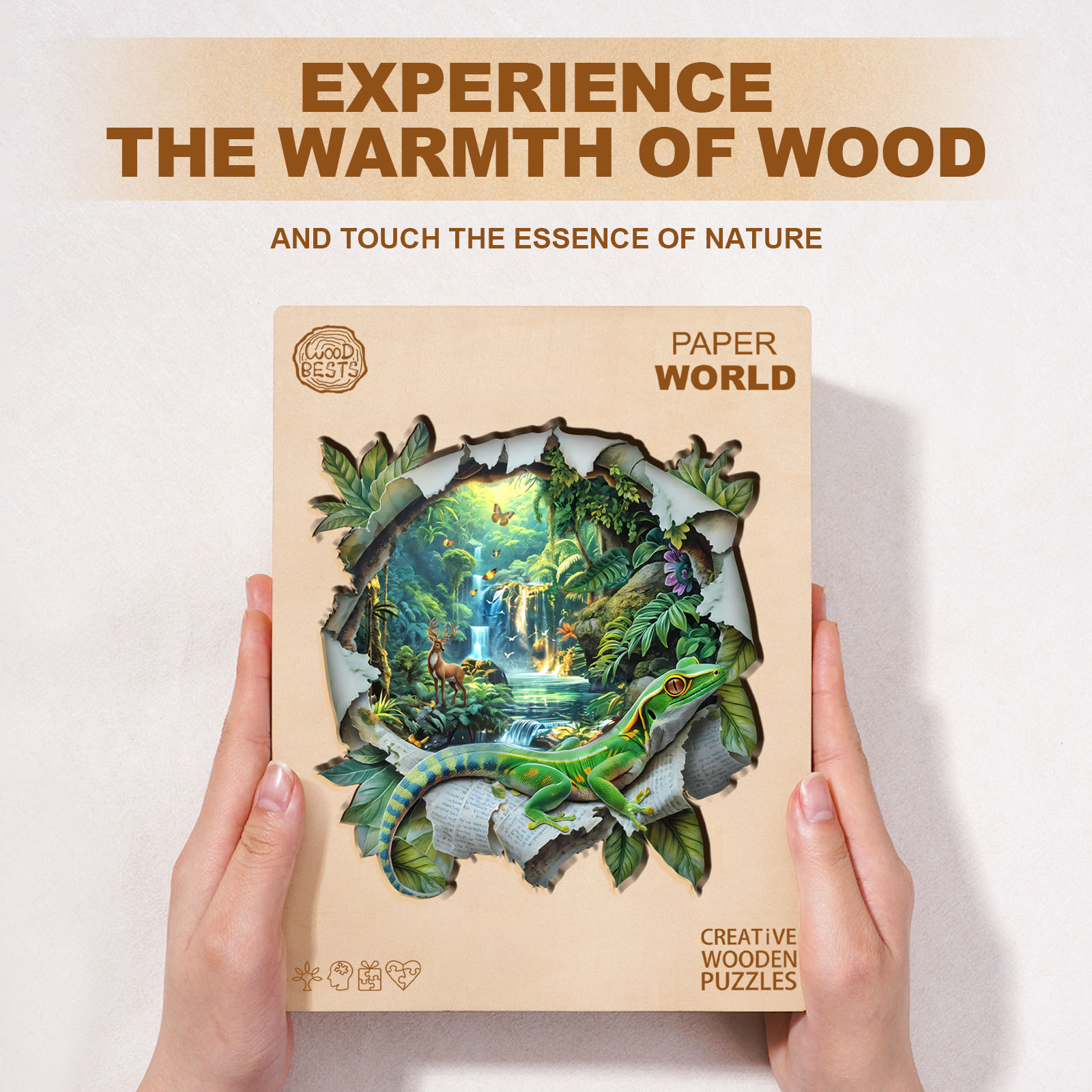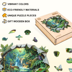 Discover the wild beauty of nature with this Kaayee wooden puzzle, featuring a vivid rainforest scene alive with detail. A graceful deer stands by a sparkling waterfall while butterflies and exotic birds flutter above. At the edge, a striking green lizard appears to crawl out of the puzzle itself, blurring the line between art and reality. Crafted from durable wood with precision-cut pieces, this puzzle combines creativity, challenge, and storytelling, making it an immersive experience for nature and puzzle enthusiasts alike.
