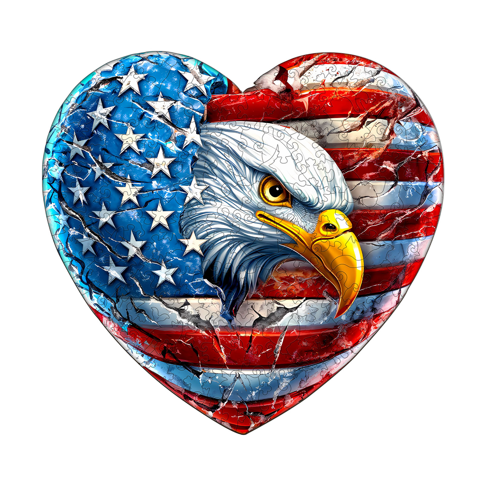 This unique heart-shaped wooden puzzle from Kaayee is a powerful and patriotic piece. The puzzle’s design features a striking bald eagle, a symbol of freedom and strength, with its head and piercing yellow eye at the center. The eagle is set against a backdrop of a distressed American flag, with the iconic stars and stripes pattern cracked and worn, adding a sense of history and resilience. The vibrant blues, reds, and whites, along with the detailed rendering of the eagle, make this a captivating and meaningful puzzle. Made from high-quality wood, this puzzle is a wonderful tribute to American pride and makes a perfect gift for patriots or a beautiful decorative item.