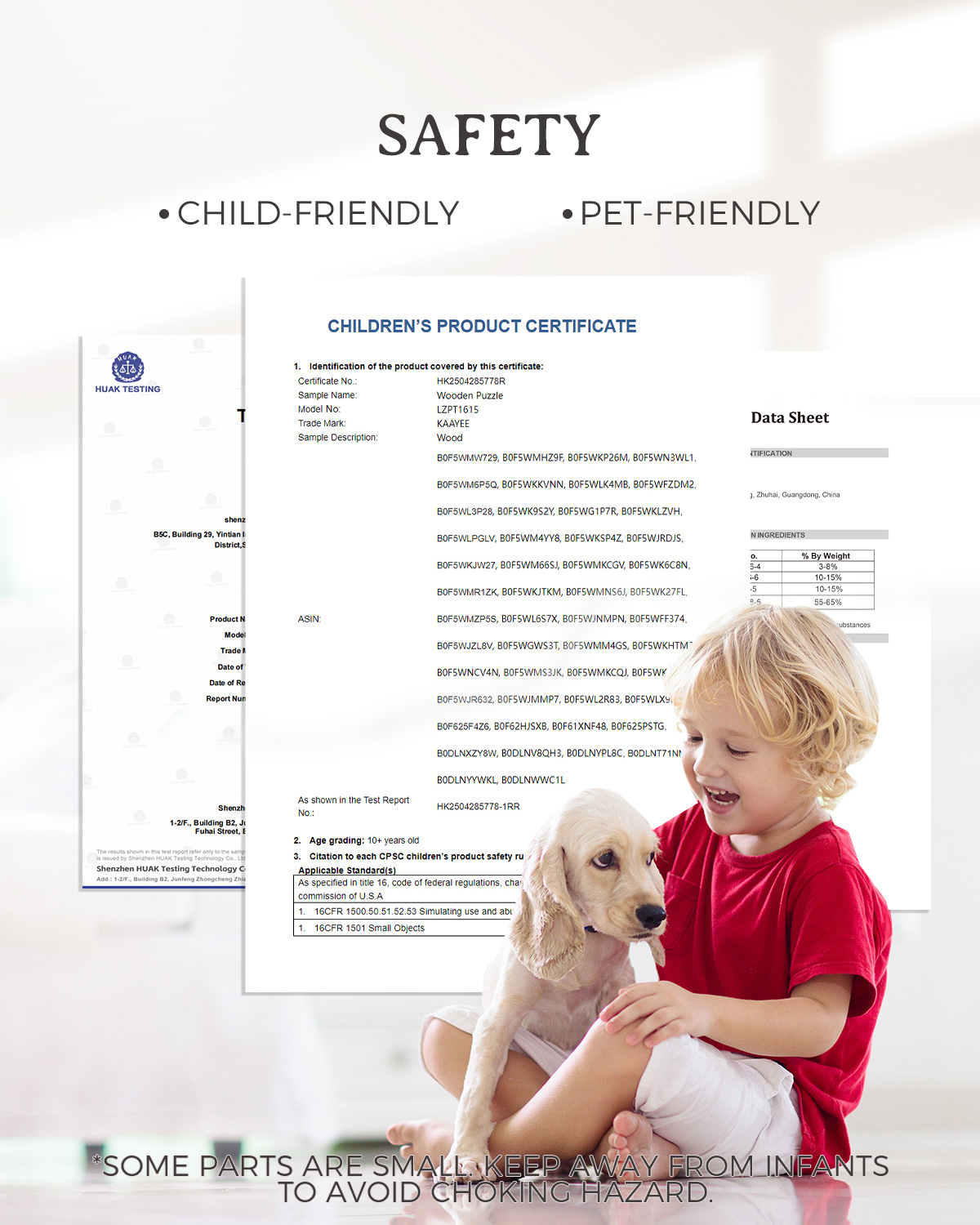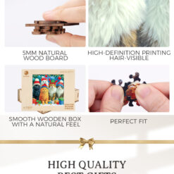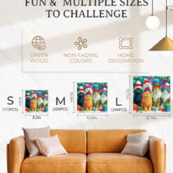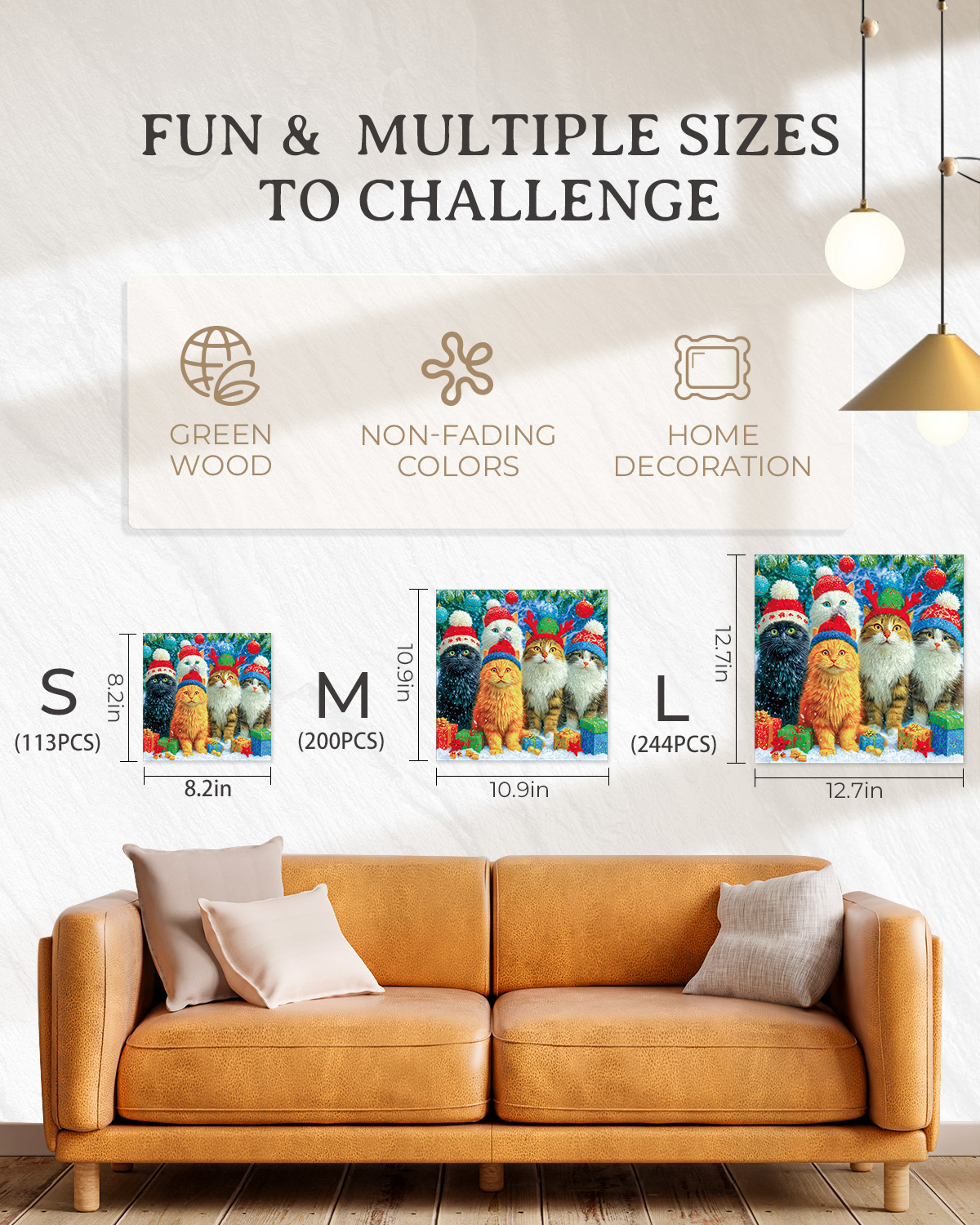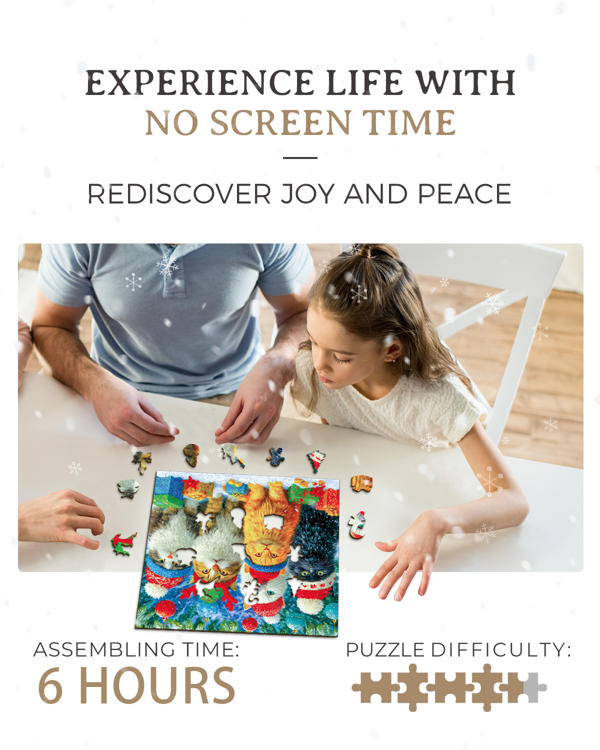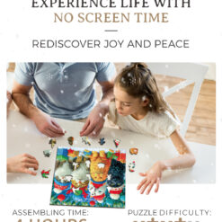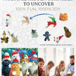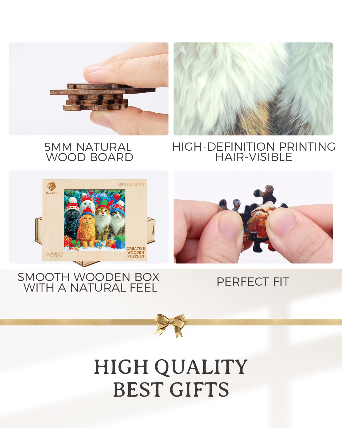 This charming Kaayee wooden puzzle features a festive, winter-themed scene with a group of five adorable cats. Each cat is dressed in a holiday hat, from cozy knitted beanies to fun reindeer antlers, as they pose among colorful presents and snow-covered pine branches. The vibrant colors and playful expressions of the cats make this puzzle a perfect choice for cat lovers and anyone looking to get into the holiday spirit. The unique shapes of the wooden pieces add to the fun and challenge of this delightful Christmas puzzle.