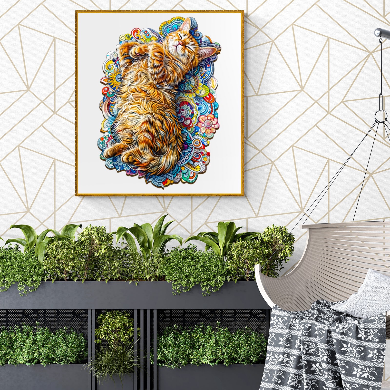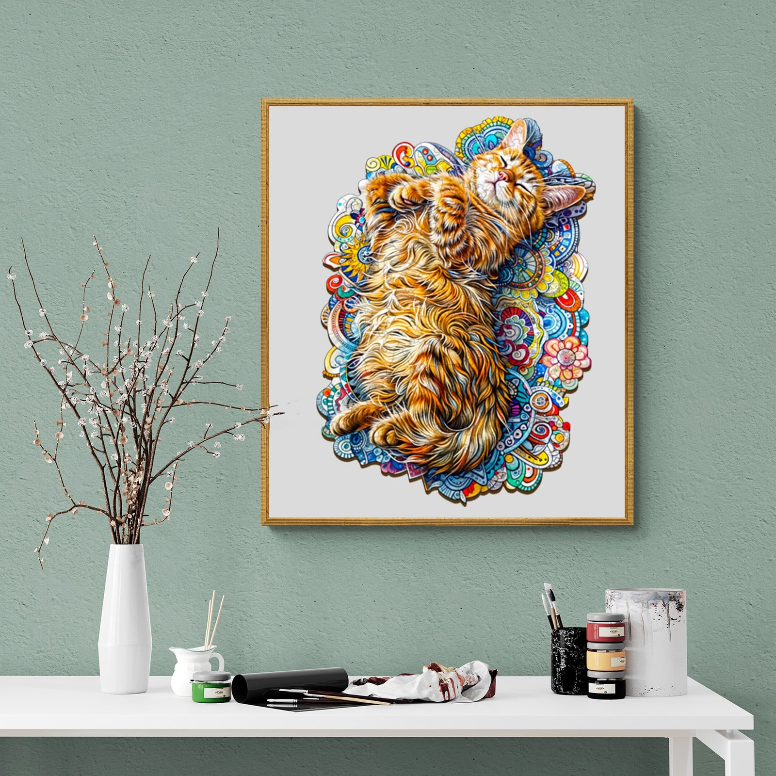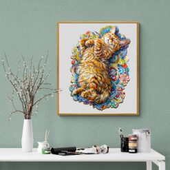 A tabby cat lies sprawled on a colorful blanket, its soft belly exposed to the warmth of the room. The blanket, a vibrant mix of reds, blues, and yellows, contrasts beautifully with the cat’s striped fur. The cat’s paws are lazily curled, and its eyes are closed in peaceful slumber, ears twitching occasionally in a dream. Sunlight filters through the window, casting a gentle glow on the scene. The cat’s breathing is slow and rhythmic, creating a sense of calm and contentment, as it basks in the comfort of its cozy, colorful resting place