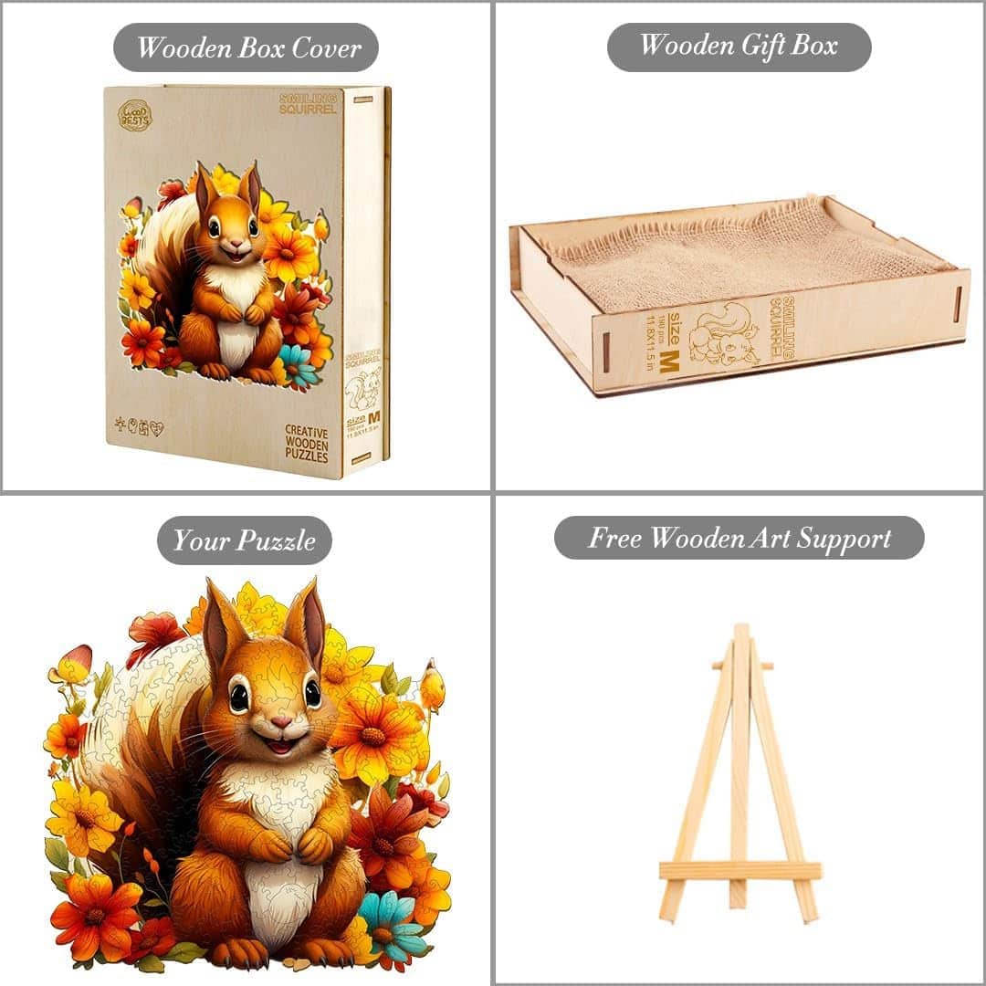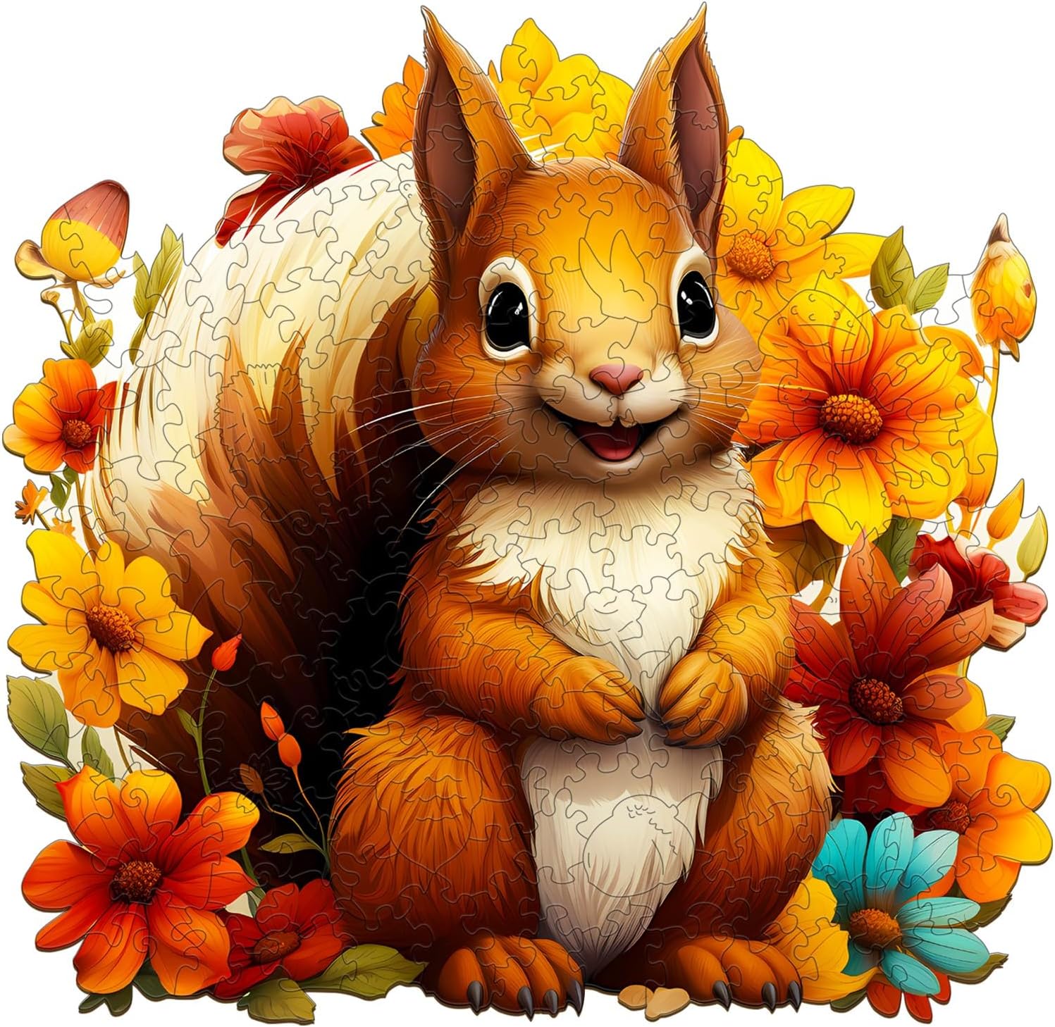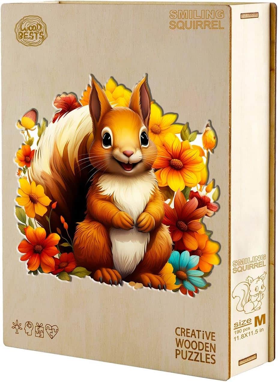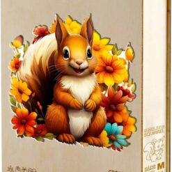 The Smiling Squirrel wooden puzzle features an adorable squirrel with a cheerful expression, holding an acorn amidst a vibrant forest setting. The puzzle beautifully captures the playful nature of this woodland creature, with rich autumnal colors and intricate detailing of the squirrel’s fur and surroundings. Each piece is carefully crafted from high-quality wood, ensuring durability and an enjoyable puzzle experience. Perfect for nature lovers and puzzle enthusiasts, this design brings the charm of the forest into your home, offering a delightful challenge while celebrating the joyful spirit of a smiling squirrel in its natural habitat