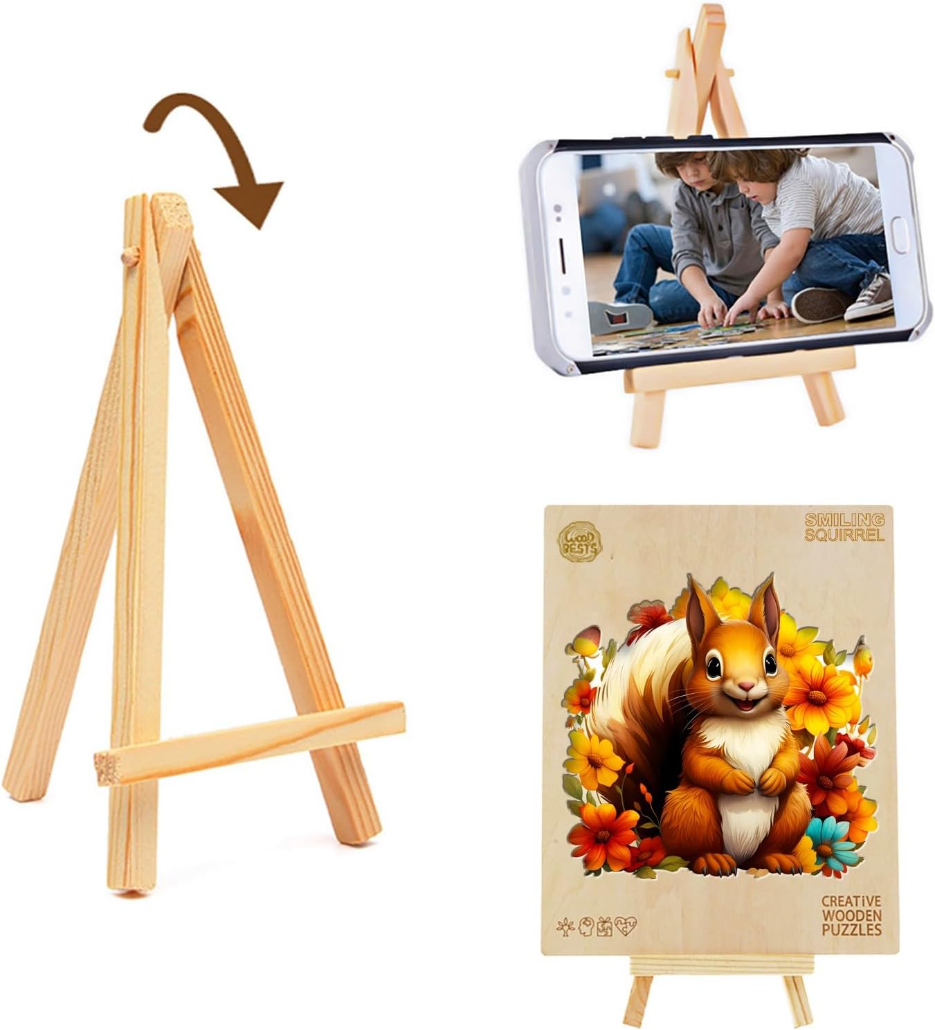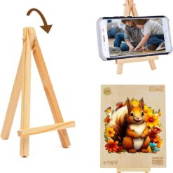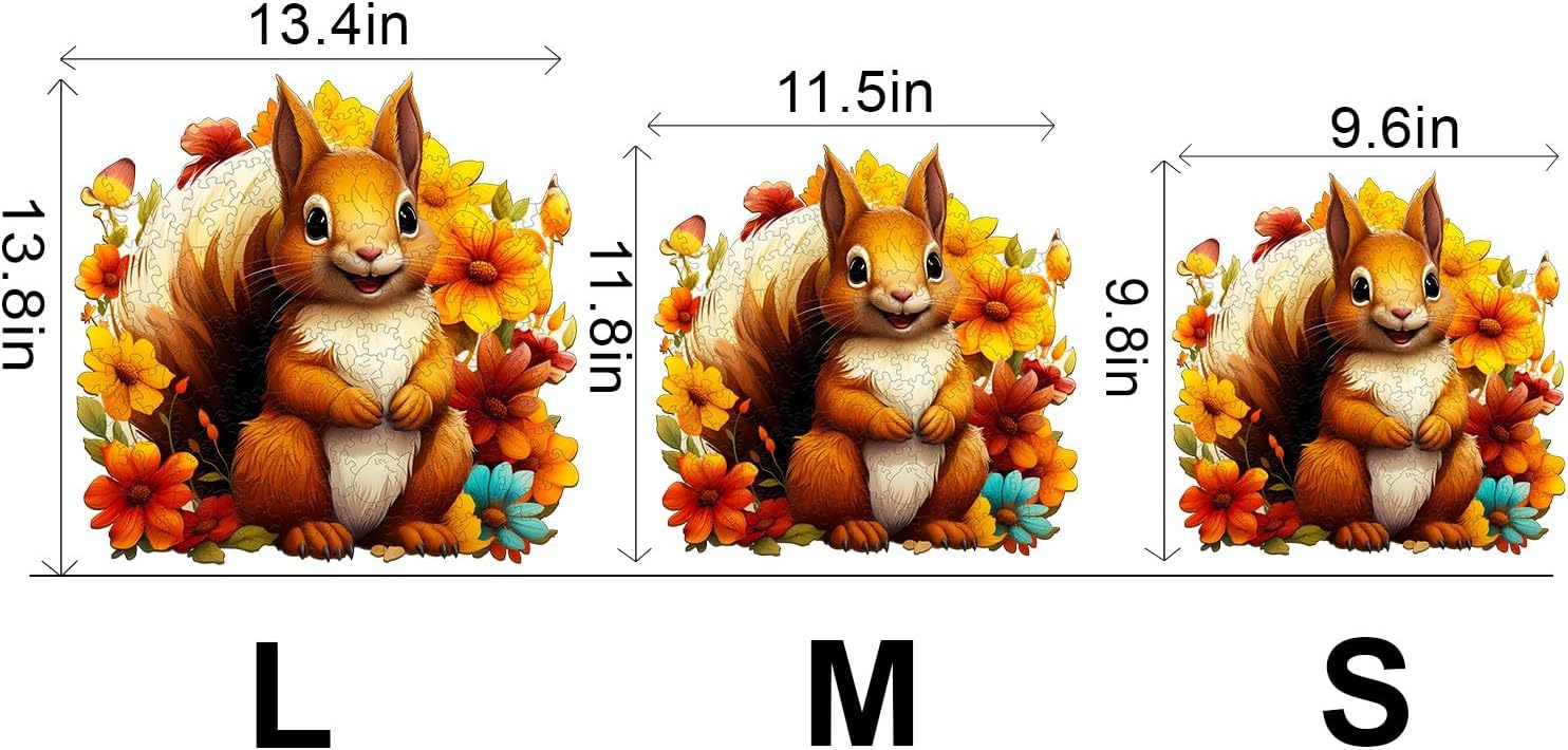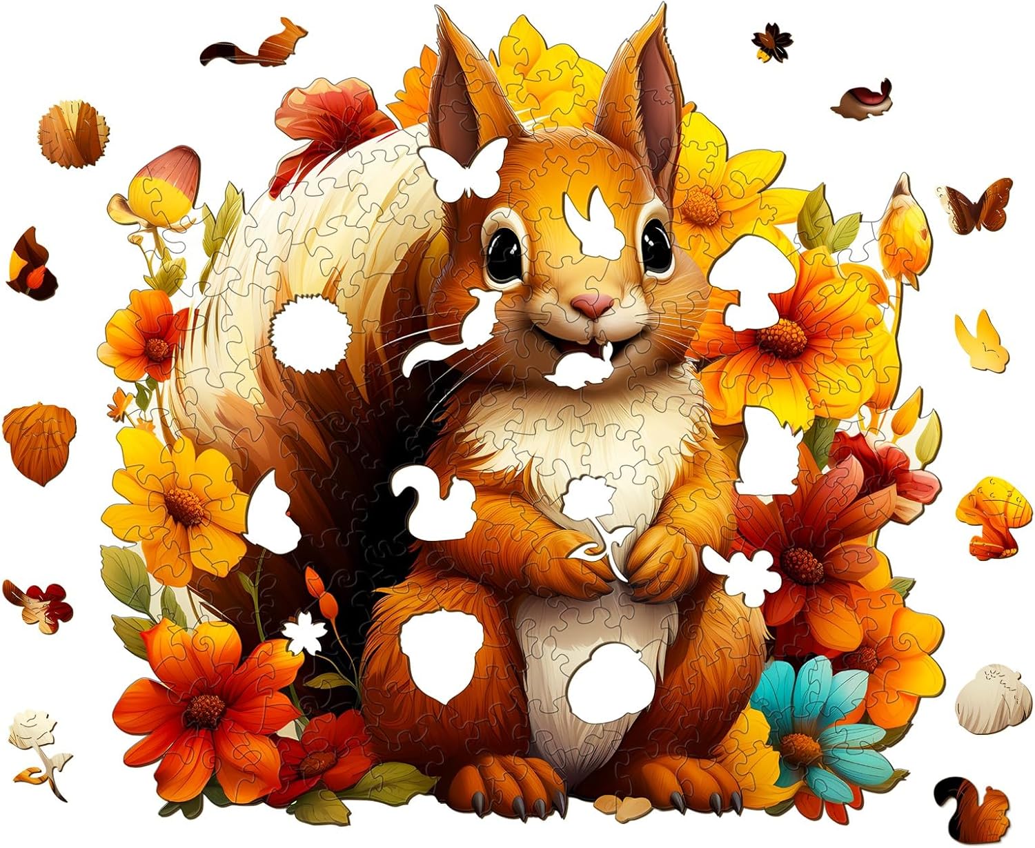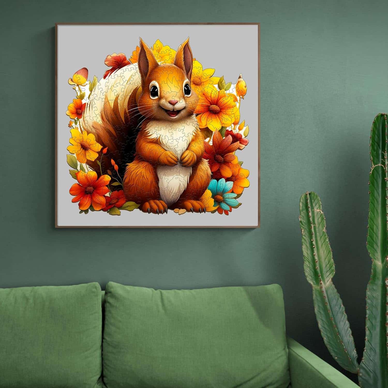 The Smiling Squirrel wooden puzzle features an adorable squirrel with a cheerful expression, holding an acorn amidst a vibrant forest setting. The puzzle beautifully captures the playful nature of this woodland creature, with rich autumnal colors and intricate detailing of the squirrel’s fur and surroundings. Each piece is carefully crafted from high-quality wood, ensuring durability and an enjoyable puzzle experience. Perfect for nature lovers and puzzle enthusiasts, this design brings the charm of the forest into your home, offering a delightful challenge while celebrating the joyful spirit of a smiling squirrel in its natural habitat