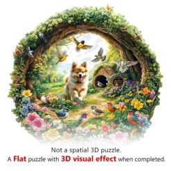 This exquisite wooden jigsaw puzzle features a heartwarming scene of a cheerful dog surrounded by a lush garden teeming with vibrant flowers and lively birds. The circular design frames an enchanting woodland setting, where a cozy burrow nestled in the greenery adds a touch of whimsy. Each uniquely crafted wooden piece fits together seamlessly, offering a satisfying and engaging puzzle experience. With its rich colors and intricate details, this puzzle is perfect for nature lovers, dog enthusiasts, and anyone who enjoys a delightful challenge. Once completed, it becomes a stunning decorative piece, capturing the beauty of a peaceful, storybook-like paradise.