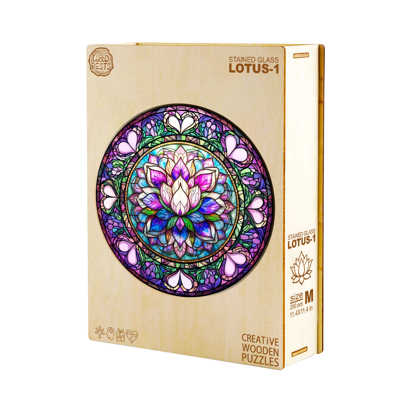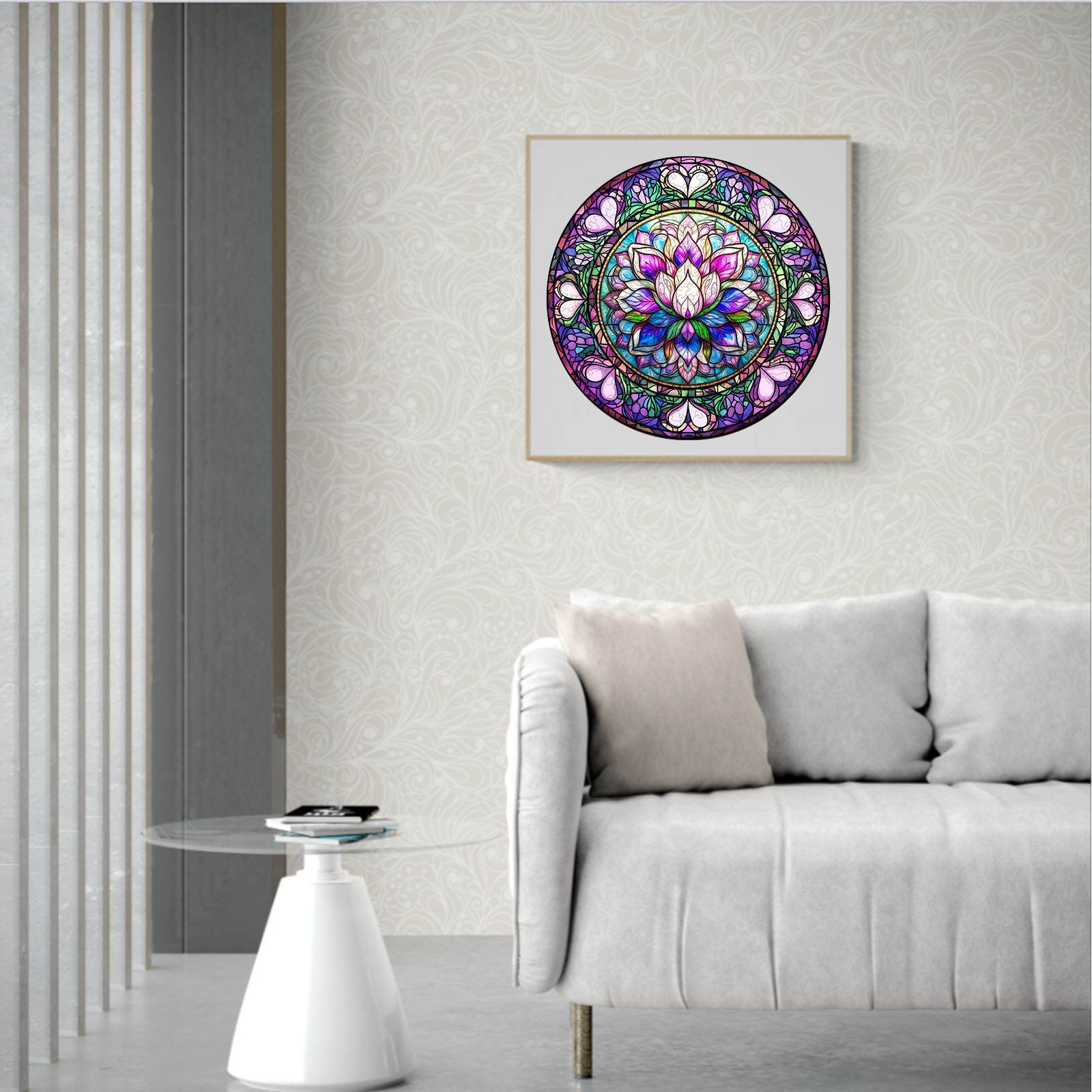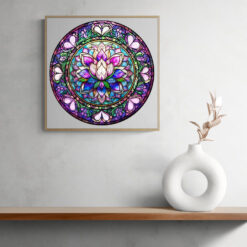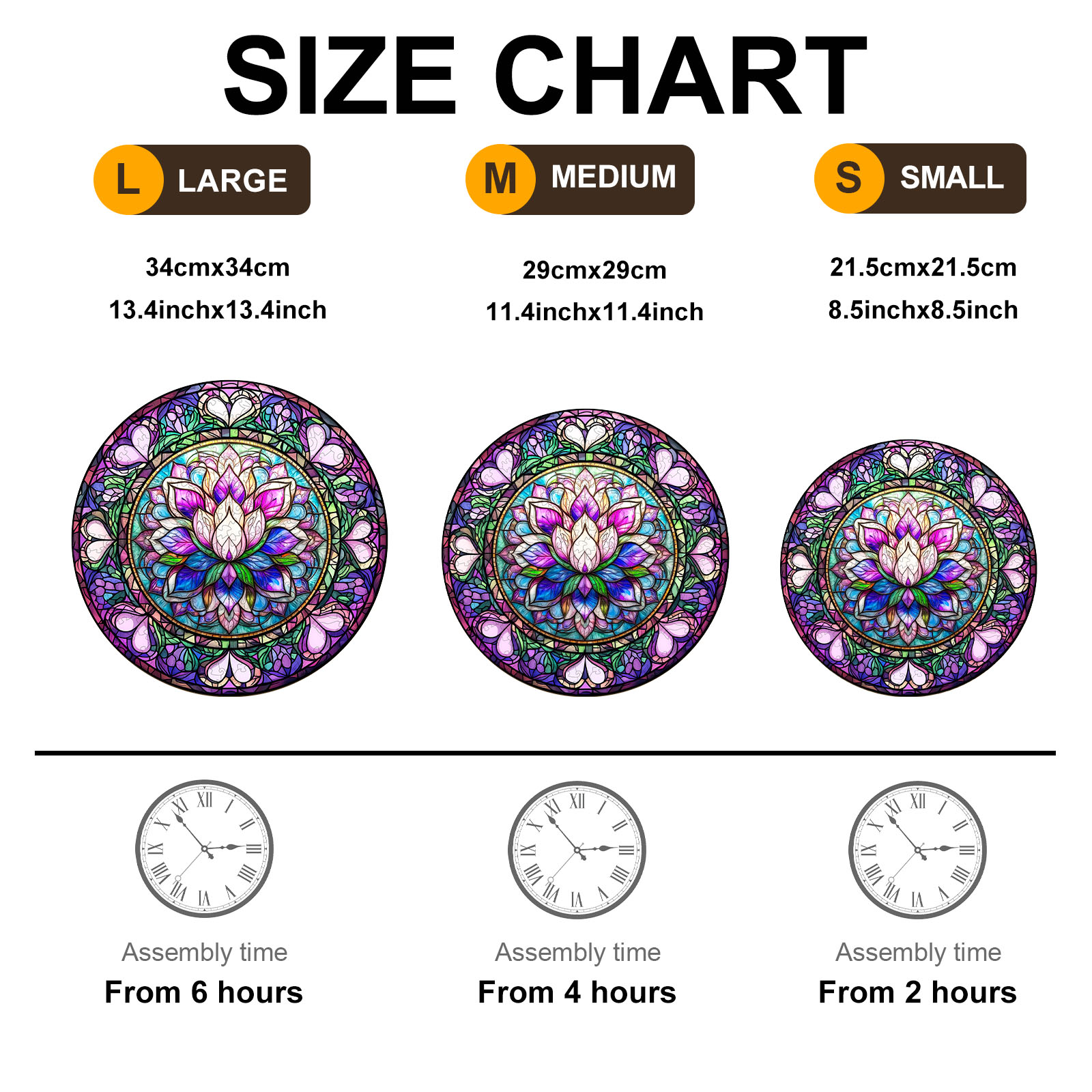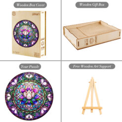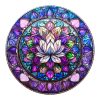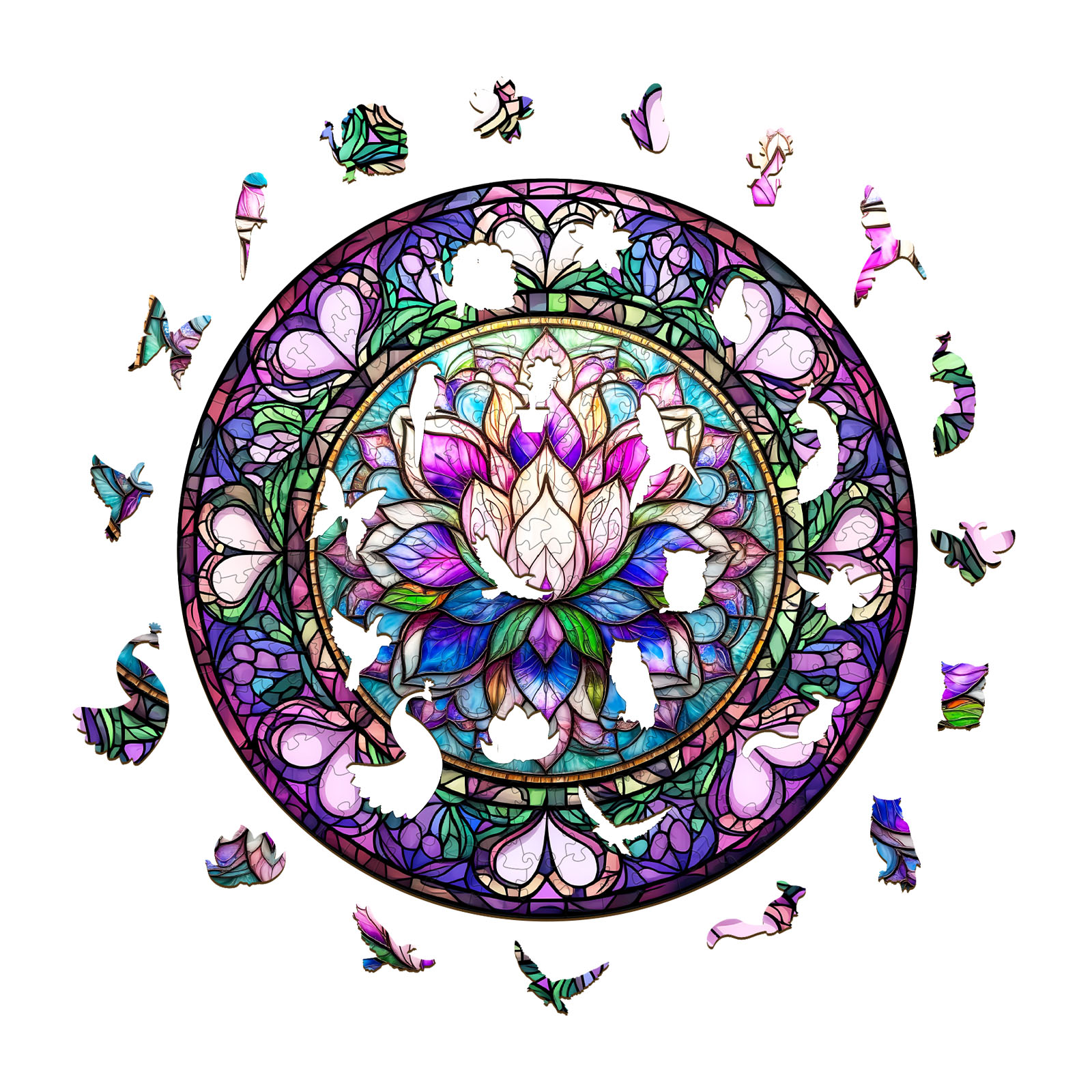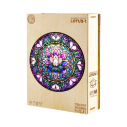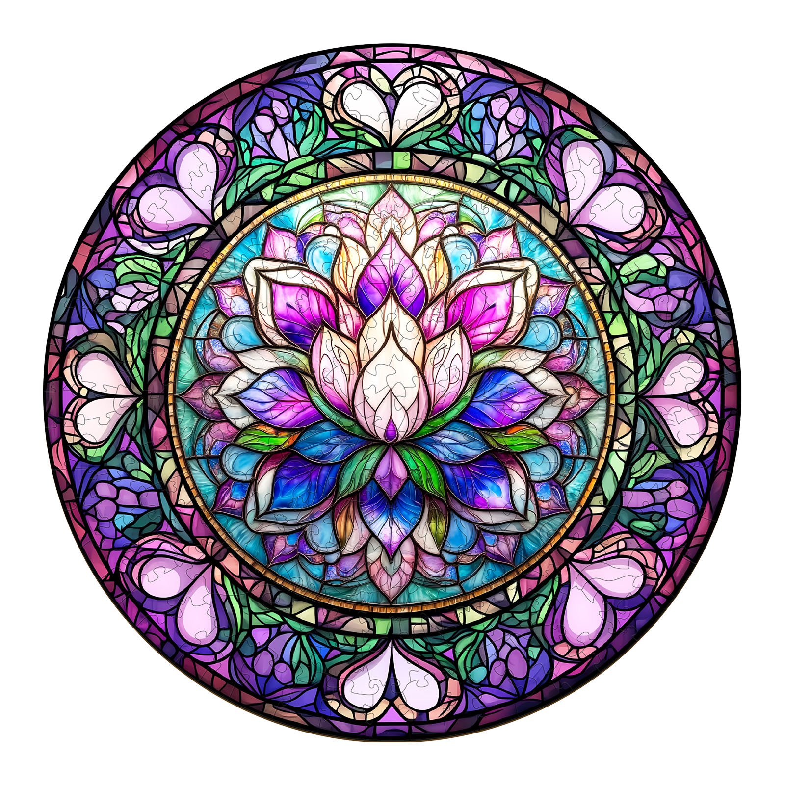 Immerse yourself in the elegance of sacred geometry with this breathtaking stained glass-style wooden puzzle. Designed in the form of a radiant mandala, the puzzle features a vivid lotus at its center, surrounded by intricate heart motifs and floral patterns in a kaleidoscope of purples, blues, greens, and pinks. Crafted from high-quality wood with laser-cut precision, each piece fits seamlessly to form an enchanting circular masterpiece. This puzzle is perfect for those who love art, mindfulness, and a touch of meditative challenge. A stunning décor piece when completed, it’s a journey of color, calm, and creativity.
