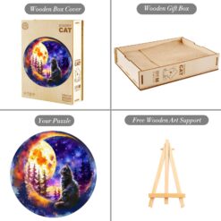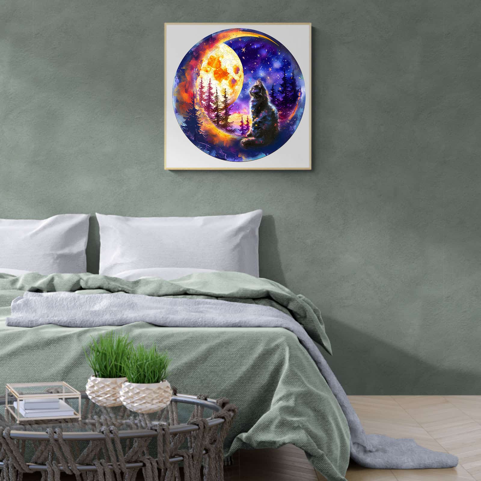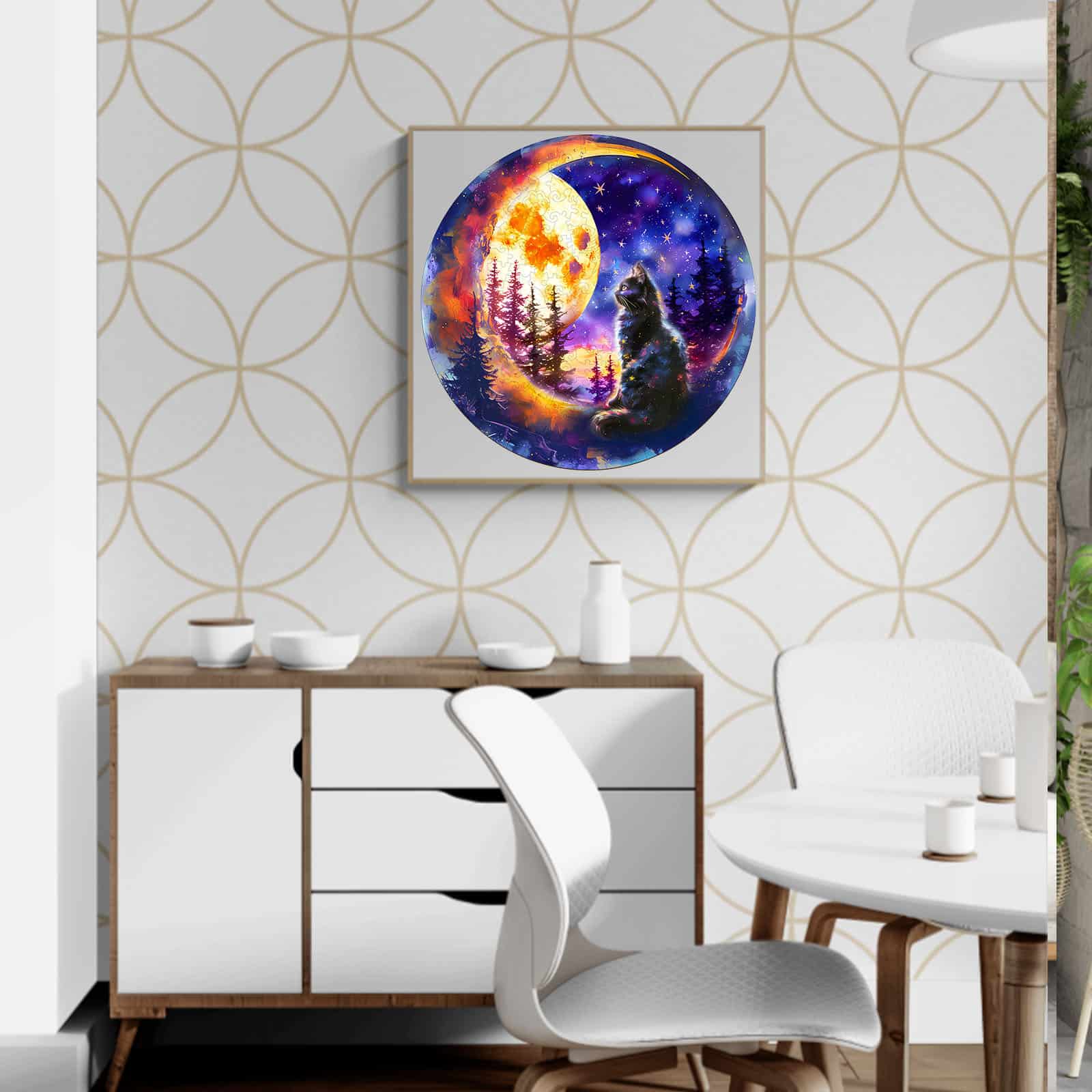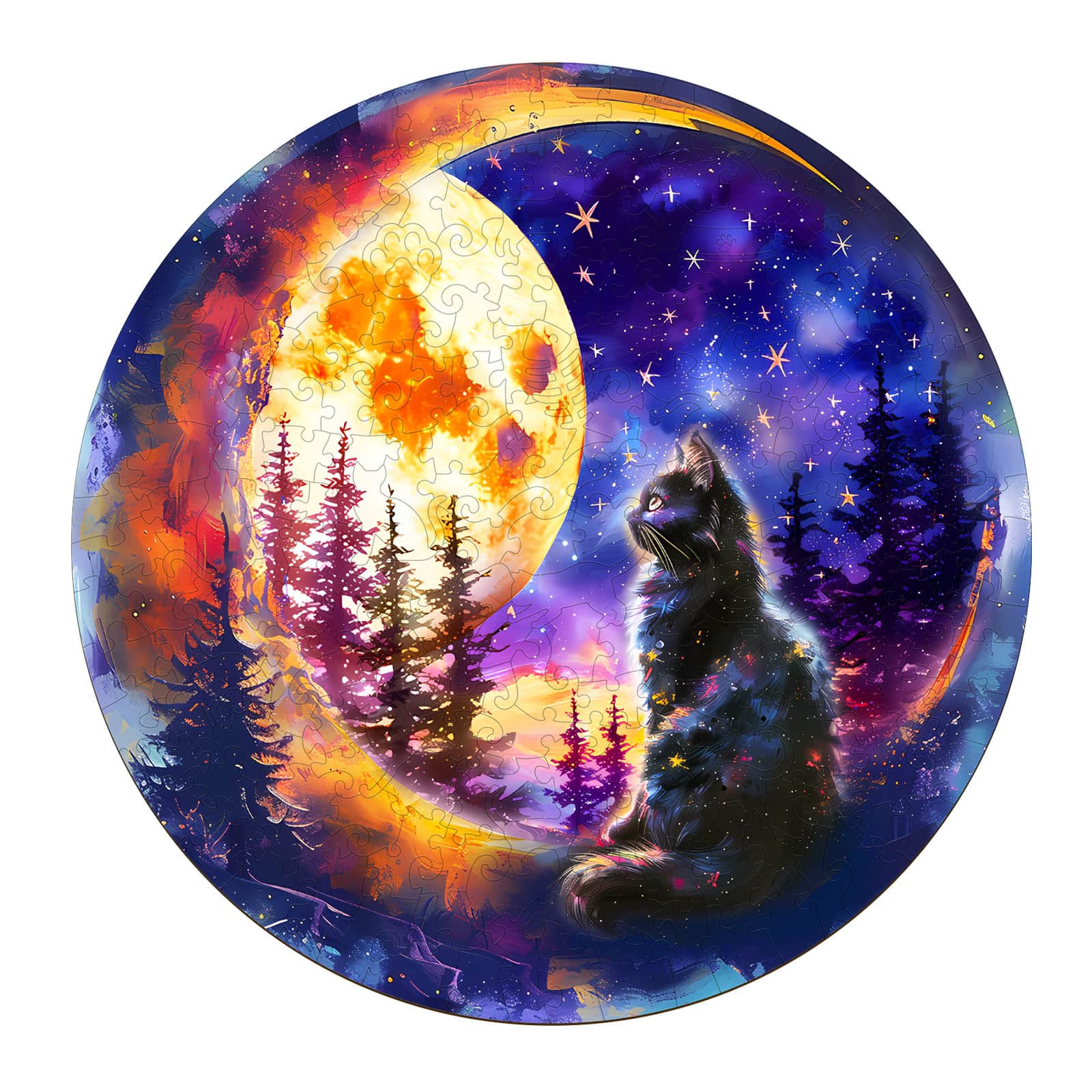 The puzzle features a mystical, black cat gazing up at the night sky, illuminated by the glow of a giant crescent moon. The celestial backdrop is rich in hues of deep purples and blues, dotted with twinkling stars and surrounded by silhouetted pine trees. The moon shines brightly, casting a golden glow over the scene, with vibrant swirls of orange and pink in the surrounding sky. The cat, sleek and serene, appears almost cosmic, as if it is one with the universe, creating a magical, dreamlike atmosphere full of wonder