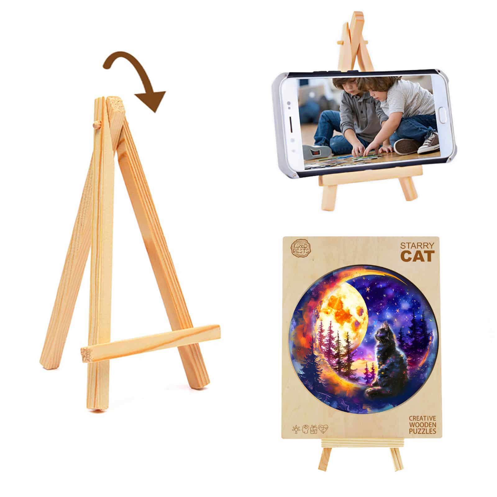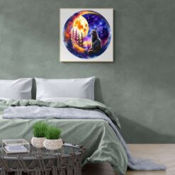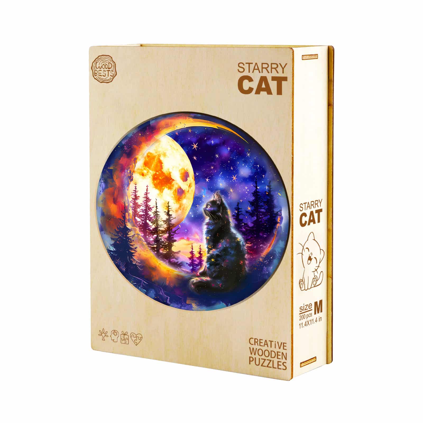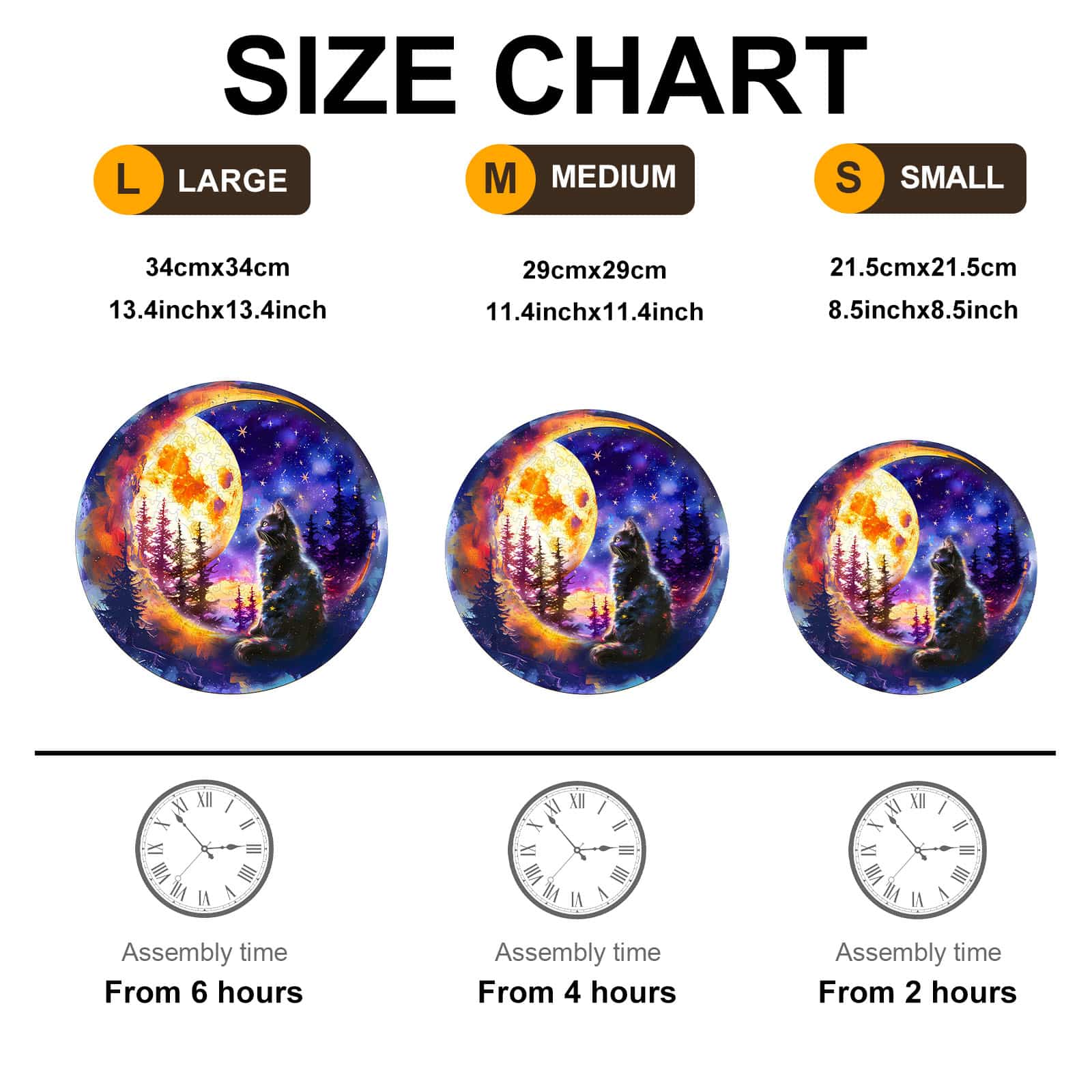 The puzzle features a mystical, black cat gazing up at the night sky, illuminated by the glow of a giant crescent moon. The celestial backdrop is rich in hues of deep purples and blues, dotted with twinkling stars and surrounded by silhouetted pine trees. The moon shines brightly, casting a golden glow over the scene, with vibrant swirls of orange and pink in the surrounding sky. The cat, sleek and serene, appears almost cosmic, as if it is one with the universe, creating a magical, dreamlike atmosphere full of wonder