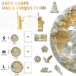 This elegant Kaayee wooden puzzle presents a sophisticated, monochromatic depiction of New York City, rendered with the intricate detail of a sculpted relief. The majestic Statue of Liberty stands prominently in the foreground, her torch held high, casting a soft glow that subtly illuminates the scene. Behind her, a stylized cityscape with towering skyscrapers rises against a textured sky dotted with clouds, evoking the iconic New York skyline. The entire circular composition is beautifully framed by lush, highly detailed trees, foliage, and blooming flowers, all in shades of cream and gold, giving the impression of a classical carving or an exquisite piece of porcelain art.