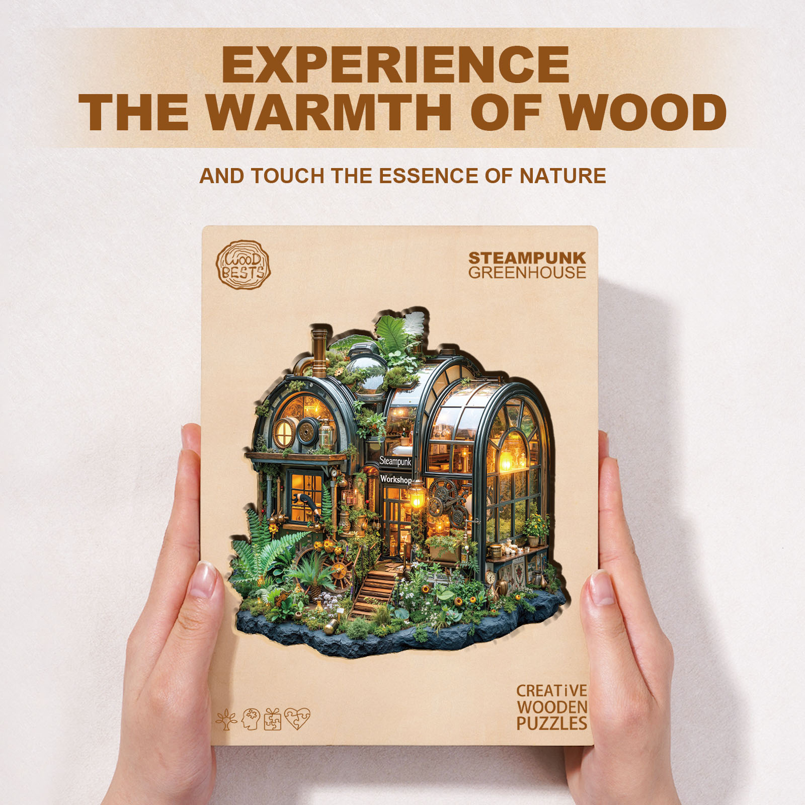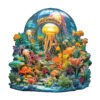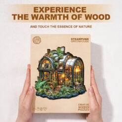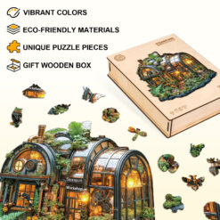 This incredible Kaayee wooden puzzle features a detailed and imaginative “Steampunk Greenhouse.” The puzzle’s design is a blend of lush greenery and intricate machinery, showcasing a Victorian-style workshop with curved glass panels, pipes, gears, and gauges. The greenhouse is lit from within, giving it a warm, inviting glow that contrasts with the mechanical details. The surrounding foliage is rich with diverse plants, and the entire structure rests on a textured, rocky base. The puzzle’s unique, irregular shape outlines the building, making it a challenging and visually stunning piece. It’s a perfect gift for fans of steampunk, fantasy, and intricate, artistic designs.