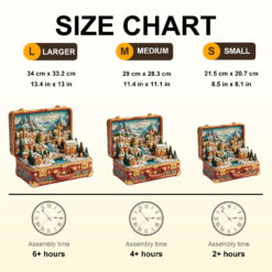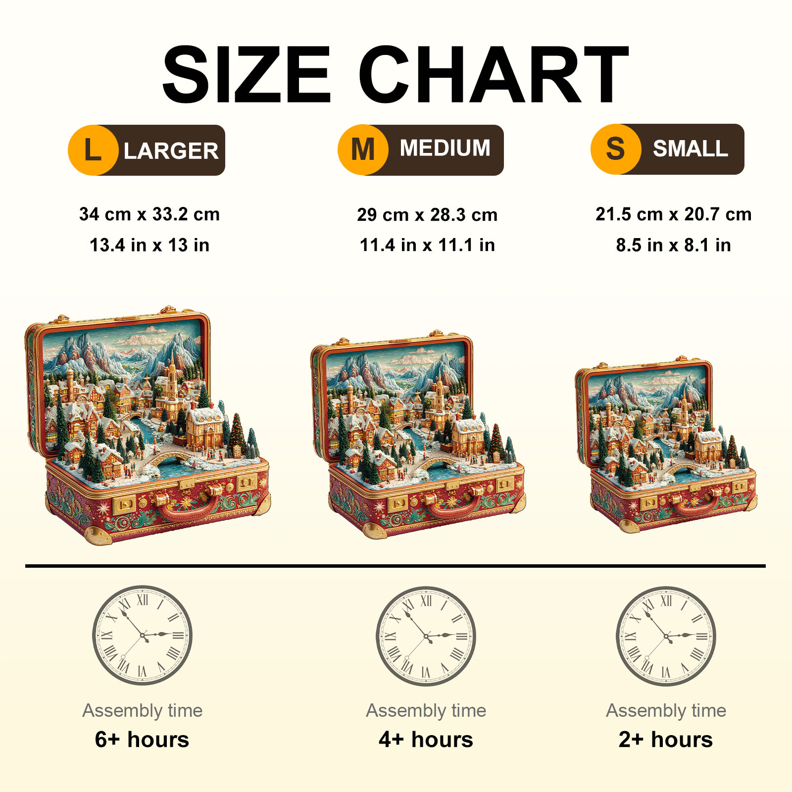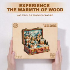This beautiful Kaayee wooden puzzle features a magical Christmas scene captured within a vintage suitcase. The puzzle’s design unfolds to reveal a cozy, snow-covered village nestled in a mountain valley, with a river flowing through it. The houses are glowing with warm light, and tiny figures can be seen strolling across bridges and through the streets. The suitcase itself is intricately decorated with festive patterns. The irregular shape of the puzzle outlines the open suitcase, making it a unique and charming challenge. It’s a perfect gift for travelers and anyone who loves the nostalgic charm of the holiday season.