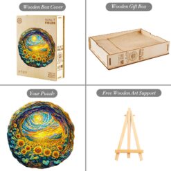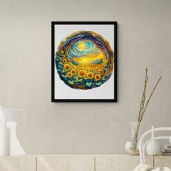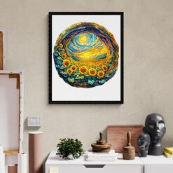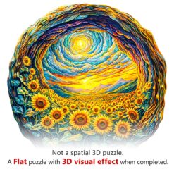 Immerse yourself in the vivid beauty of nature with this Premium Wooden Jigsaw Puzzle, featuring a breathtaking 3D sunflower field illuminated by a vibrant sunset framed within a natural arch. This artwork is a celebration of life, light, and the wonders of nature, making it a perfect addition to your puzzle collection.Experience the joy of bringing a radiant sunflower field to life with this 3D Sunflower Serenity Puzzle, a perfect blend of art, challenge, and relaxation.