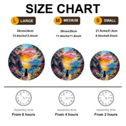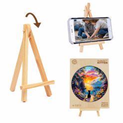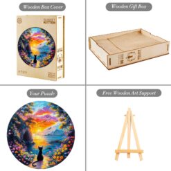 The Sunset Kitten wooden puzzle features a captivating circular design that invites you into a tranquil, colorful scene. At its center, a black kitten gazes peacefully at a breathtaking sunset, surrounded by vibrant flowers and framed by a calm sea and majestic cliffs. The sky is awash with hues of orange, pink, and purple, blending seamlessly into the serene water. Birds soar overhead, enhancing the dreamlike atmosphere. This puzzle’s intricate details and stunning colors make it a delightful challenge, perfect for nature and cat lovers alike. It brings a sense of calm and wonder to any puzzle enthusiast’s collection