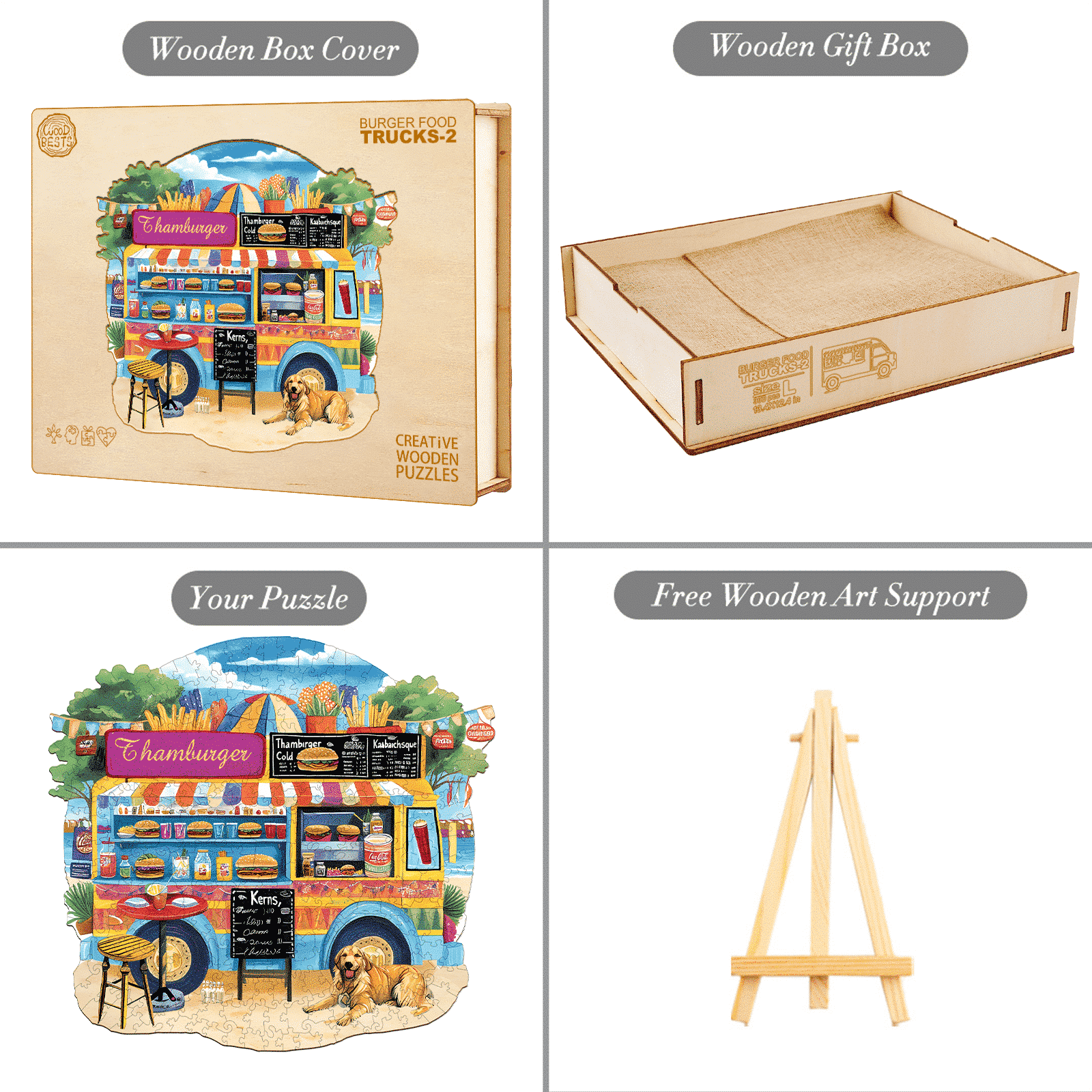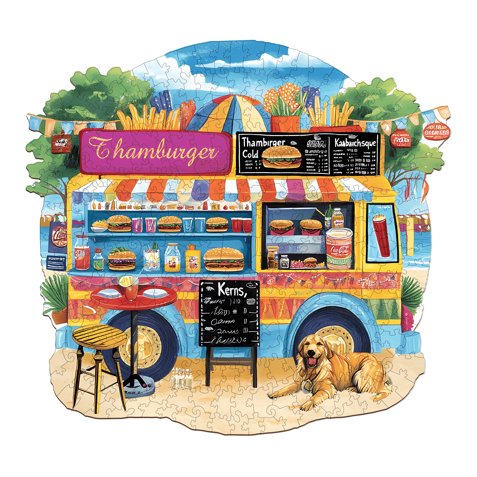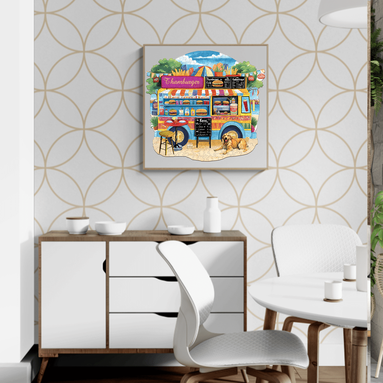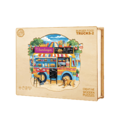 Experience the joy of puzzle-solving with our premium wooden jigsaw puzzle, “ThamBurger Fun.” This intricately detailed design showcases a colorful food truck surrounded by a delightful outdoor setting, complete with fragrant burgers, refreshing drinks, and a friendly dog. Perfect for puzzle enthusiasts, this 300-piece masterpiece provides a challenging yet enjoyable experience. Perfect for family game nights, birthdays, or as a thoughtful gift for puzzle lovers of all ages.