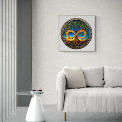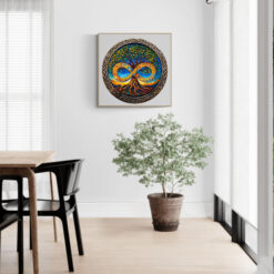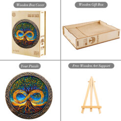 Embark on a journey of endless wonder with “The Infinite Tree of Life” wooden jigsaw puzzle by Kaayee. This captivating circular puzzle beautifully merges the ancient symbol of the Tree of Life with the eternal sign of infinity, creating a truly unique and meaningful piece of art.The vibrant imagery depicts a majestic tree with sprawling roots firmly grounded and branches reaching towards a starry sky, all interwoven to form the graceful loop of the infinity symbol. Rich hues of blues, oranges, and golds radiate from the puzzle, creating a mesmerizing visual experience that evokes growth, connection, and eternal cycles. The outer border features an intricate Celtic knot design, adding another layer of timeless symbolism and artistic detail.