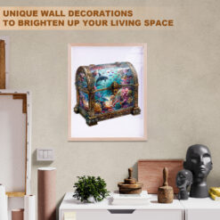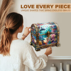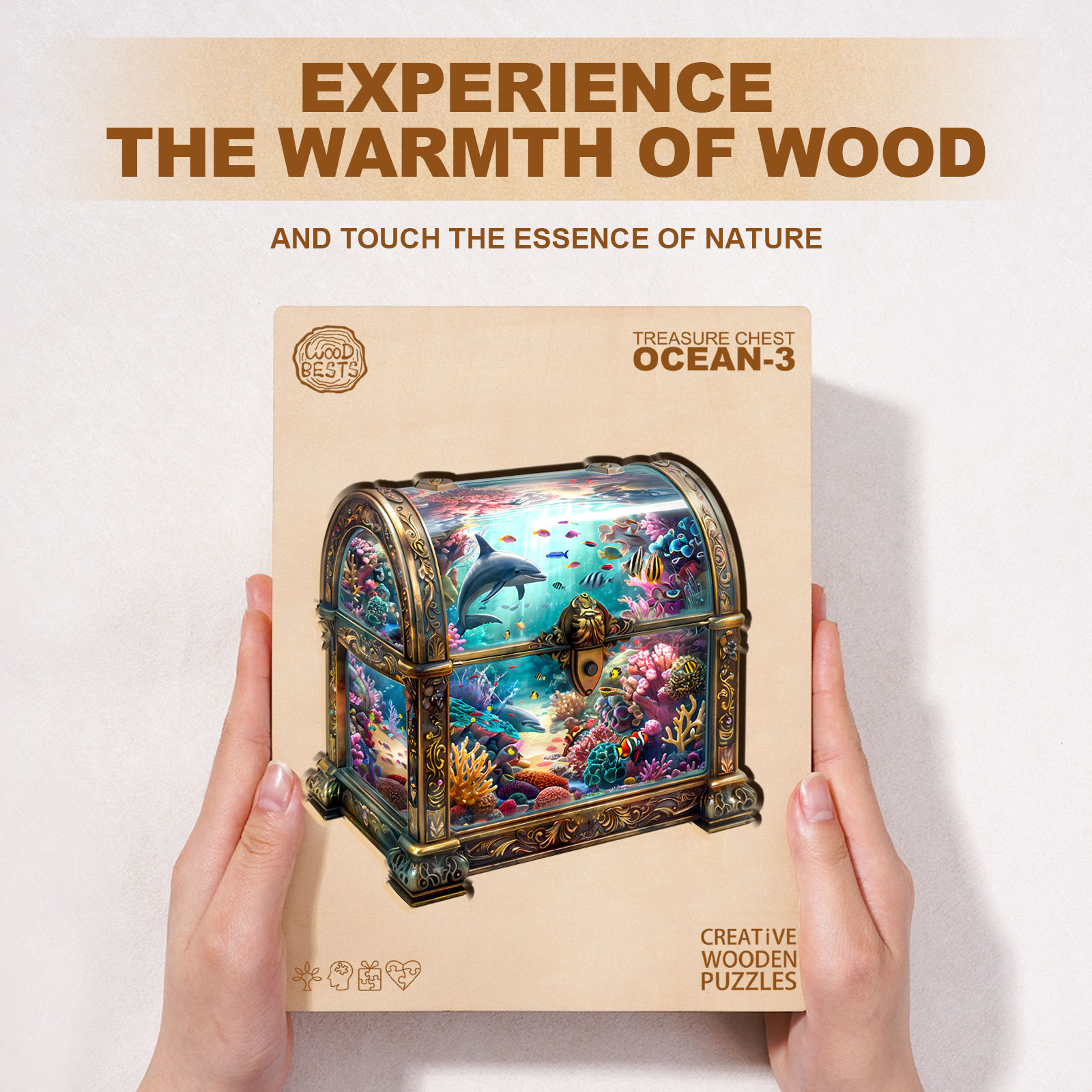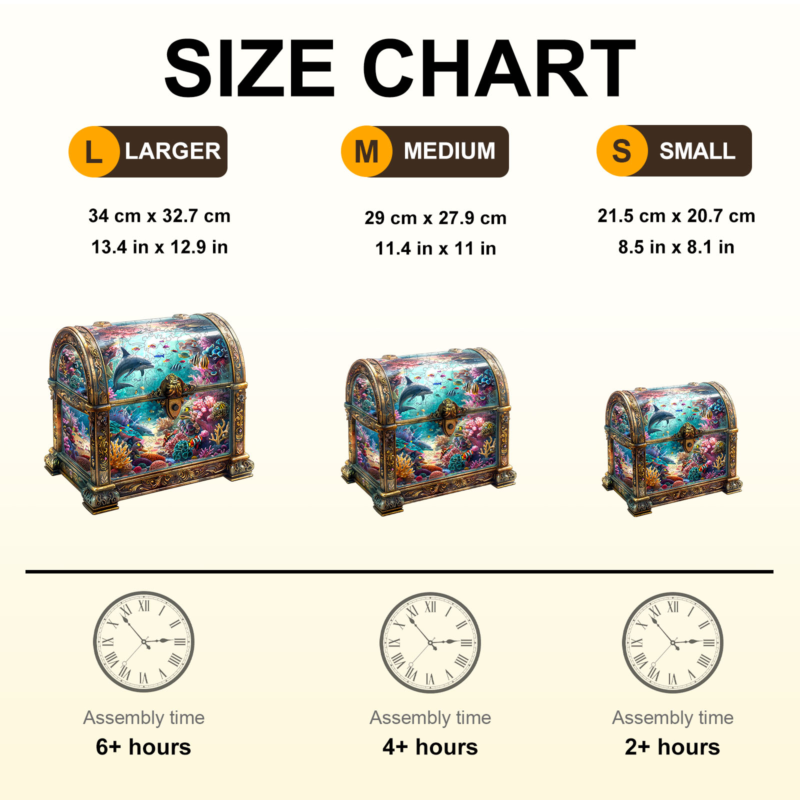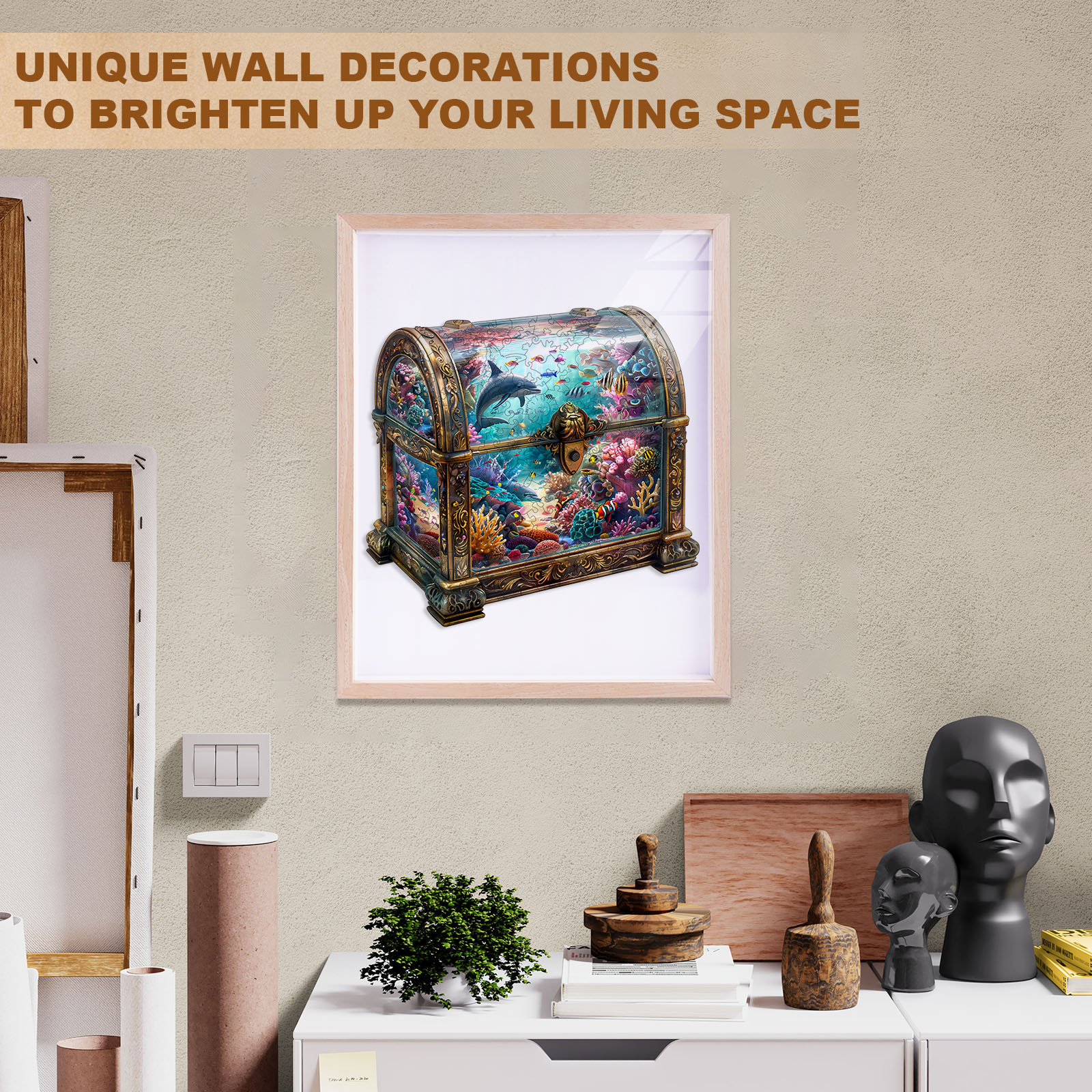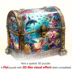 This captivating treasure chest-shaped wooden puzzle from Kaayee is a true work of art. The puzzle forms the “glass” panels of a beautifully ornate, vintage-style chest, revealing a vibrant underwater world within. The intricate scene is bustling with life, featuring a playful dolphin, schools of colorful tropical fish, and a stunningly detailed coral reef in a variety of brilliant colors. The golden, antique look of the chest itself is a part of the puzzle’s design, making it a unique and challenging piece. This high-quality wooden puzzle is an exquisite decorative item once completed, perfect for marine life enthusiasts and collectors.