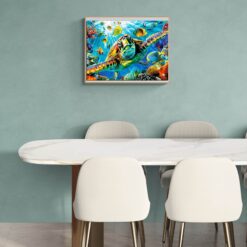 In the azure depths of the ocean, a sea turtle glides gracefully, its flippers moving with serene precision. Sunlight filters down in shimmering beams, illuminating a vibrant underwater world. Schools of colorful fish dart around the turtle, creating a mesmerizing dance of motion and color. The water is alive with the flicker of silver scales and the gentle sway of seaweed. In the distance, the silhouette of a coral reef can be seen, teeming with marine life. The sea turtle navigates this aquatic paradise with ease, embodying the tranquil beauty and timeless rhythm of the deep sea